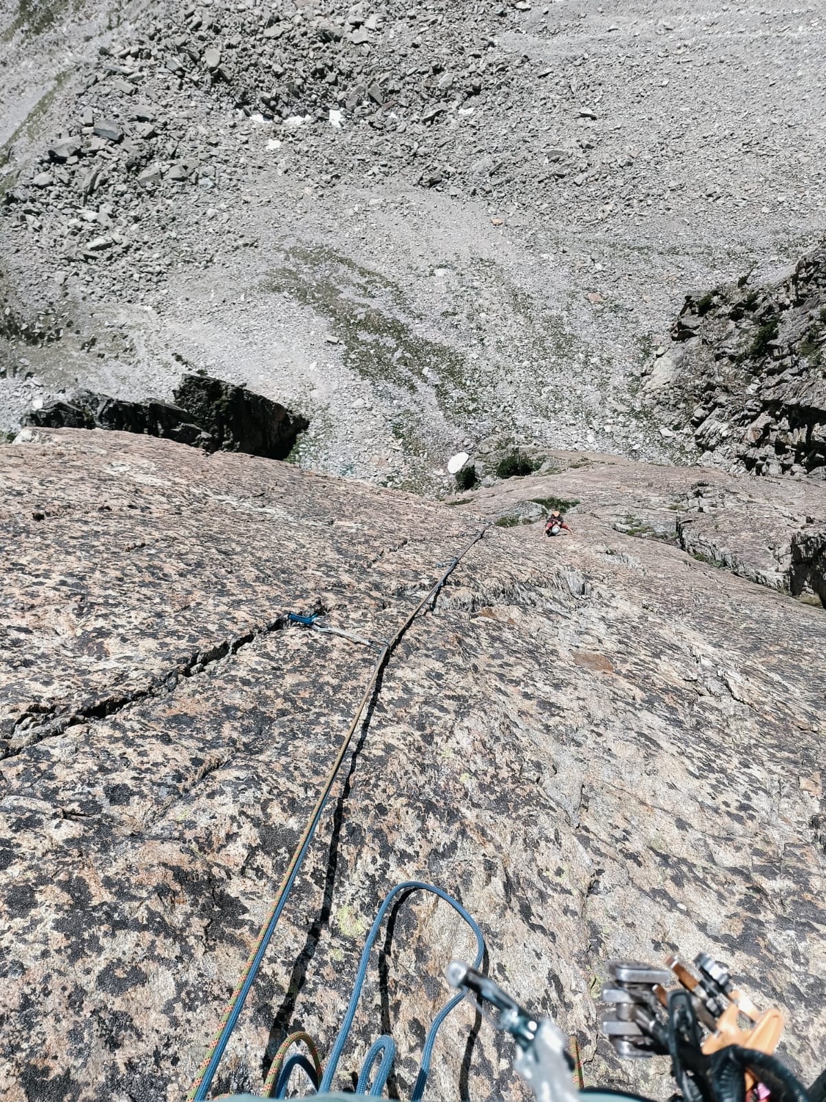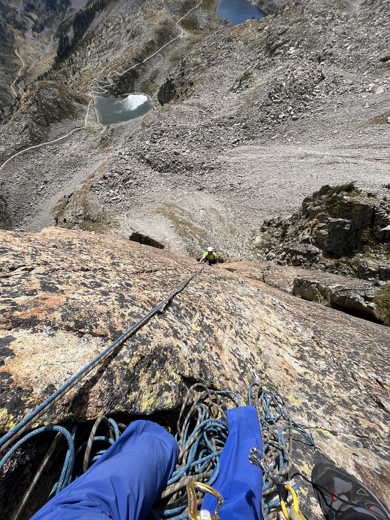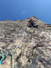 - L6) 5a diedro poi rampa verso destra, sosta dietro lo spigolo, 25 m (possibile unirlo al successivo)