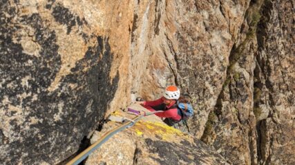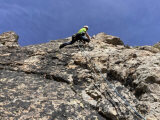 Dalla cima, con attenzione, si raggiunge il colletto, L5 parte 10 mt a destra su un caratteristico muro articolato, 30 mt