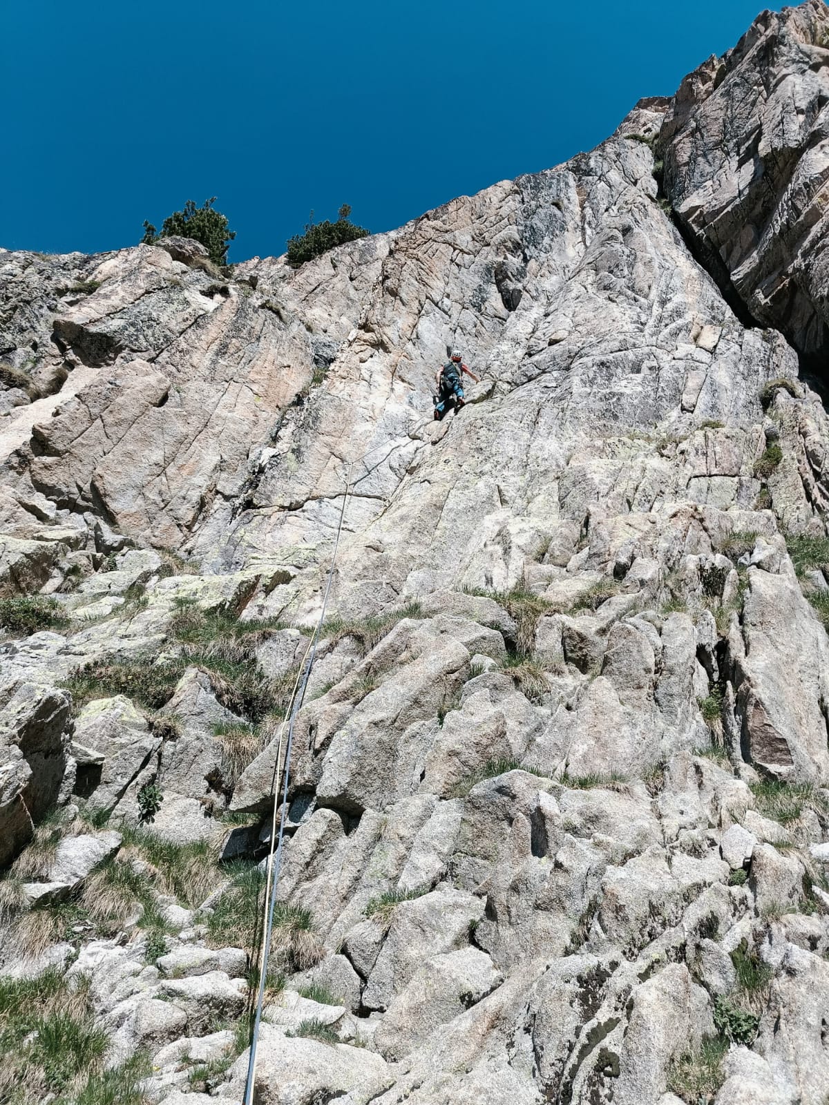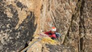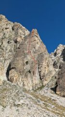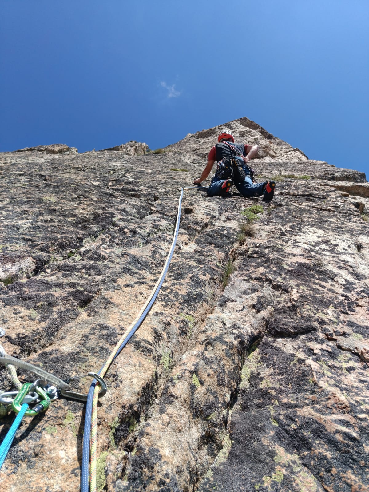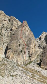 - L1) 5c+ diedro aperto verso destra, muro aggettante a buone prese poi pilastro, 50 m