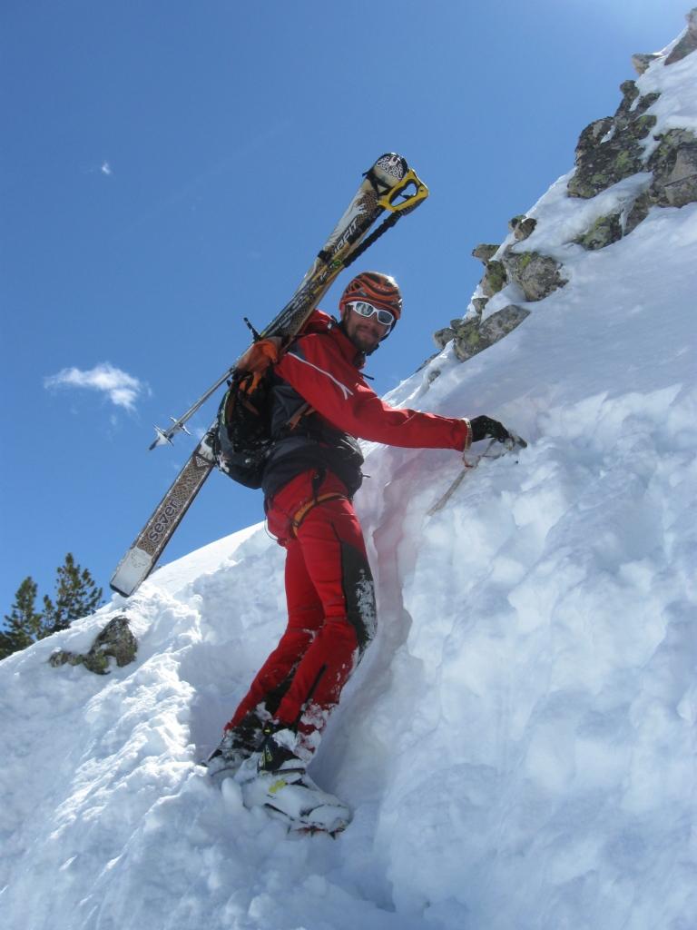 La mattina alle sette siamo già sul sentiero. Tanti dubbi nella testa ci confondono e ci fanno sbagliare bivio. Putain! Torniamo indietro incavolati pensando di arrivare troppo tardi e bruciare così i nostri sforzi. Io inserisco il turbo, Alain patisce il caldo e tracheggia dietro di me. Andiamo sotto poi valutiamo. Non sappiamo neanche se c’è il passaggio. Almeno ci togliamo il dubbio. Arrivati sotto il pendio vediamo subito dove passare…la neve sembra a posto. La parete è meravigliosa. Vista da sotto è impressionante.Sospesa sopra una barra rocciosa. Incredibile. Ci affrettiamo a salire. Troppa la curiosità di sapere come sarà la neve. In basso perfetta. Superiamo il tratto di dry non difficile e siamo in parete. Increduli calpestiamo farina addensata e ben assestata. In alcuni tratti è proprio un sottile strato con sotto neve dura. Alain galvanizzato traccerà gli ultimi 100m. Io nelle retrovie a gestire i crampi.