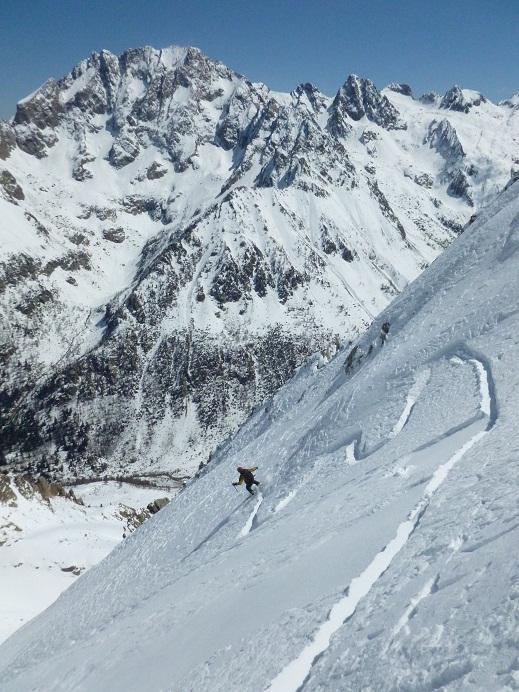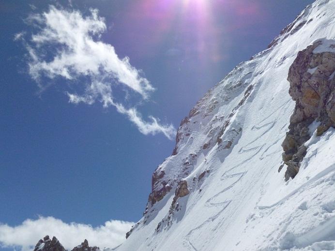 In vetta l’emozione è grande. Non ci sembra vero…Partiamo e inanelliamo curve morbide su neve che concede molto. Si deve stare attenti perchè in qualche punto, insidiose sotto la neve, affiorano le rocce. Ci portiamo al traverso che porta al tratto di misto. Cambio veloce e in dieci minuti siamo sci ai piedi. Ancora curve da ricordare…poi ci buttiamo al sole su una roccia. Alain scatenato sale su verso il colle per godersi la “cucitura”, io esausto mentalmente guardo la parete da sdraiato.Bianca, nel blu con le nuvole chiare che corrono veloci…