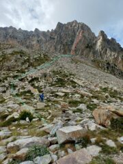 Ora per pietraie e prati avviarsi verso la base della parete.(30 minuti circa dal sentiero)