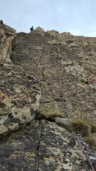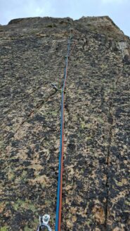 La via è rettilinea,la chiodatura è ottima e volendo si può integrare con qualche friends medio nei tratti dove si allunga.