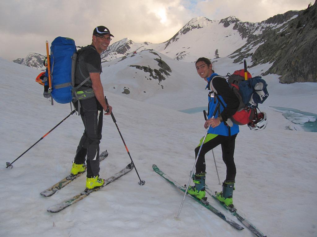 Poca neve (sci a spalle fino a 2000 m ca. in salita, ma in discesa fino a 1800 m del Piano Valasco superiore con un solo gava e buta) ma l’ambiente è sempre eccezionale.