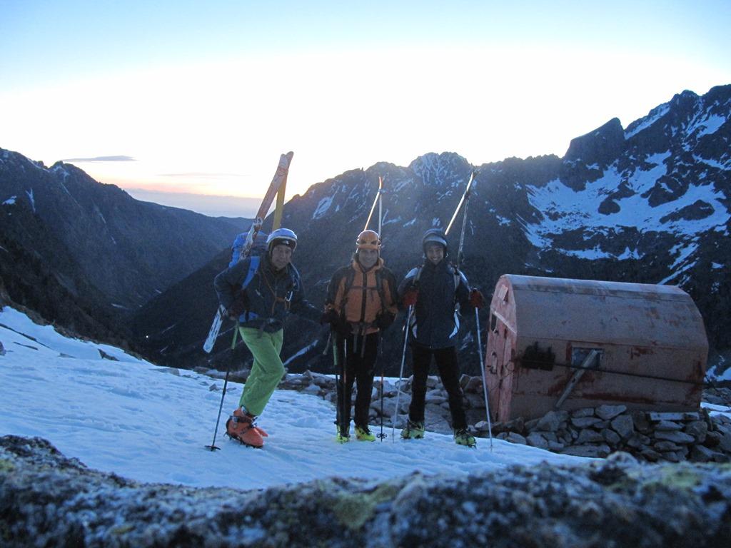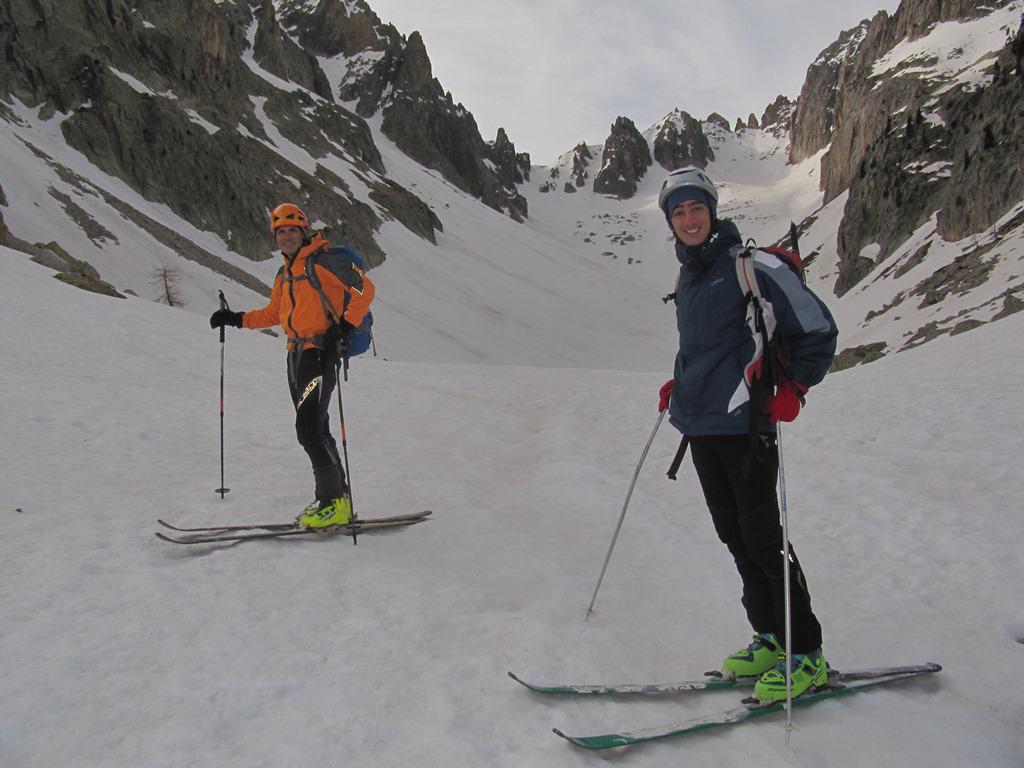 Dopo la passeggiata fino al Piano Valasco superiore, il portage continua lungo il “vallone dei morti” fino a quota 2100 m; quindi calziamo gli sci e la neve è ottima fino al colletto Valasco e poi fino al Guiglia dove con alcune scivolate e poca risalita giungiamo alle 19:45. Partenza alle 5:45 ramponi ai piedi fino in vetta (1h15′) passando dal colletto di Bresses. Calati al colle ovest di Bresses a piedi, calziamo gli sci e ci godiamo (anche se la neve è dura) la discesa fin sotto il colle Prefouns che raggiungiamo con una breve risalita di 10′. Alle 09:00 ripartiamo e, su neve dura in alto e molle in basso raggiungiamo il ponte sci ai piedi (1 solo gava e buta). Non durerà molto la neve; già nel canalone di Prefouns era al limite per riuscire a passare il torrente nella strettoia a metà. Ricalziamo le pedule e in 45′ siamo alla macchina.