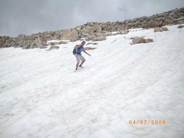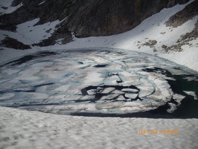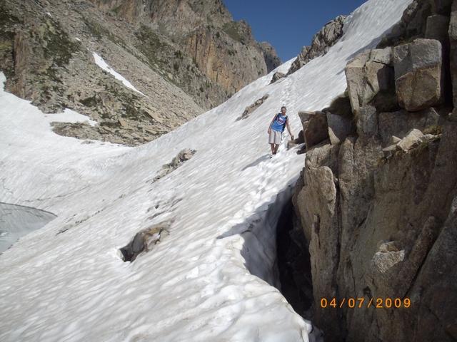 saliti dal sentiero che sale dal Gias delle Mosche, ponte spezzato ed inutilizzabile, per il momento si attraversa su neve poco sopra, poi qualche ripido nevaio da aggirare per non rischiare, quindi ancora tanta neve in alto ma che non da più noia.