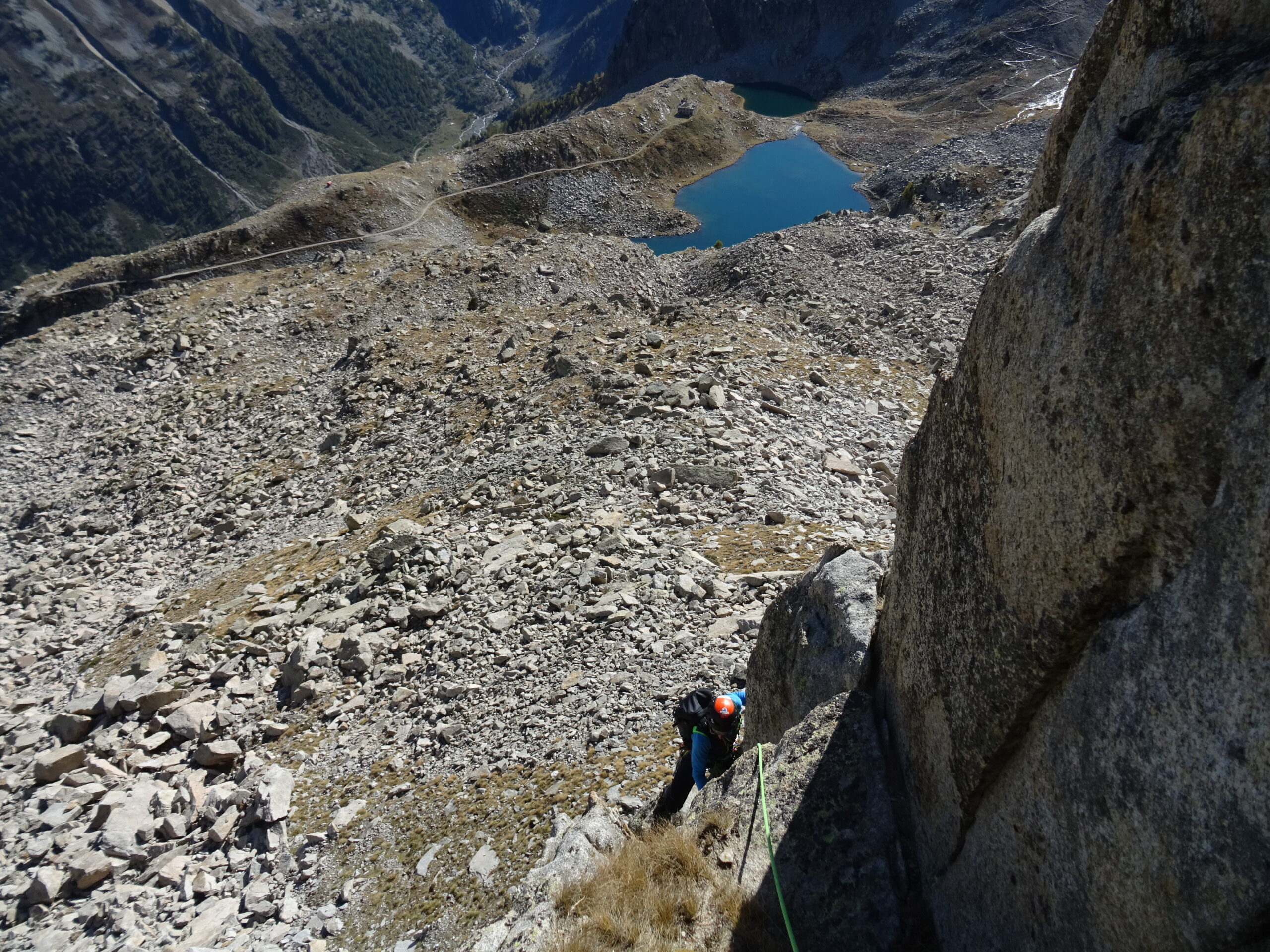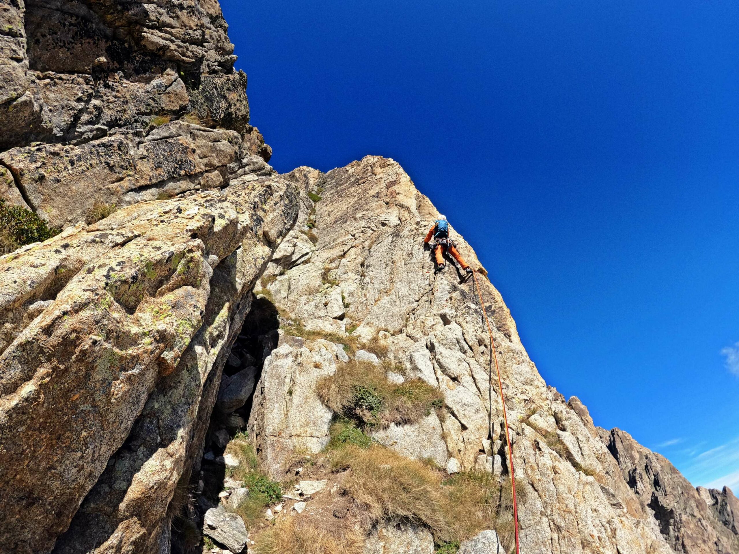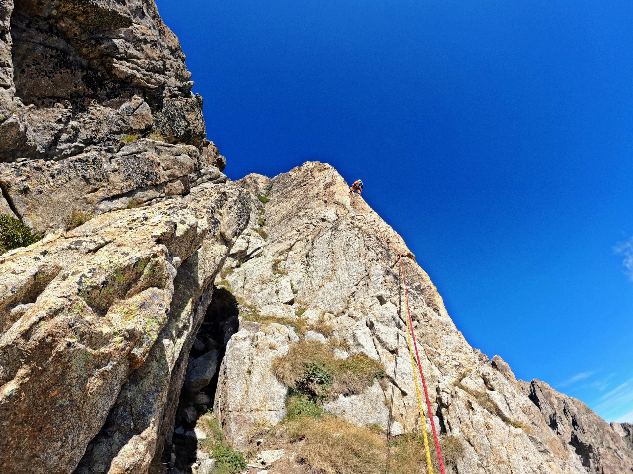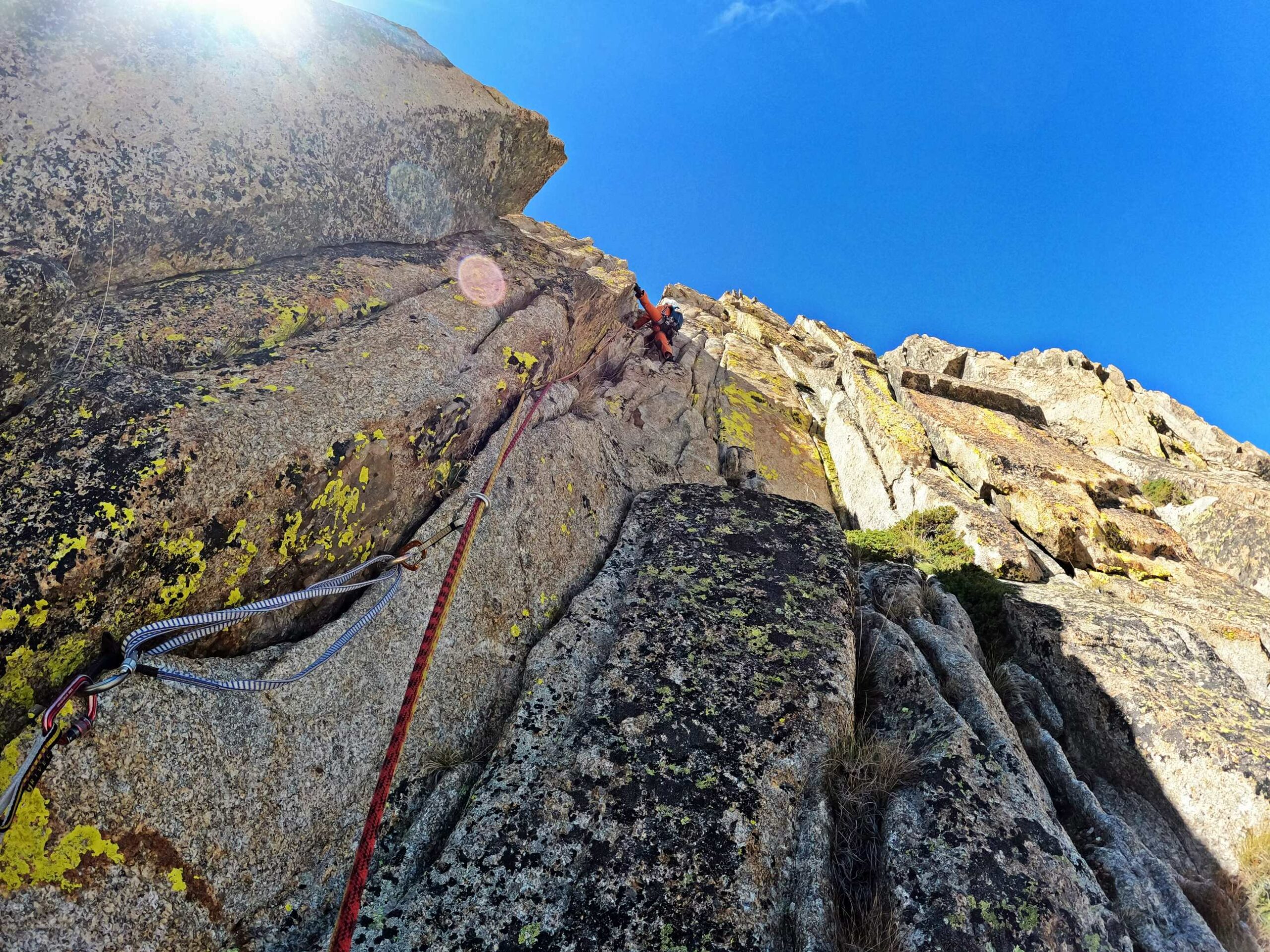L4: salire sopra la sosta, quindi spostarsi debolmente a dx proprio sotto il muro col lichene giallo, superare un breve diedro (ch.), IV+, uscendo a sinistra continuare sullo spigolo, superare a dx una breve fessura-camino, IV, e continuare per cresta meno difficile, III+. 30m, sosta da attrezzare