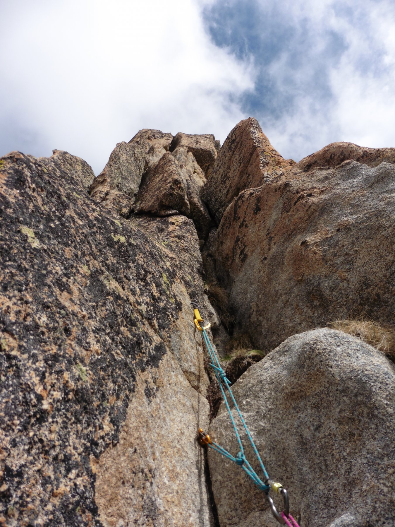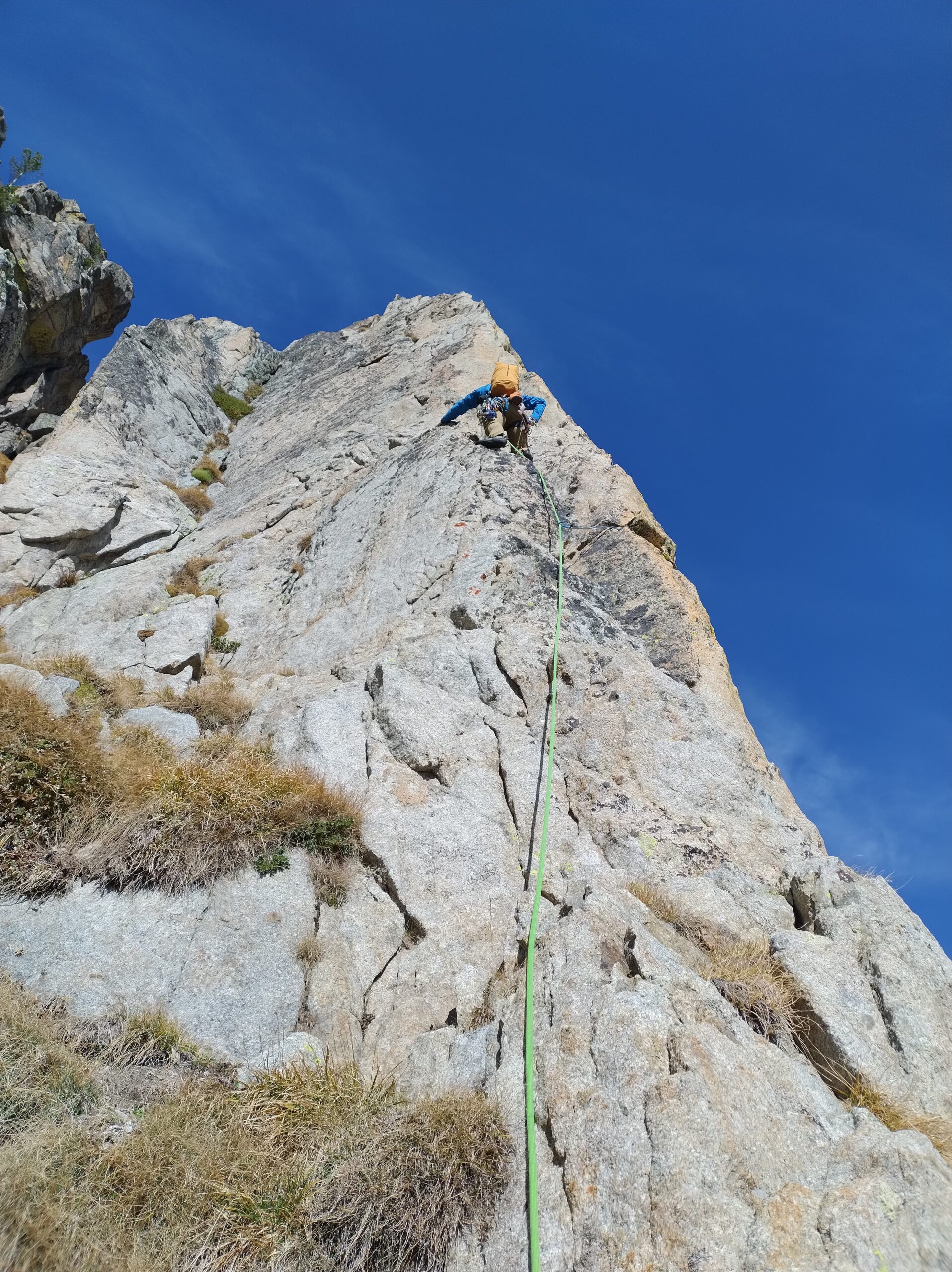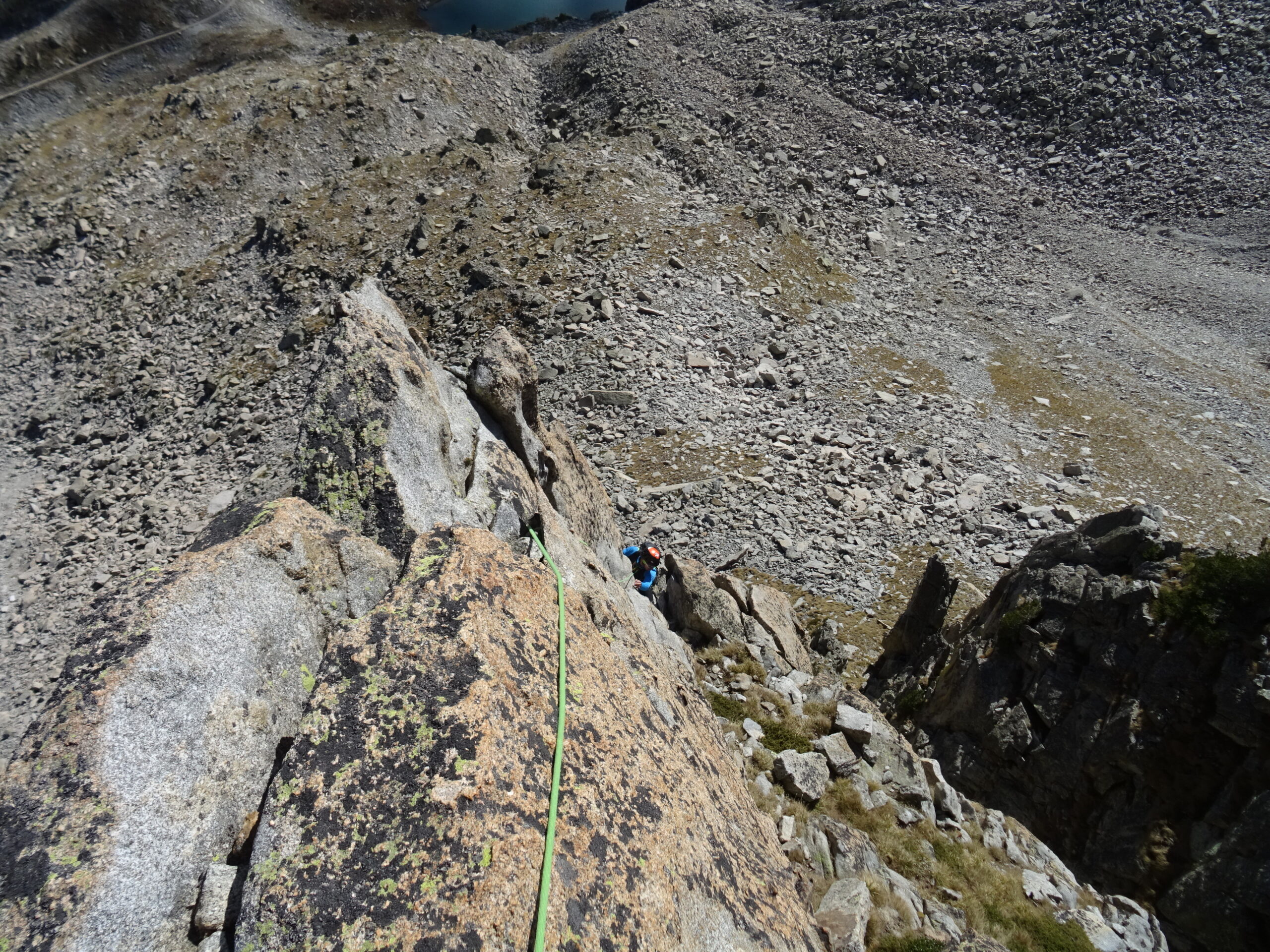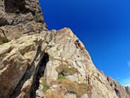 L4: salire sopra la sosta, quindi spostarsi debolmente a dx proprio sotto il muro col lichene giallo, superare un breve diedro (ch.), IV+, uscendo a sinistra continuare sullo spigolo, superare a dx una breve fessura-camino, IV, e continuare per cresta meno difficile, III+. 30m, sosta da attrezzare
