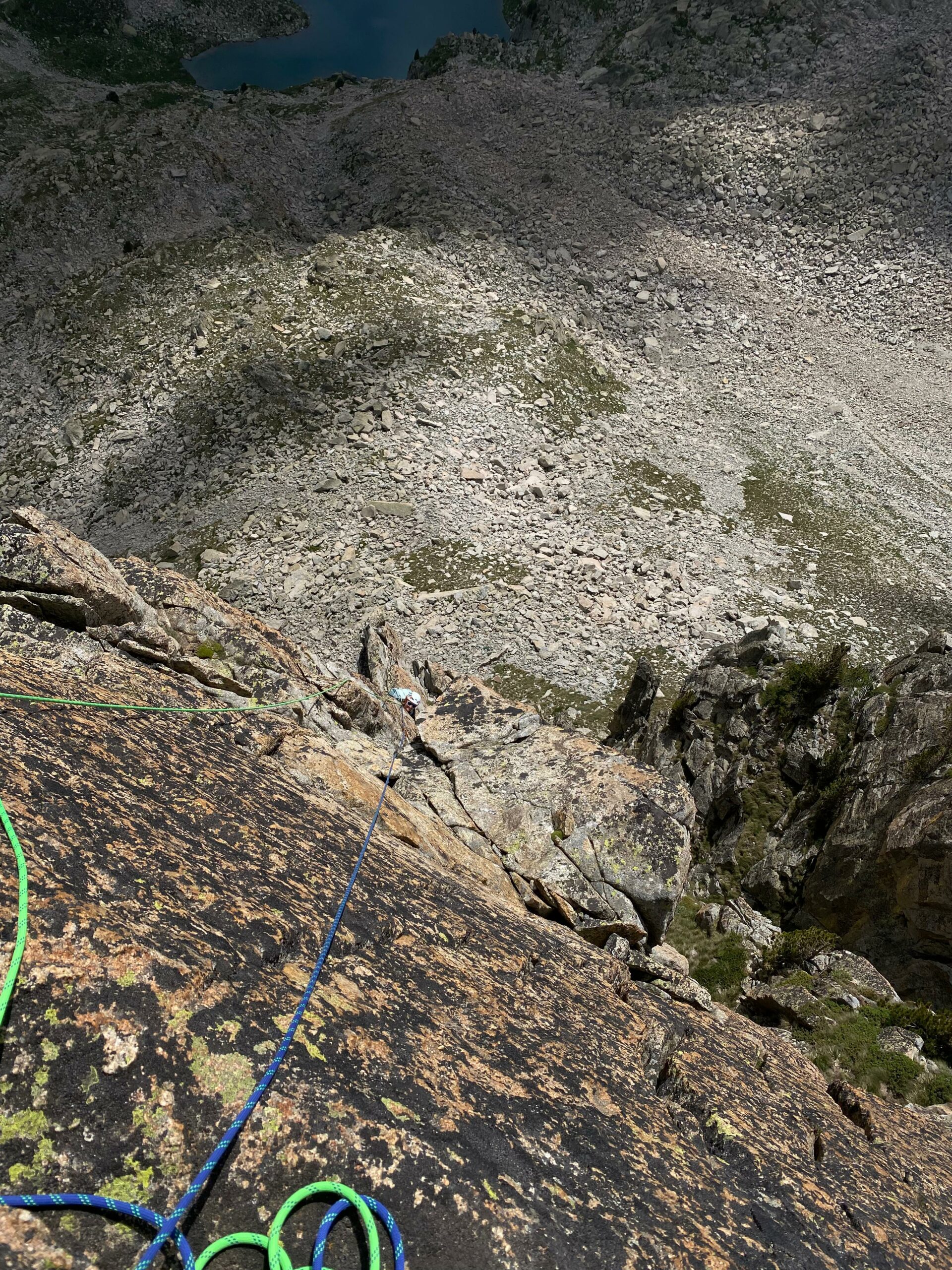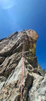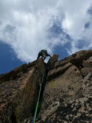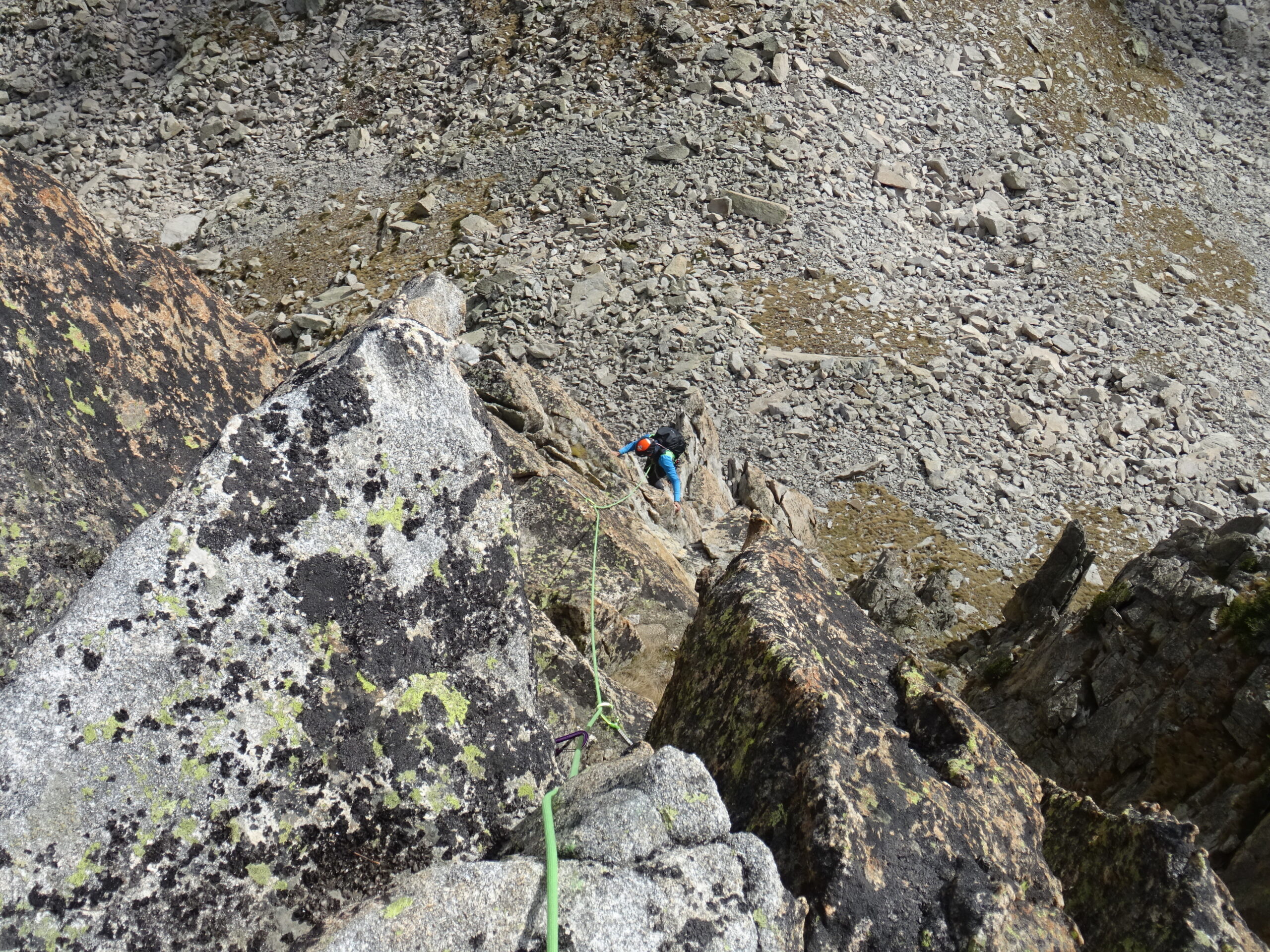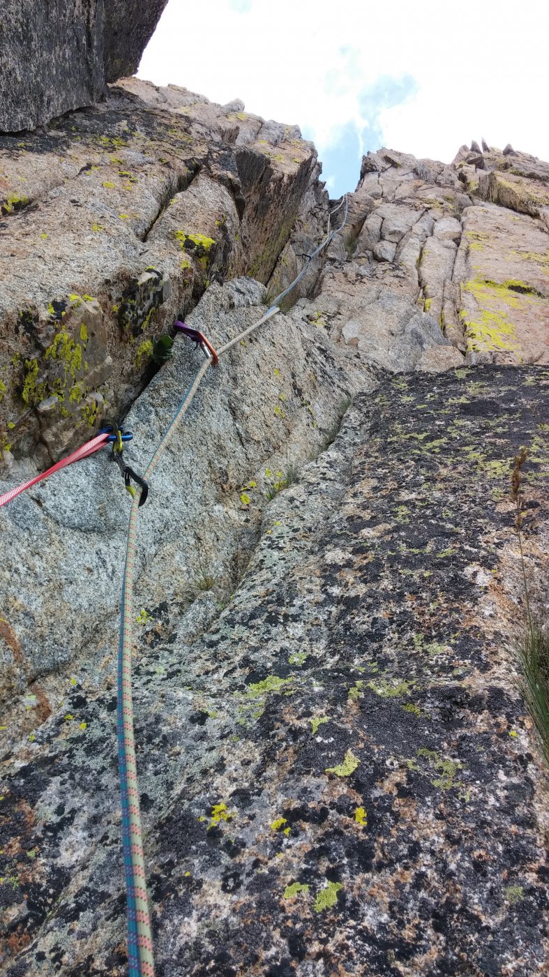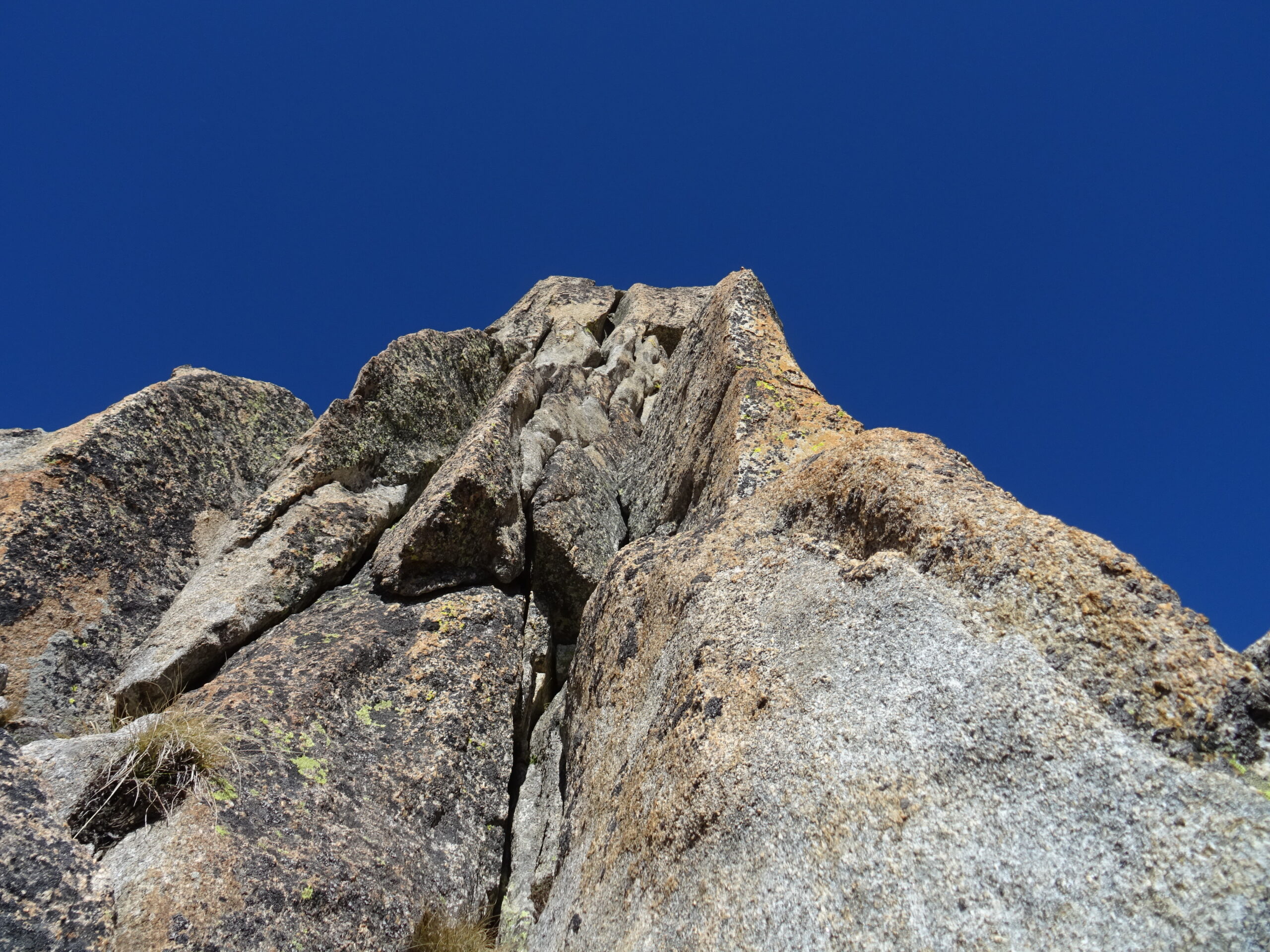 L4: salire sopra la sosta, quindi spostarsi debolmente a dx proprio sotto il muro col lichene giallo, superare un breve diedro (ch.), IV+, uscendo a sinistra continuare sullo spigolo, superare a dx una breve fessura-camino, IV, e continuare per cresta meno difficile, III+. 30m, sosta da attrezzare