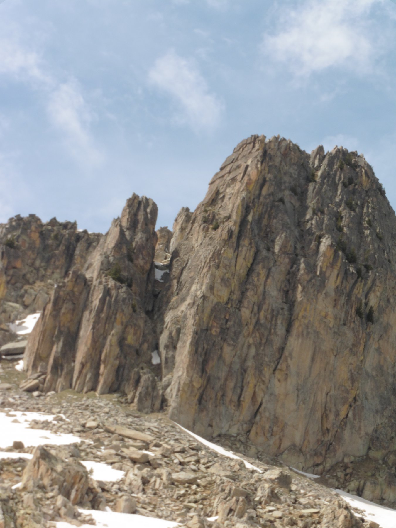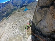 L3: primo tratto facile sul filo, III, poi si imbocca un camino sulla dx, IV+ passo di V, fino a tornare sul filo (ch.). Qui la via storica deviava a sx sulla cengia per poi tornare sul fino a dx di un becco sporgente, IV; in alternativa dalla cengia si può proseguire sul filo in placca delicata (passo di V+ in partenza, poi V) e poco proteggibile. 35m