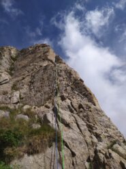 L2: salire lungo il diedro-camino (ch.) e superare un leggero strapiombo, IV+/V, poi su dritti (ch. poco visibile) fino a riprendere lo spigolo a sx, IV, si raggiunge così una cengia erbosa e si continua sullo spigolo aereo fino ad un diedro ove si sosta, IV. 30m