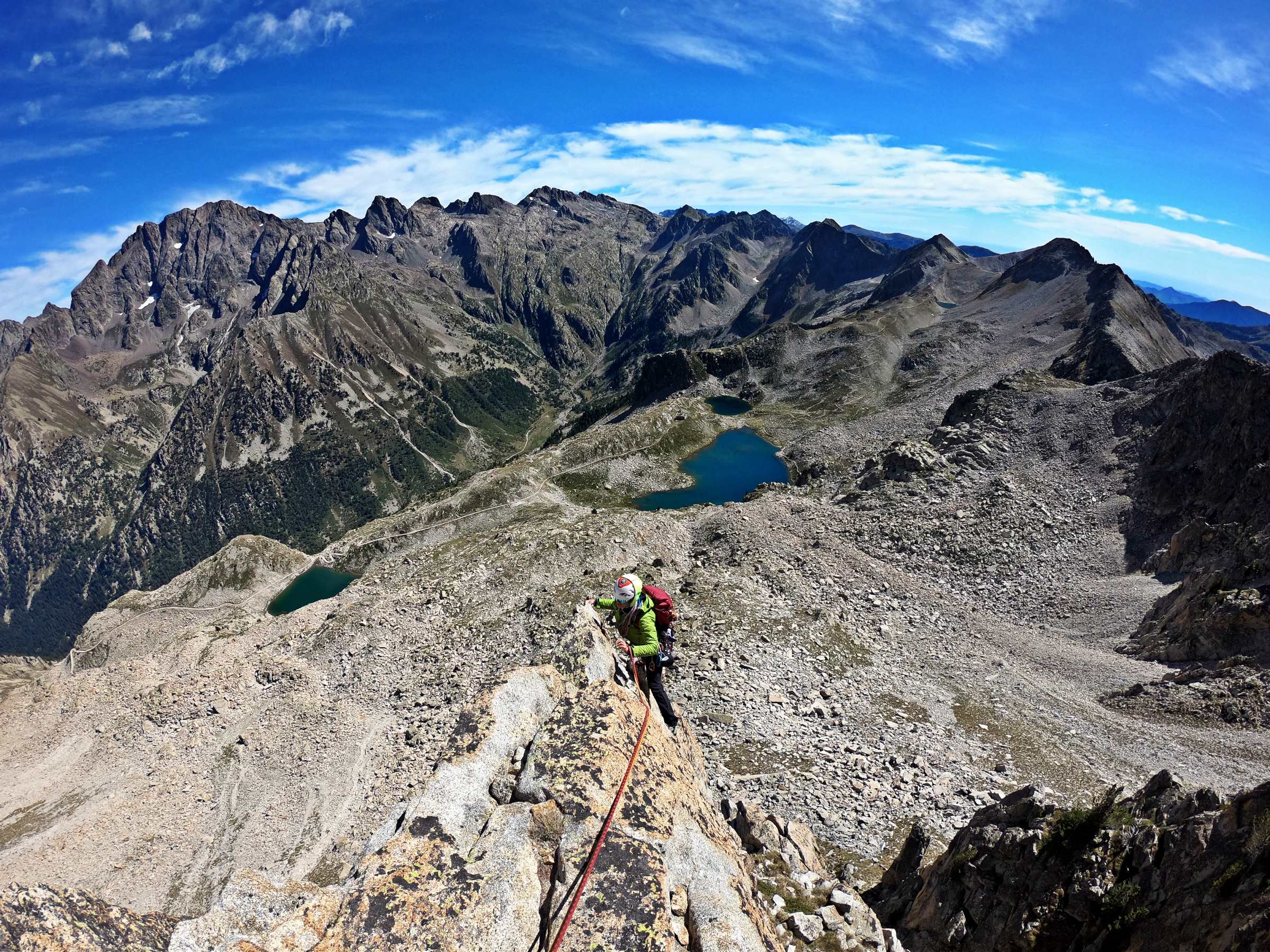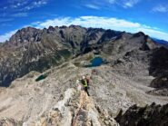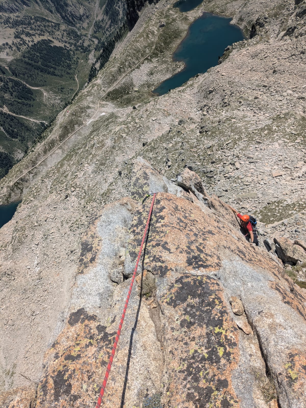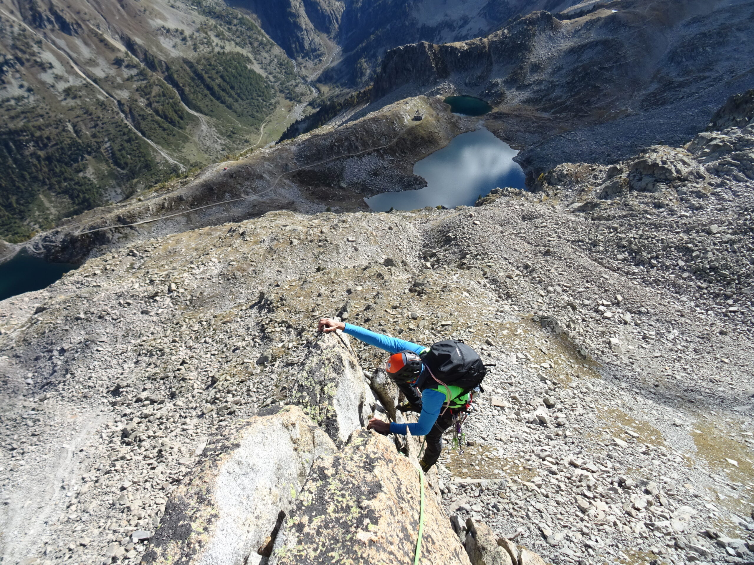 Si prosegue ora in conserva lungo la cresta: ci si sposta verso dx, si effettua un traverso esposto (nut incastrato, III) risalendo poi appena possibile verso sx per riprendere il filo in un camino. Si prosegue facilmente in cresta, quindi la si abbandona verso sx fino a raggiungere la paretina finale solcate da belle fessure diagonali (III+) che in breve portano alla via Normale escursionistica, a pochi metri dalla Testa Sud di Bresses.