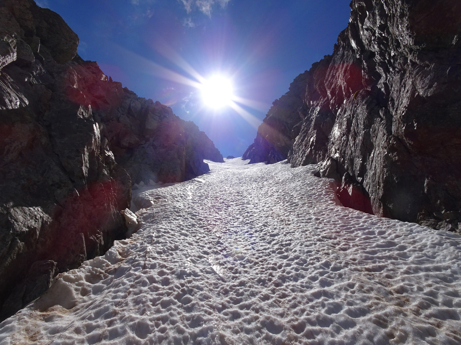 Nonostante il caldo dell’ultimo periodo e la penuria di neve rispetto ad altri anni le condizioni generali sono buone e il canale ovest è ancora completamente innevato. Per l’avvicinamento noi abbiamo seguito per un tratto il sentiero per il colle del Mercantour e poi siamo saliti a naso fino alla conoide, ma forse conviene passare dal Remondino e seguire il sentiero per il colle di Brocan e poi scendere fino all’imbocco del canale seguendo la traccia per il colle del Mercantour. Per la discesa siamo passati dalla cresta nord nel primo tratto quindi dal versante NO ancora ben innevato nella parte basale (numerosi ometti). Neve quasi continua fin sotto il Lago di Nasta a 2650m, non rigelata ma portante.