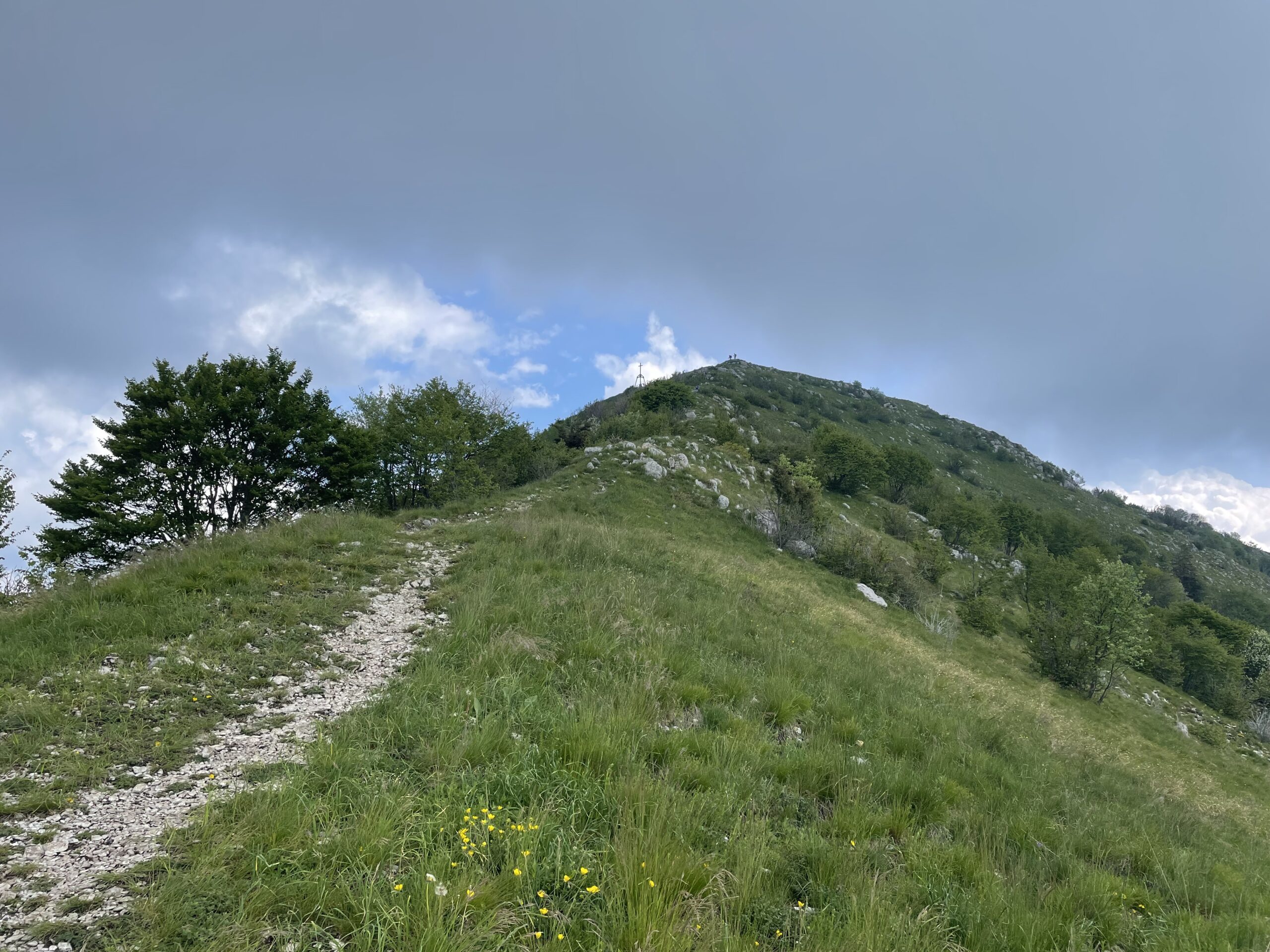 Dalla Vetta 1334m, con bellissima campana, si prende il 701, si puo’ percorrere il sentiero che passa sotto cresta, oppure percorrere un tratto di cresta SW, segni gialli, che poi si ricongiunge col sottostante sentiero.
