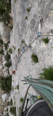- L4 traversare a sx superare una strozzatura su piccoli appigli e poi per rampe e fessure alla sosta 25m 6b+
