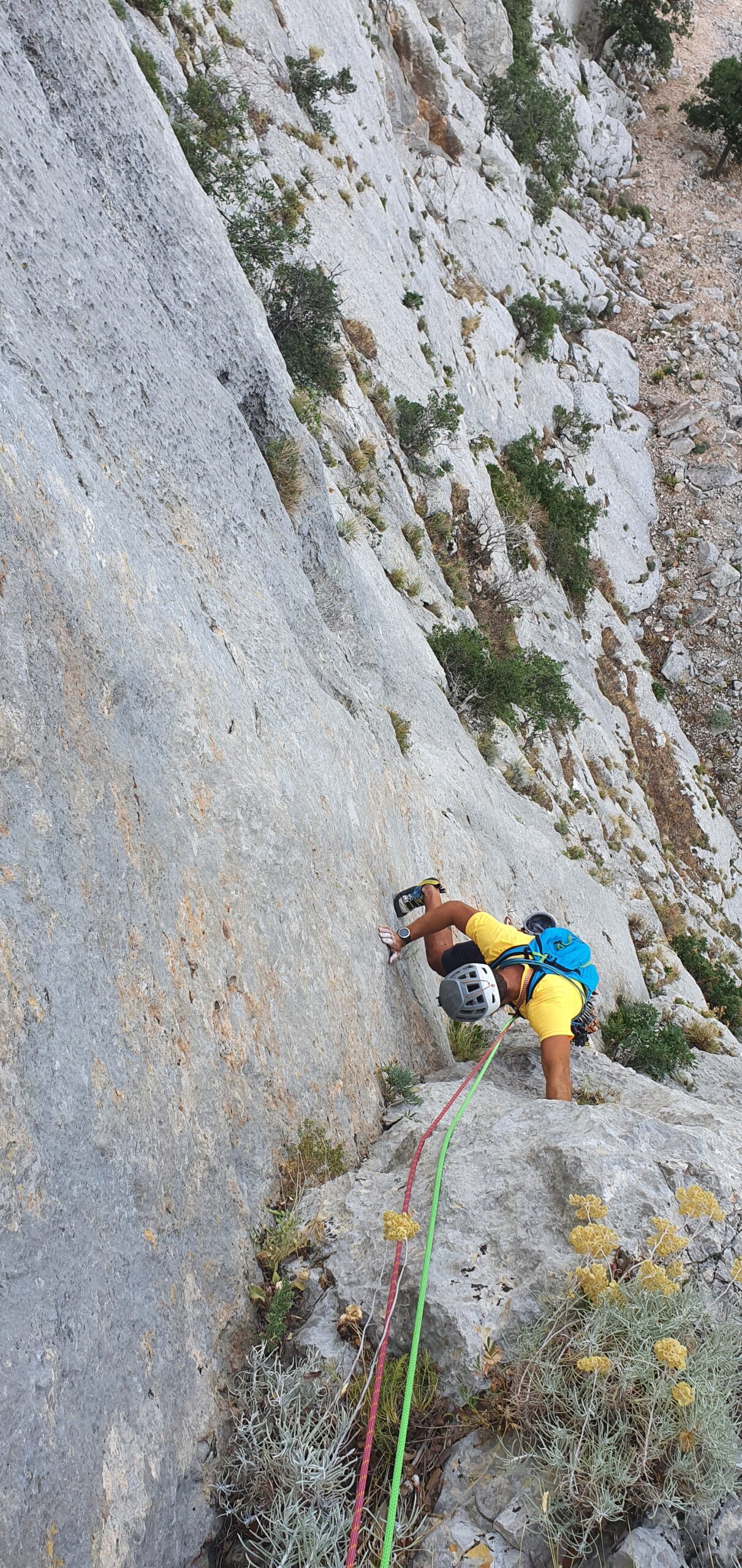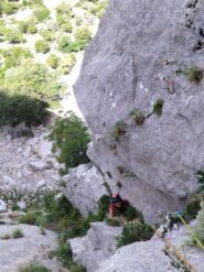 - L6 appena a destra della sosta a prendere una fessura discontinua molto bella che con passaggi tecnici porta alla sosta quasi al termine della placconata (molti chiodi e clessidre) 45m 6c