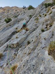 - L2 dalla sosta traversare coi piedi su cengetta erbosa per qualche metro fino all’evidentissima fessura, superarla con passaggi atletici e piedi poco evidenti fino a una sezione meno sostenuta, traversare a destra seguendo l’andamento della fessura, superare un piccolo ribaltamento (chiodo) e proseguire prestando massima attenzione a erba e roccia dubbia negli ultimi metri che precedono la sosta su due fix, cordone e maillon 30m 6b