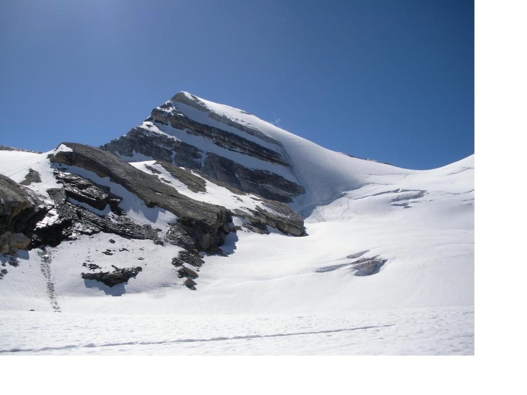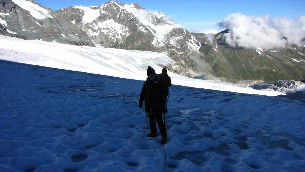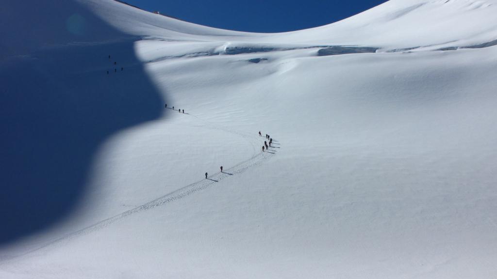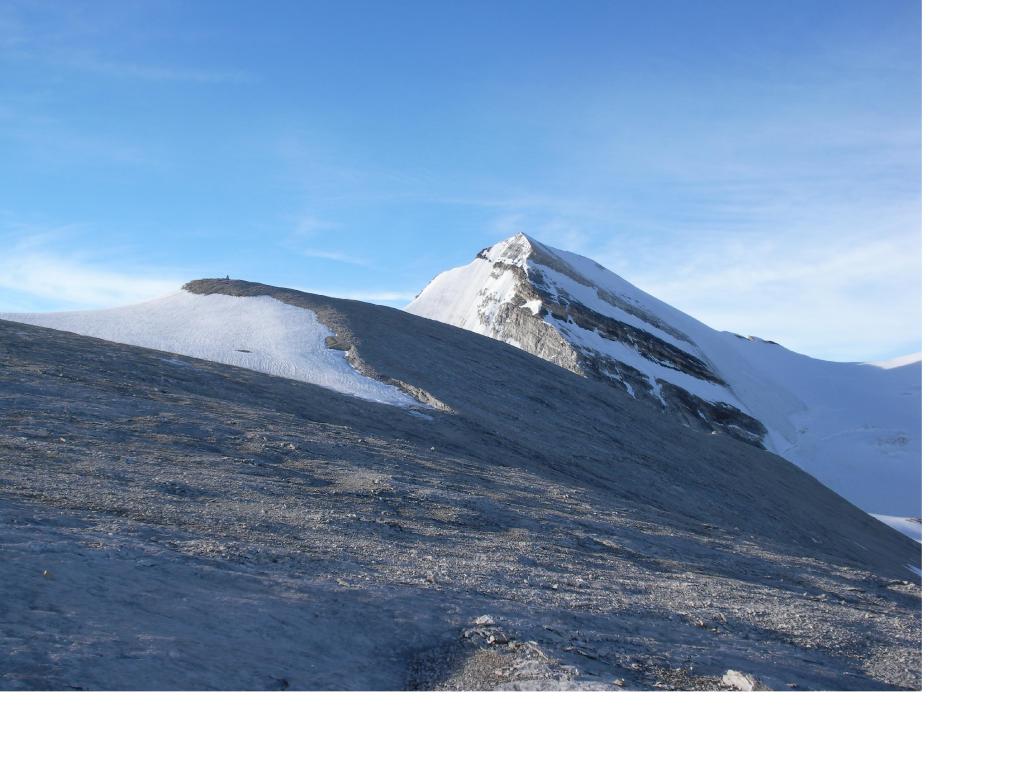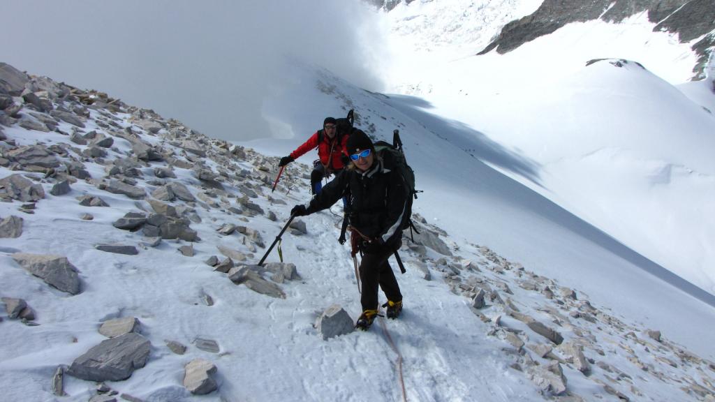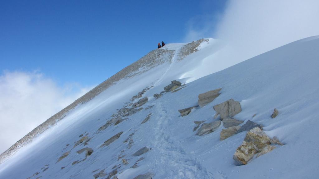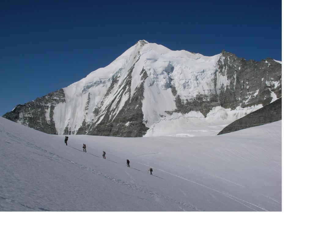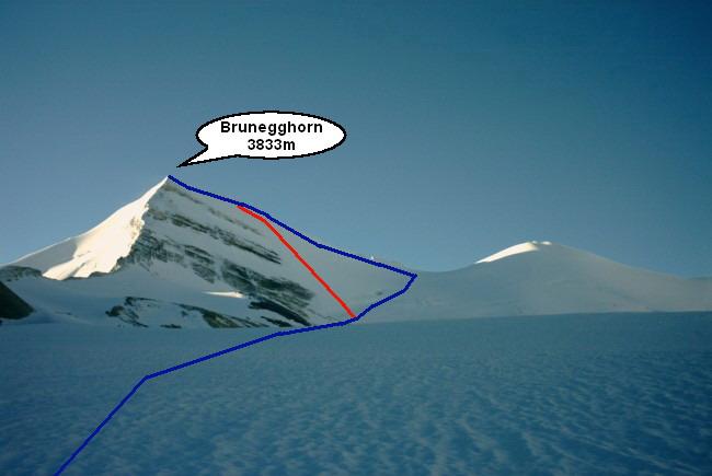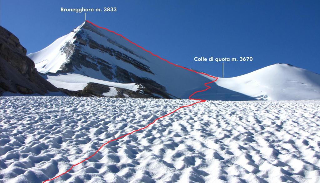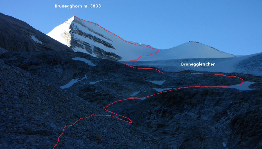 puntando ad un colletto a quota 3075 m (ometto). Da qui si mette piede sul Bruneggletscher seguendo una debole traccia su sfasciumi (2h dal rifugio). Rimontare il ghiacciaio rimanendo sulla sinistra per lungo tratto pianeggiante o in lieve salita; si attraversano due zone crepacciate, fino ad incontrare una fascia rocciosa diagonale che separa in due il ghiacciaio. Da qui piegare un po’ a destra infilandosi nell’evidente canalone che scende dal colletto 3649 m. Qui la pendenza aumenta sensibilmente, con alcuni tratti sui 35° (a fine stagione si potrebbe aprire la terminale; con alcuni zig-zag, passando a sinistra di alcuni grossi seracchi, si raggiunge l’ampio e panoramico colle alla base della cresta sulla cresta SE del Brunegghorn (il più alto e a sinistra dei due colli visibili dal Bruneggletscher). Dal colletto, piegare a sinistra in direzione della cima che si vede in fondo. Seguire quindi la larga spalla SE fino in vetta, mantenendosi sempre sul versante di Turtmann; dopo un breve tratto appena sotto il filo della cresta (attenzione alle cornici sul versante di Randa Est, talvolta ciclopiche) si risale un pendio esposto ad ovest più ripido, con alcune serpentine, per poi riguadagnare il filo della cresta dove talvolta possono affiorare roccette e sfasciumi insidiosi. Qui la cresta torna molto ampia e facile, e con pendenza ora molto dolce conduce sino in cima (croce metallica).