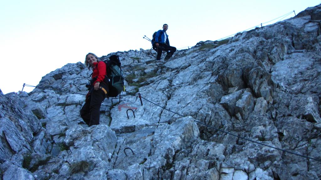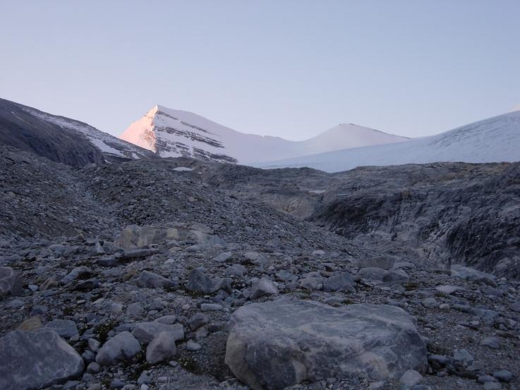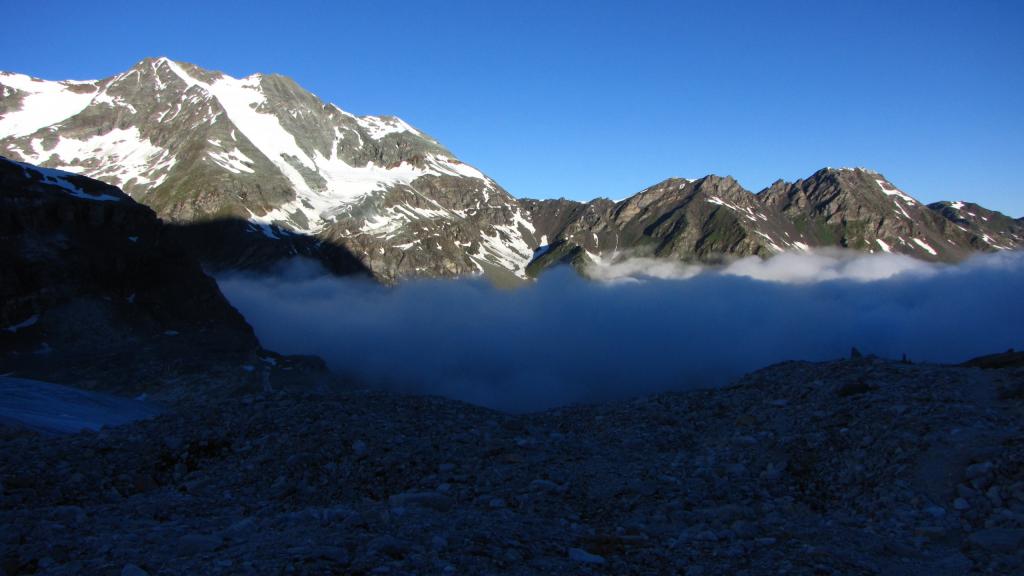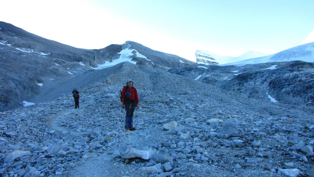 Dal rifugio prendere il sentiero segnato in direzione SE inizialmente pianeggiante, poi più ripido fino ad entrare in un marcato canale su terreno sfasciumato (potrebbe tornare utile il casco con molta gente davanti), poi piegare a destra per rimontare un ripido salto roccioso attrezzato con corde fisse. Lasciata sulla destra la traccia per la Cabane du Tracuit (scritta su un masso), giungere ad un grande ometto (visibile già dal rifugio). Proseguire su terreno meno ripido fino ad una grande morena sassosa; risalirla per lungo tratto con traccia sinuosa fino ad imboccare un canale di sfasciumi alla sinistra di un piccolo ghiacciaio. Attraversare in piano il ghiacciaio