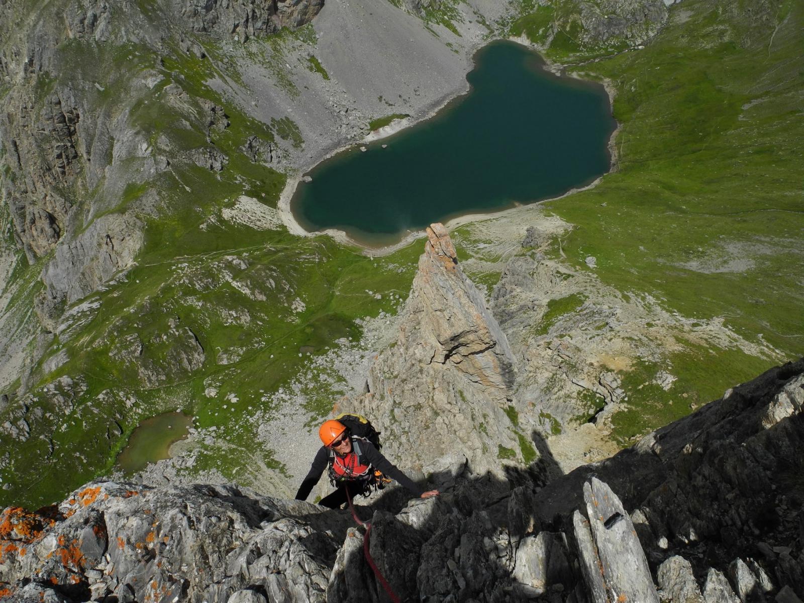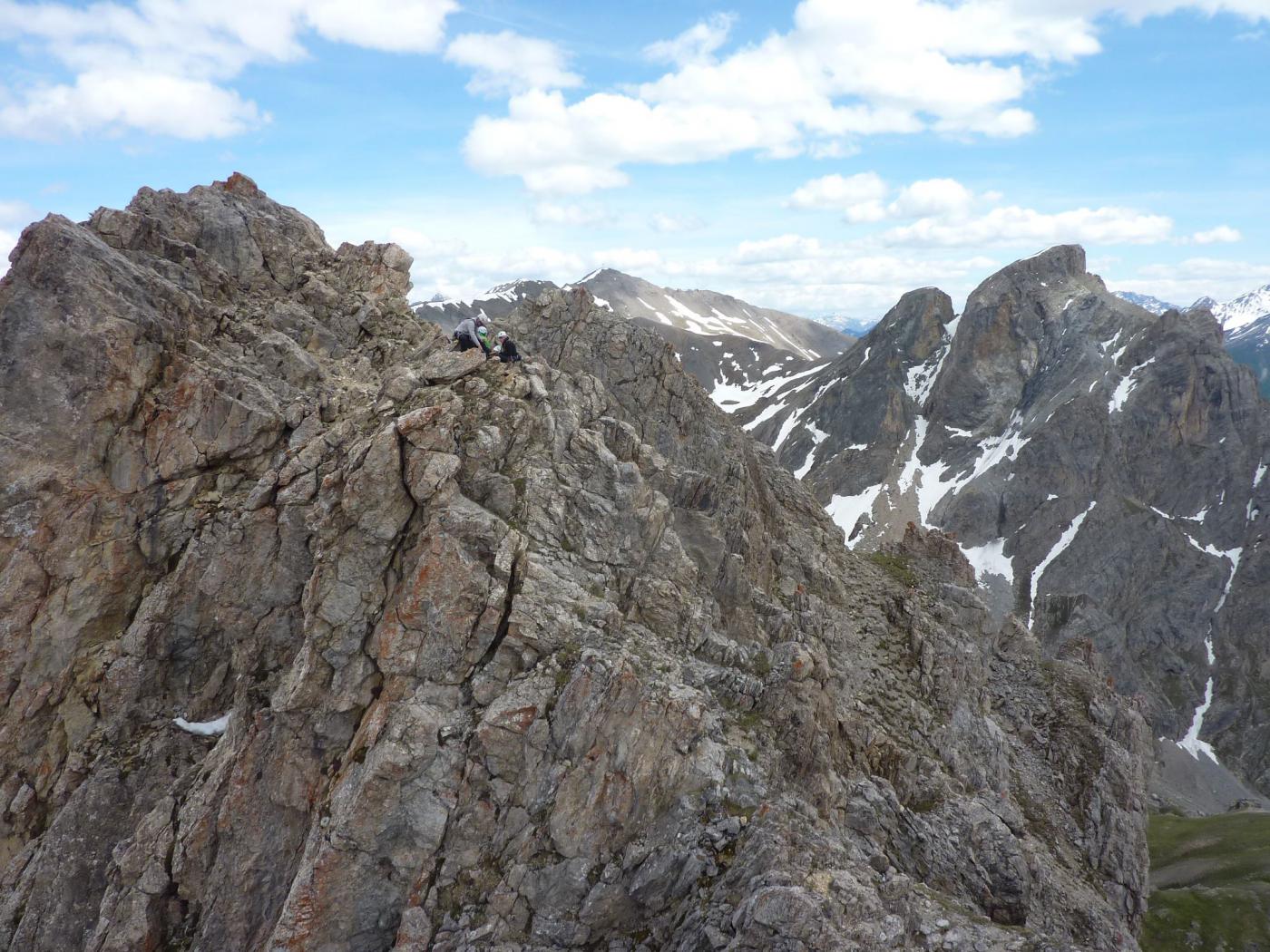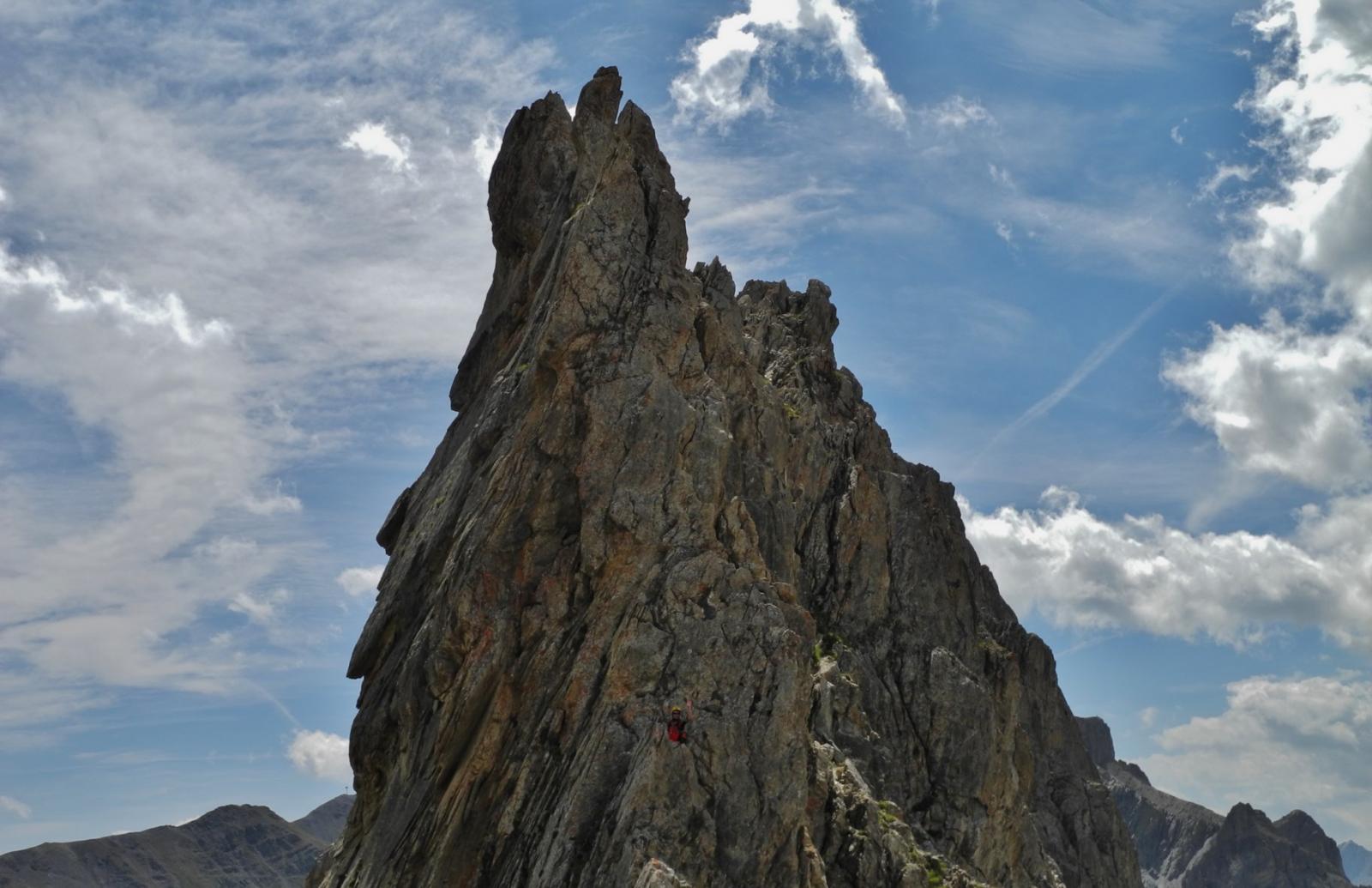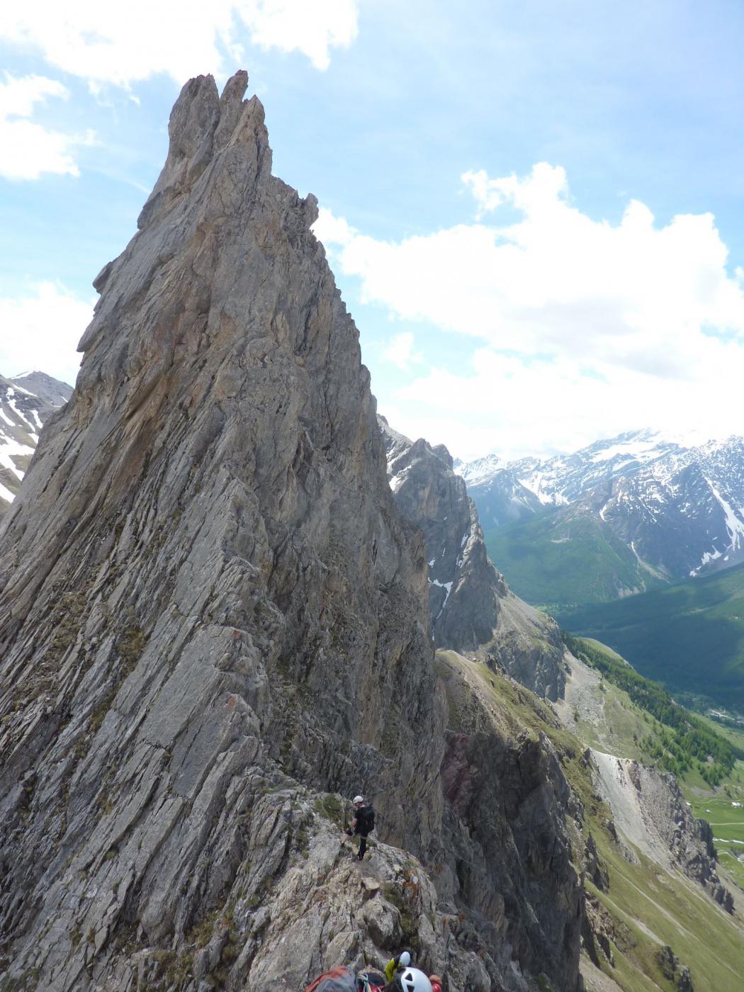 Salire il grande gendarme stando leggermente alla sua destra, lungo un risalto all’apparenza ripido ma facile (un cordone e un ch. proteggono due brevi tratti di III+). Raggiunta la cima (cordoni), scendere piegando brevemente a dx e traversando di nuovo a sx fino ad una cresta affilata. Traversare la cresta prima sul filo e poi leggermente al di sotto lato est (1 ch.) e risalire un primo risalto del torrione successivo (2 fix di sosta da collegare). Scalare il bel gendarme (IV+) e perseguire per cresta aerea fino a raggiungere una calata di 10m che deposita ad una breccia.