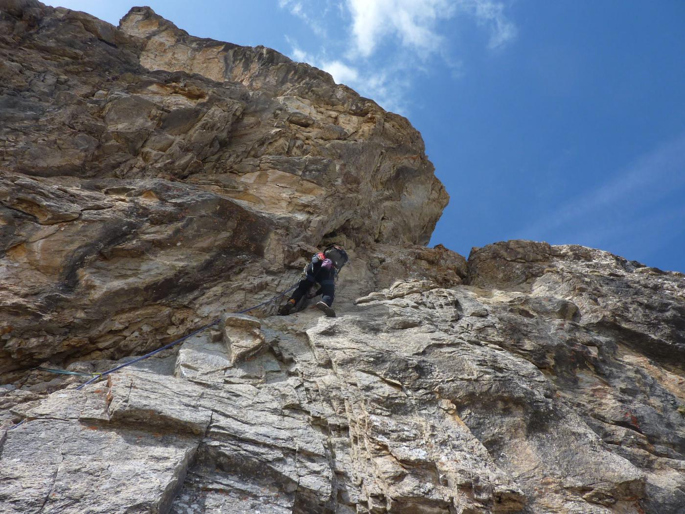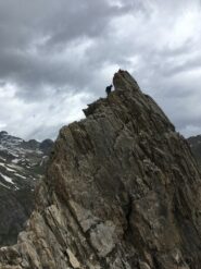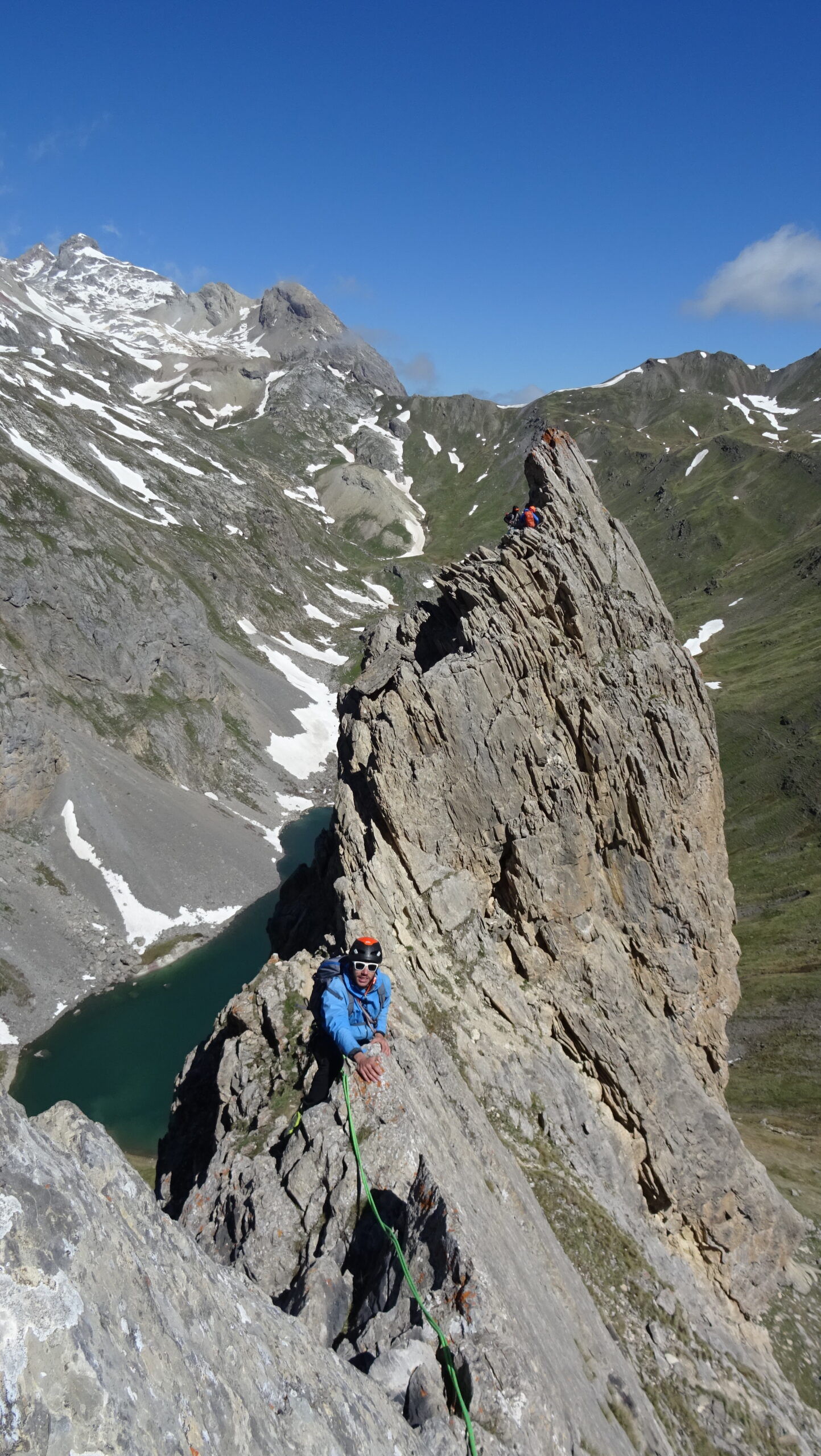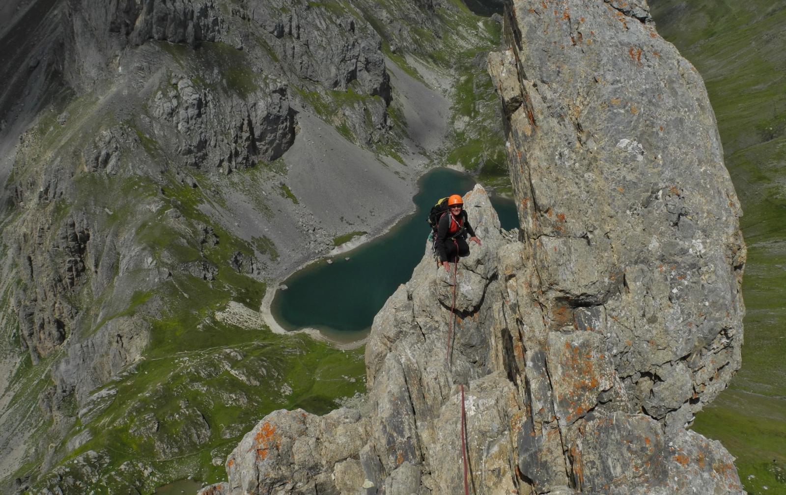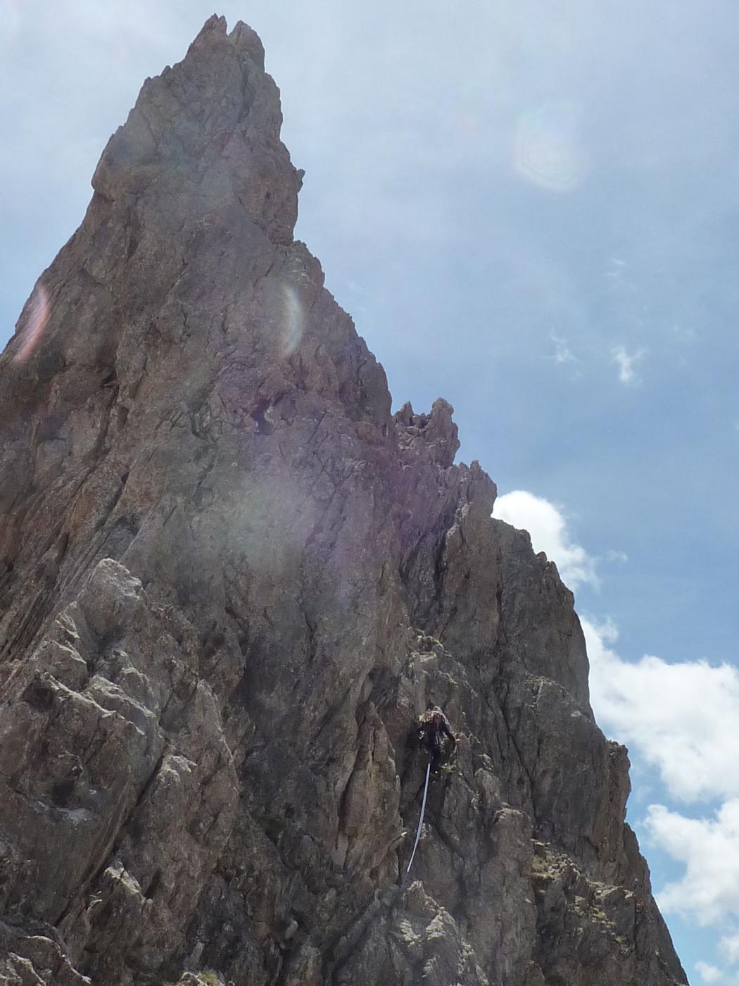 Salire il grande gendarme stando leggermente alla sua destra, lungo un risalto all’apparenza ripido ma facile (un cordone e un ch. proteggono due brevi tratti di III+). Raggiunta la cima (cordoni), scendere piegando brevemente a dx e traversando di nuovo a sx fino ad una cresta affilata. Traversare la cresta prima sul filo e poi leggermente al di sotto lato est (1 ch.) e risalire un primo risalto del torrione successivo (2 fix di sosta da collegare). Scalare il bel gendarme (IV+) e perseguire per cresta aerea fino a raggiungere una calata di 10m che deposita ad una breccia.