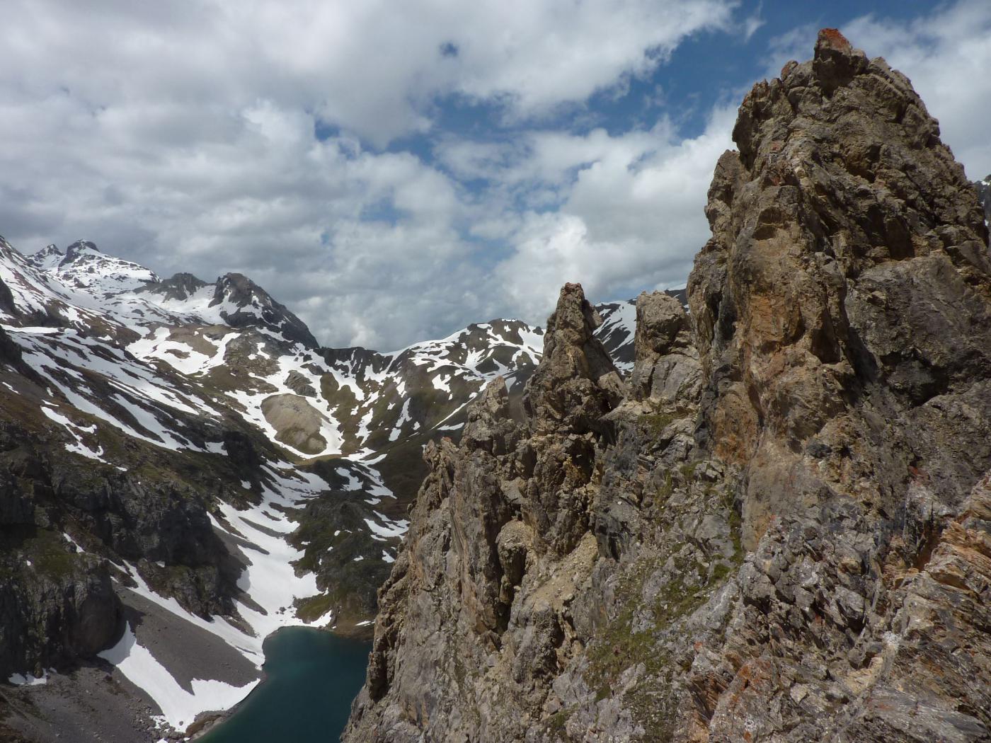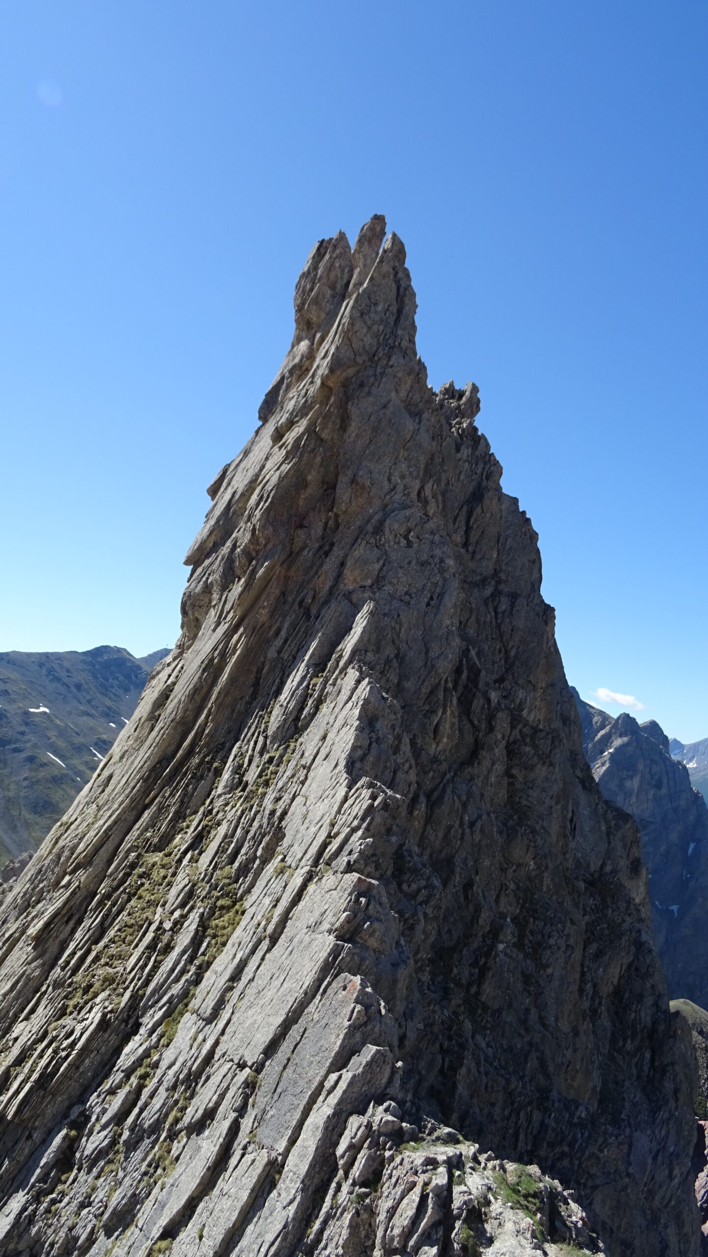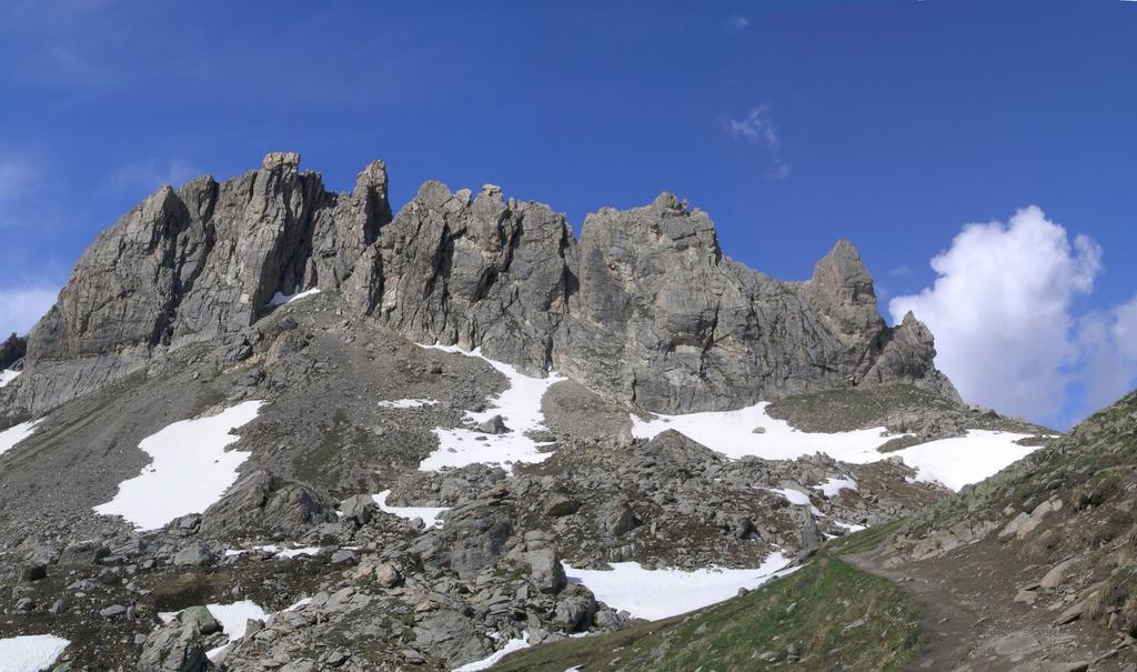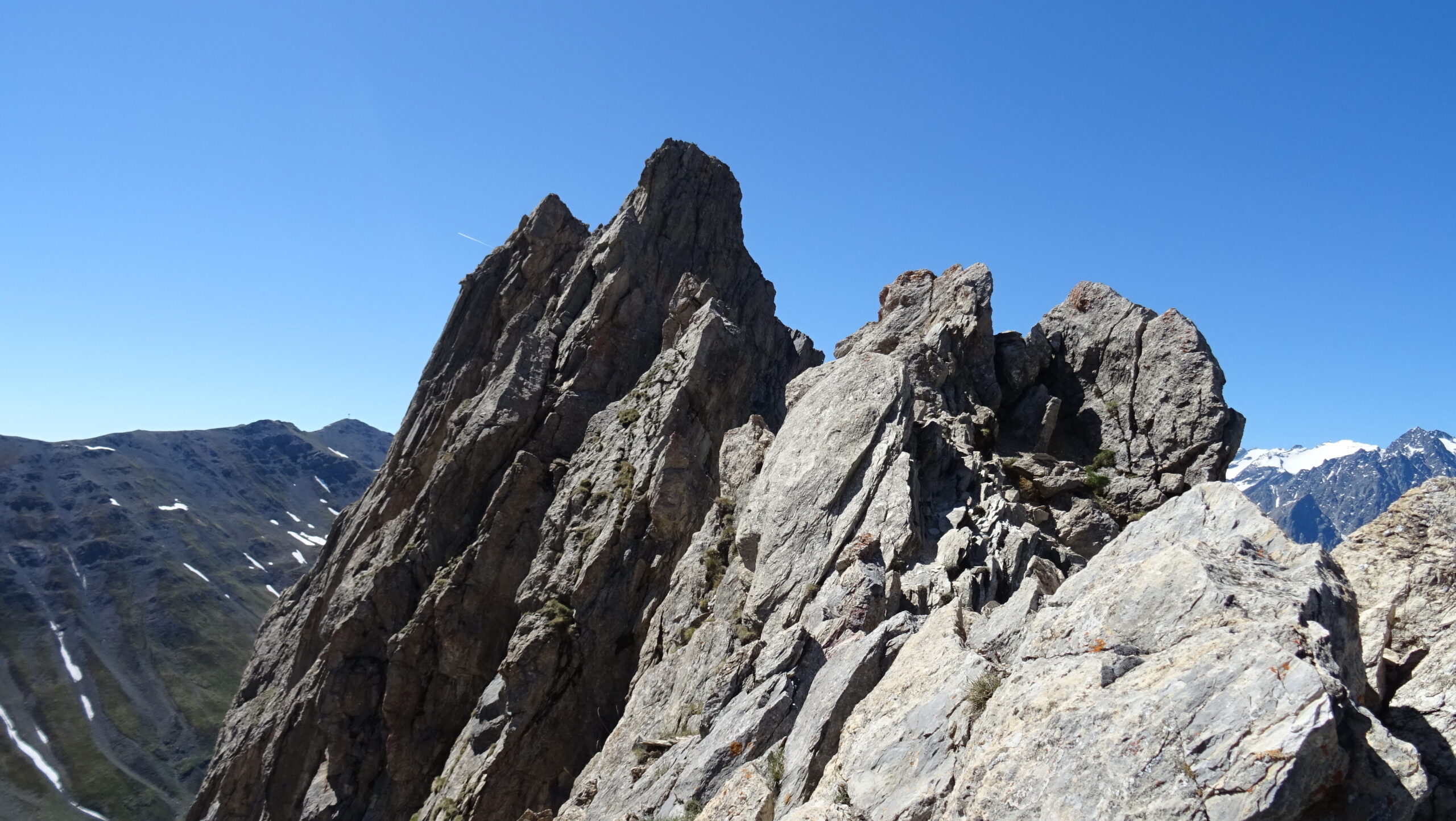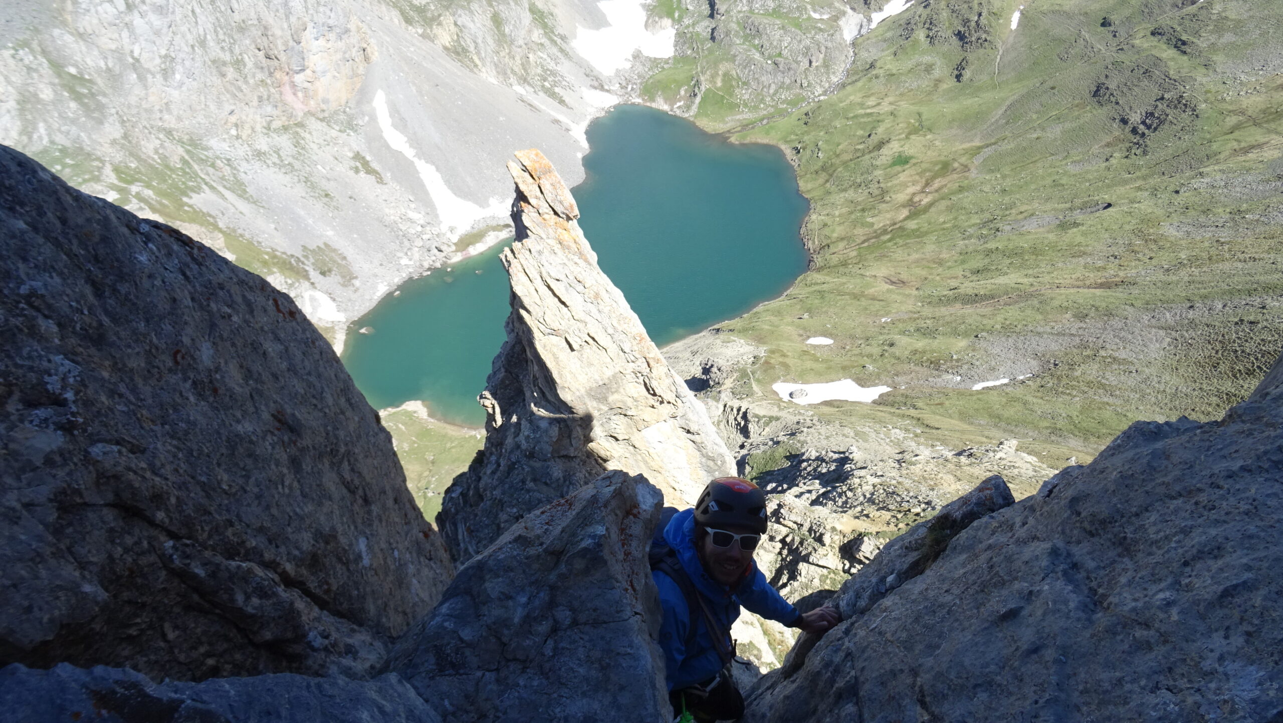Salire il grande gendarme stando leggermente alla sua destra, lungo un risalto all’apparenza ripido ma facile (un cordone e un ch. proteggono due brevi tratti di III+). Raggiunta la cima (cordoni), scendere piegando brevemente a dx e traversando di nuovo a sx fino ad una cresta affilata. Traversare la cresta prima sul filo e poi leggermente al di sotto lato est (1 ch.) e risalire un primo risalto del torrione successivo (2 fix di sosta da collegare). Scalare il bel gendarme (IV+) e perseguire per cresta aerea fino a raggiungere una calata di 10m che deposita ad una breccia.