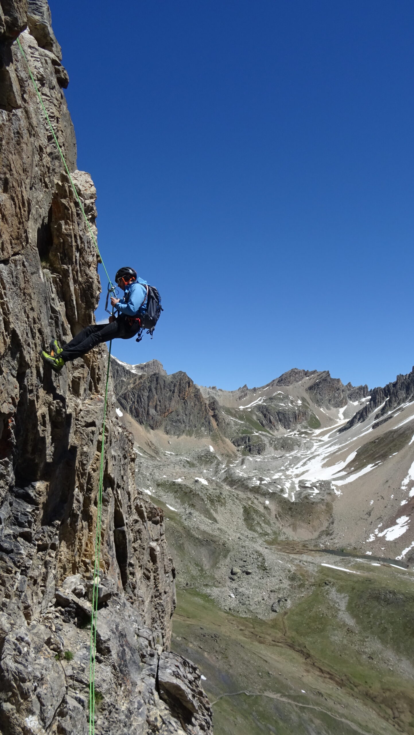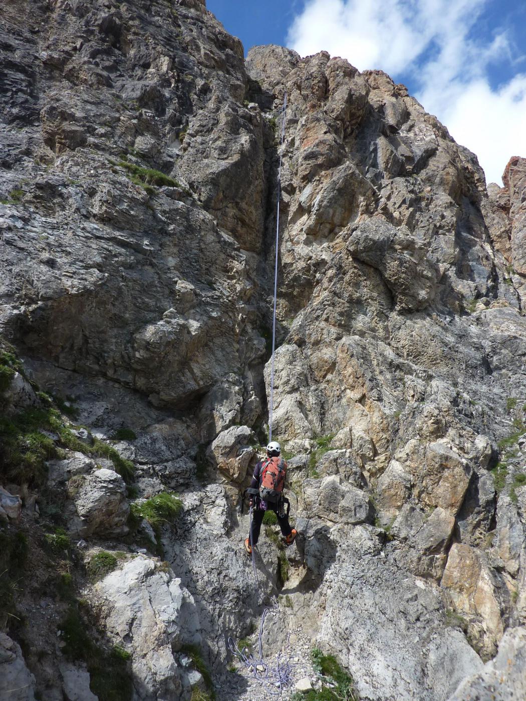 Proseguire facilmente fino alla tozza sommità successiva e quindi imboccare una traccia che scende verso sud (sx) lungo un pendio erboso-detritico. Tagliare a dx seguendo gli ometti e quindi con una calata da 23m raggiungere una forcella. Proseguire verso sud lungo una traccia accennata e passata un’ultima paretina (1 passo di II), proseguire fino ad intercettare il sentiero che riporta a ponte de l’Alpe.