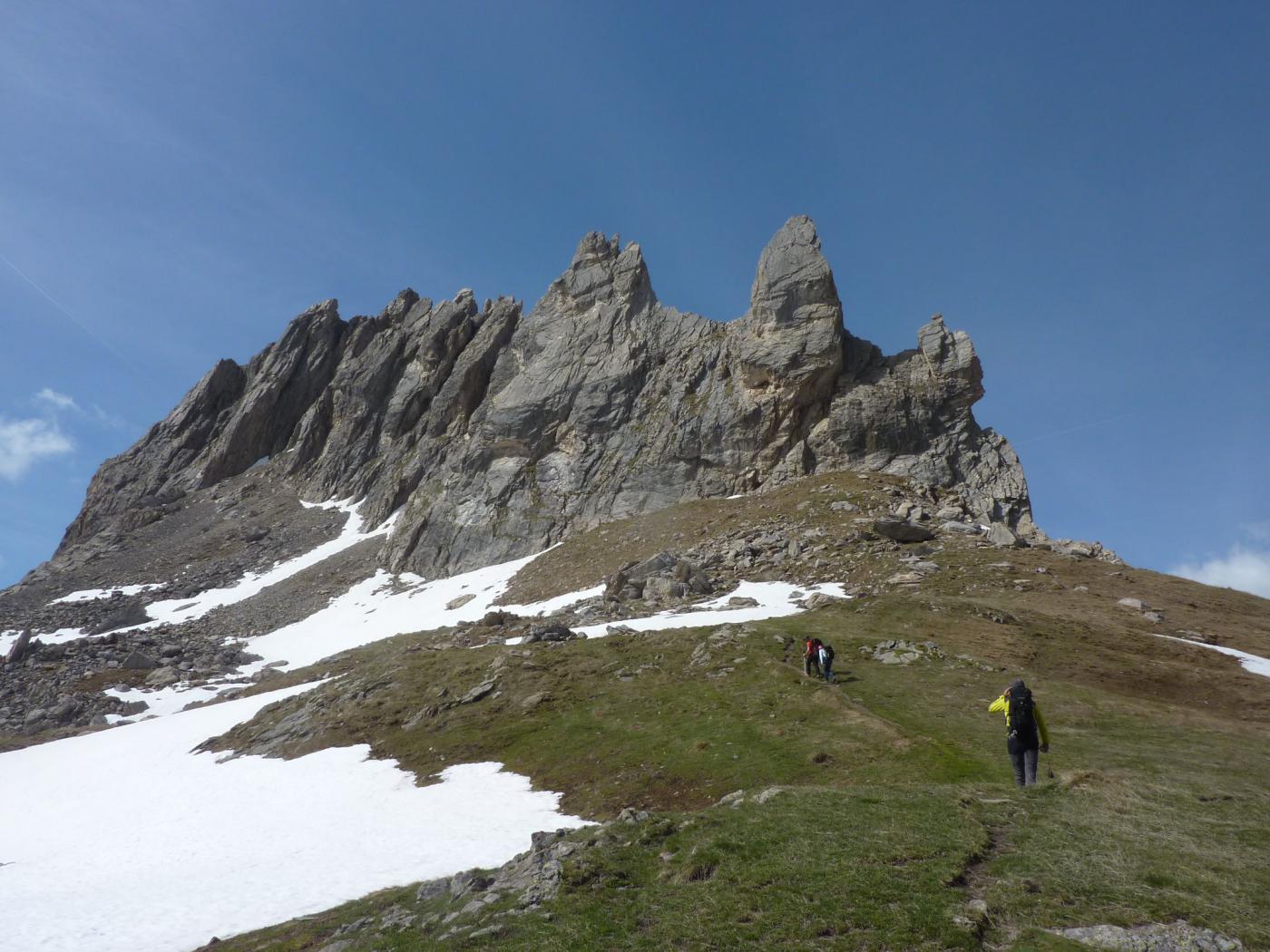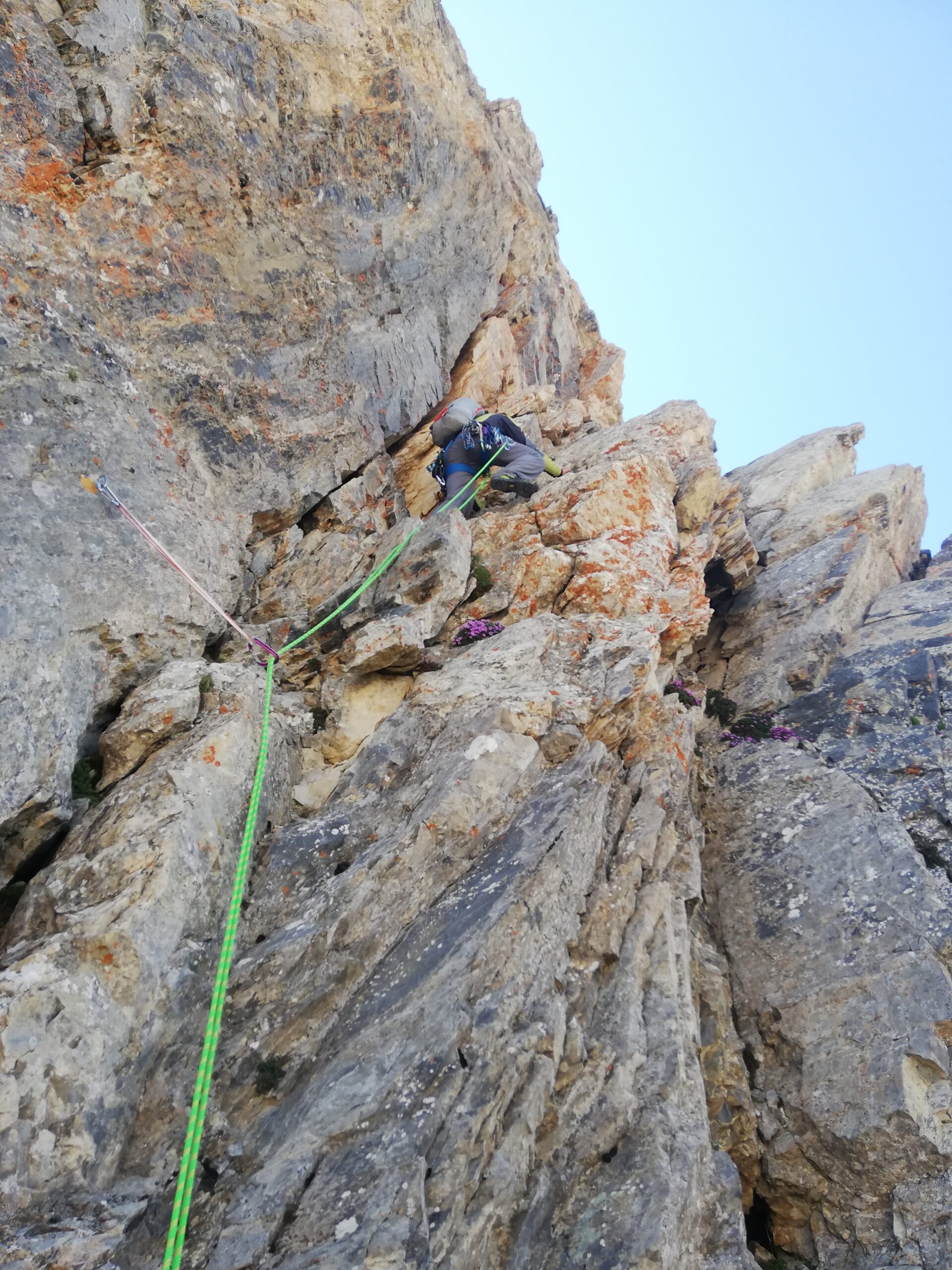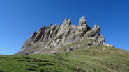 Poggiare debolmente a dx per tornare sul filo il prima possibile e quindi traversare sulla sx in leggera discesa. Continuare a salire prima sulla dx (breve muretto di IV, 2 fix) e poi tornare a sx in cresta e scendere con attenzione sul versante est per alcuni metri, attraversando una placca liscia. Salire il salto successivo piegando sempre sulla sx (ch.) e seguendo una cresta affilata ma facile raggiungere la cima del gendarme. Con una doppia da 15m si raggiunge una larga breccia, alla base dell’ultimo gendarme. Salirlo sulla dx lungo una rampa diagonale da sx a dx (III-IV, ch. e fix), sostando a piacimento su 2 friend incastrati, o poco più sopra su 1 spit singolo o poco più su ancora su 2 fix da collegare. Salire un ultimo camino e raggiungere la sommità dell’ultimo gendarme. Una doppia di 15m permette di raggiungere la breccia da cui un sentierino lato ovest porta alla sommità erbosa.