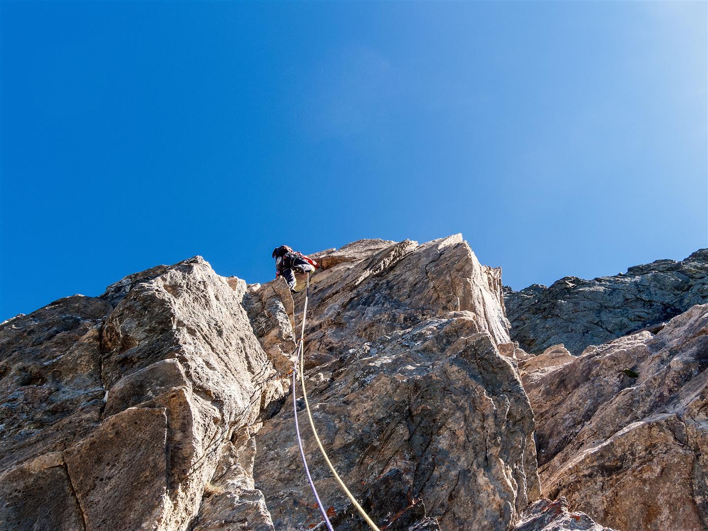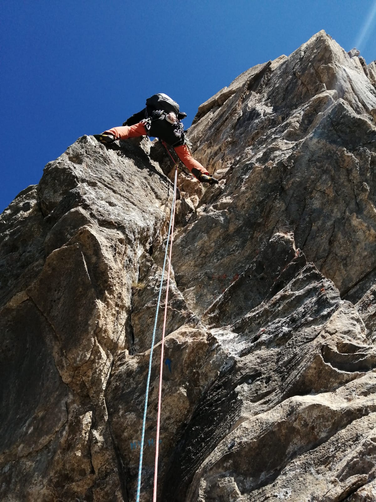 L8/9: traverso in cengia via via più delicata ed esposta (4b, passi di 5a), fino a raggiungere un grottino ombroso alla base del risalto sommitale. Sosta su fix singolo, tiro unibile in un’unica lunghezza di 40-50m (in base a dove si è iniziato il tiro)