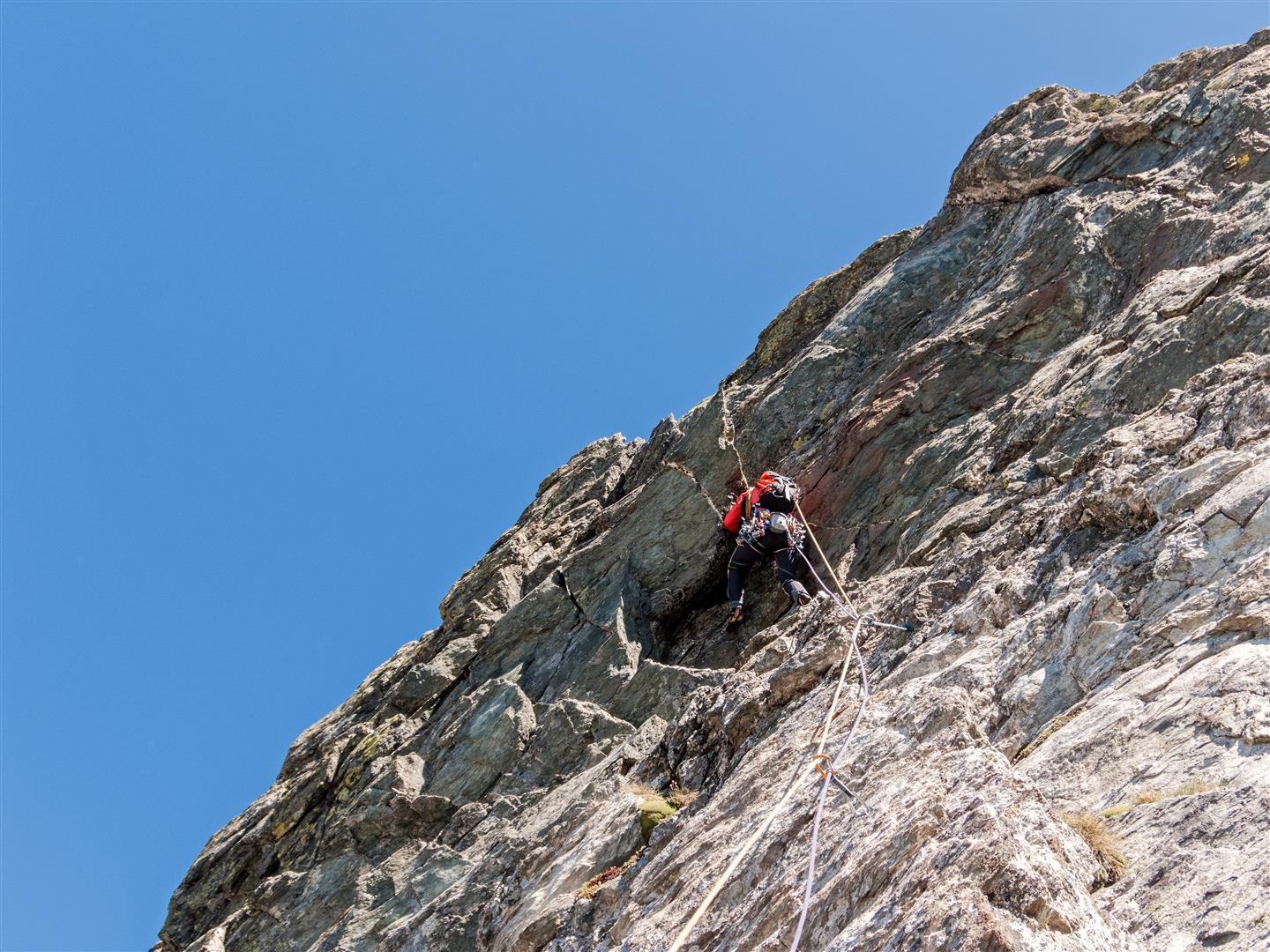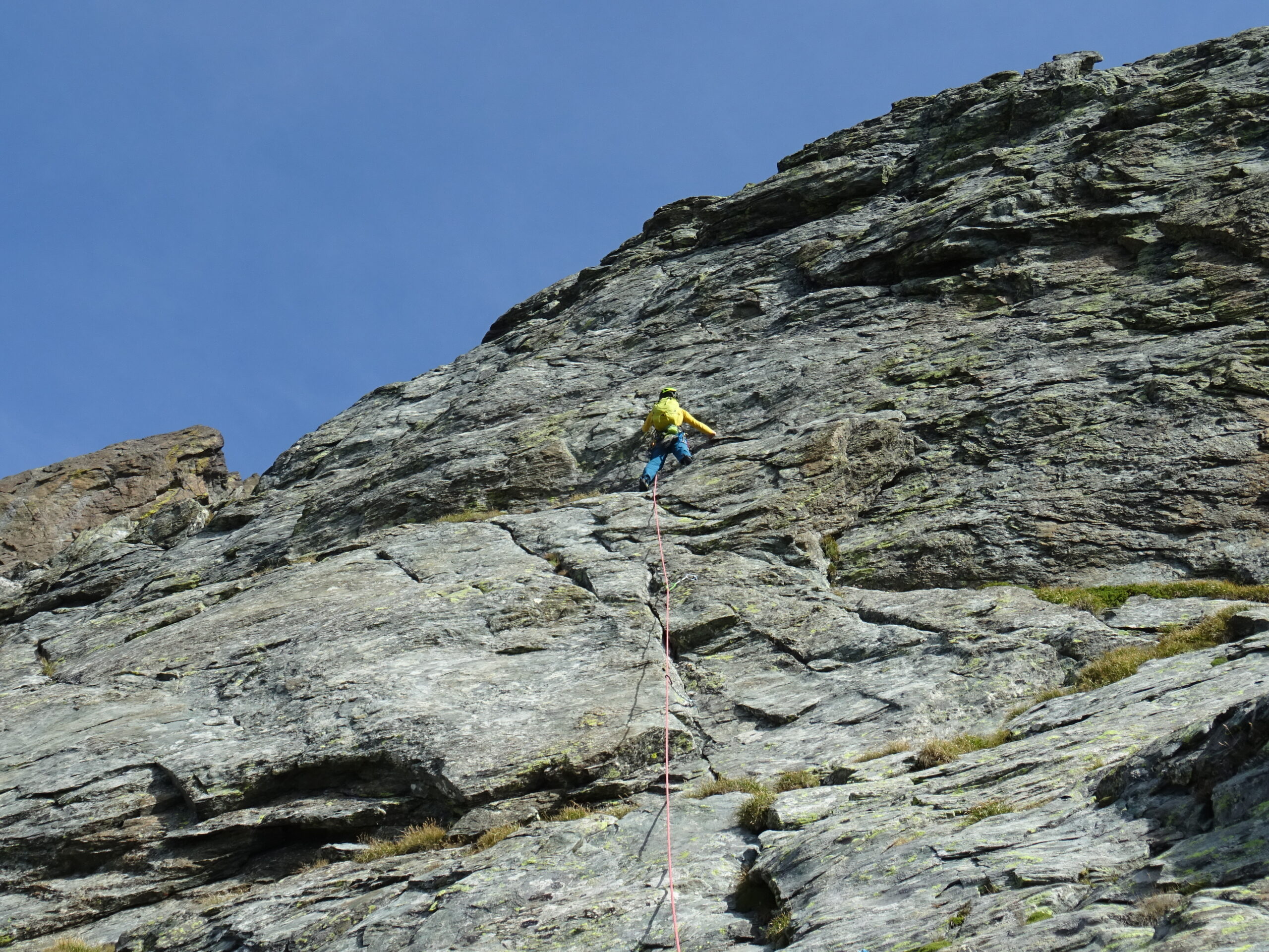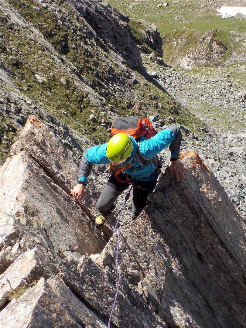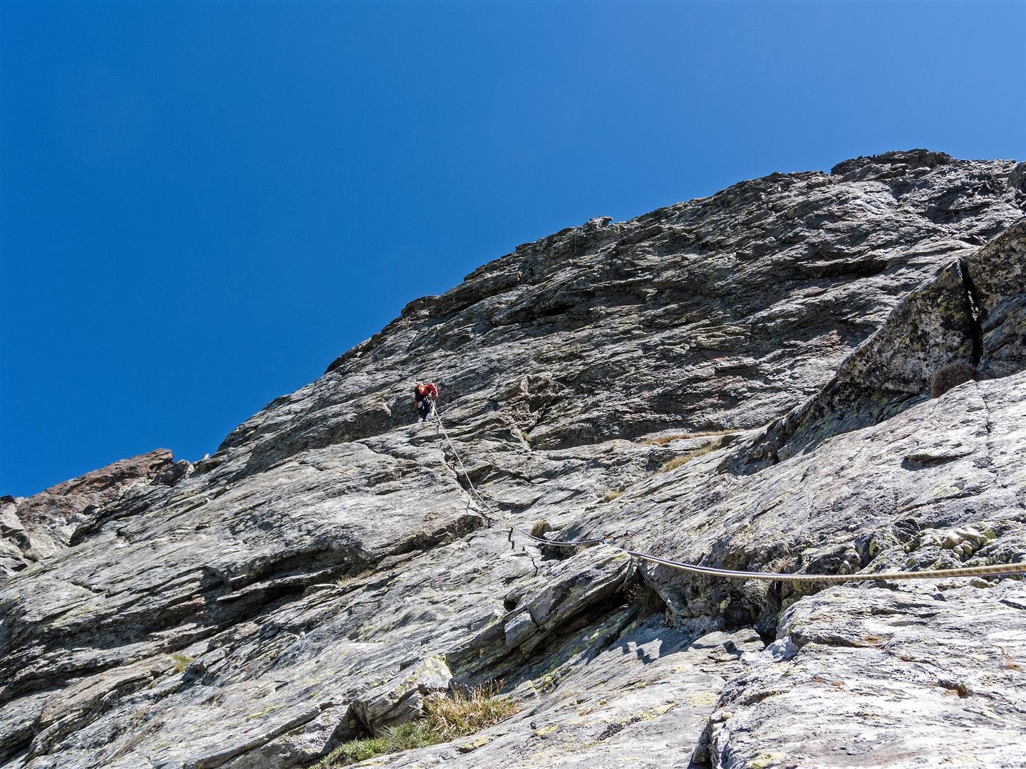 L7: breve risalto ripido e poi placca (5a/b) fino in cima al gendarmino, sosta sul lato E, 20m. Questo tiro è comodamente evitabile sulla sx seguendo la via normale.