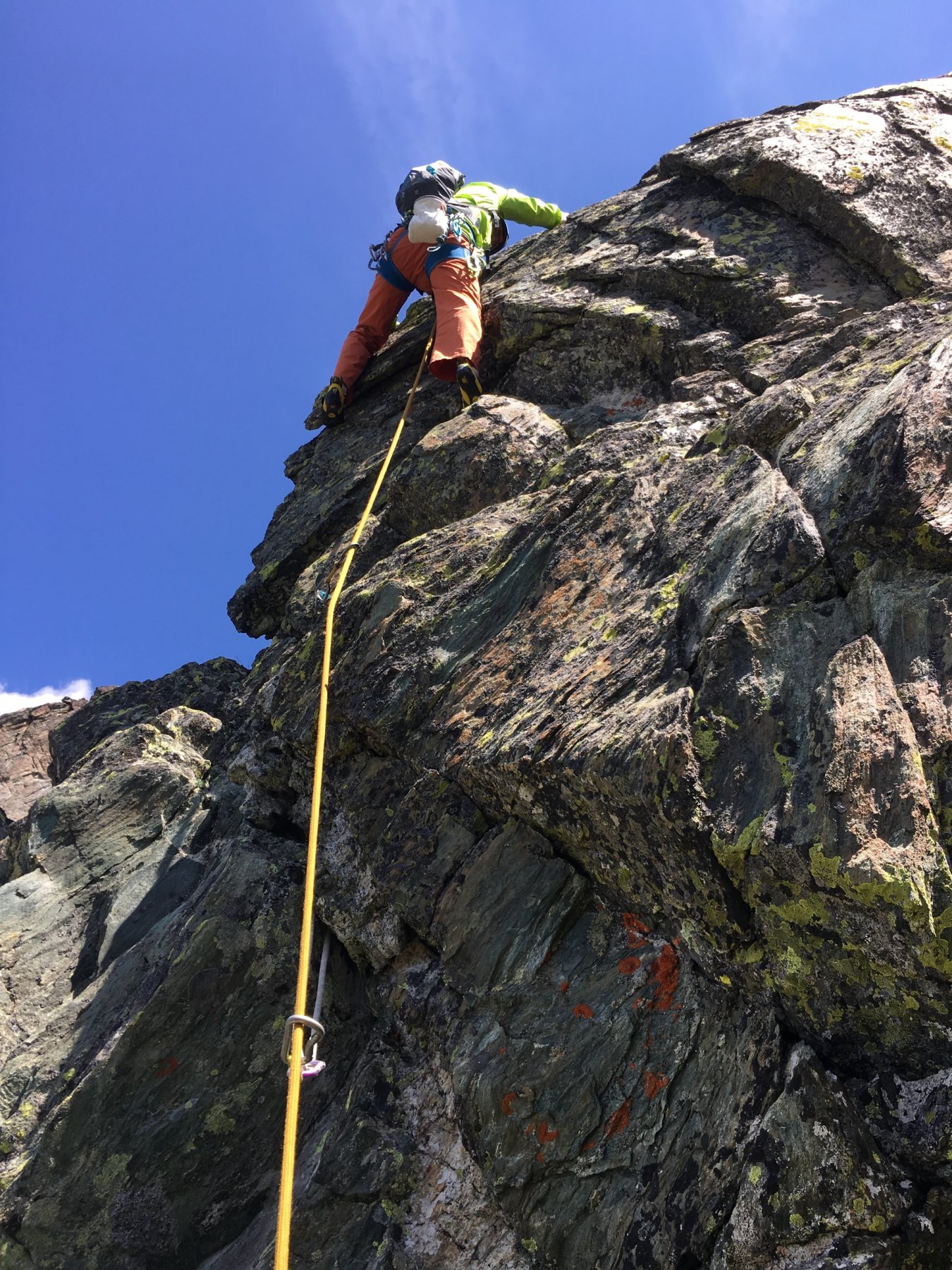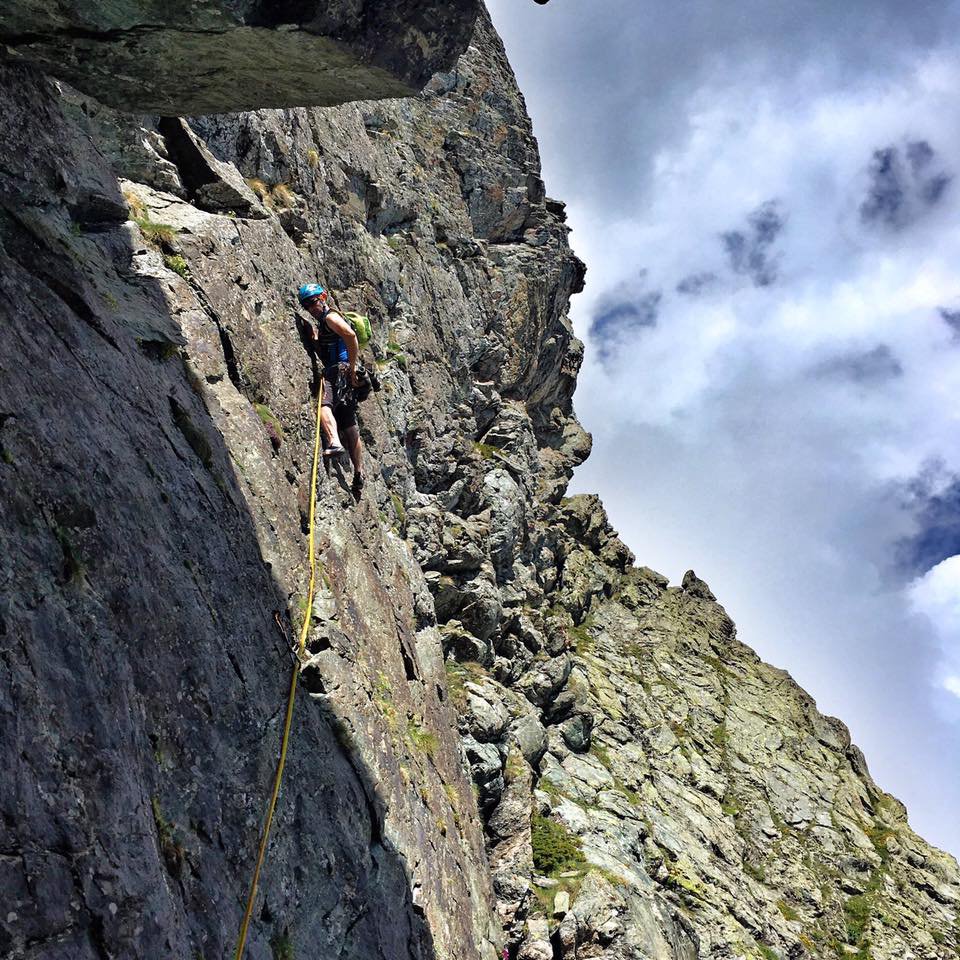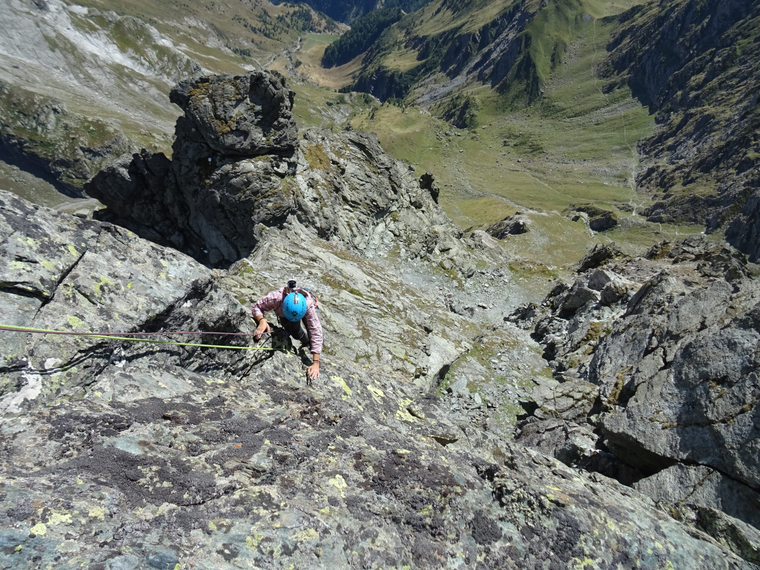 L7: breve risalto ripido e poi placca (5a/b) fino in cima al gendarmino, sosta sul lato E, 20m. Questo tiro è comodamente evitabile sulla sx seguendo la via normale.