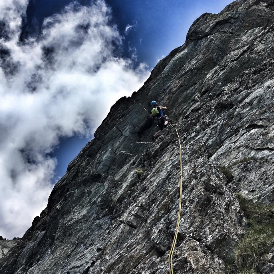 L11: si risale la fessura-camino con un passo più aggettante all’inizio (5b) e quindi più facilmente fino a sbucare sul plateau sommitale, dove si sosta, 20m