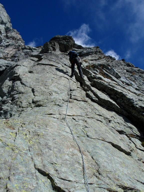 superate le ultime catene ed il diedro di II passiamo sul versante ovest della montagna, dove troviamo neve. Mancano 50 m alla vetta ma saranno i più delicati. In particolar modo una piccola cengia di 10 m lineari abbastanza esposta ci fa tribolare un po’, poi ci teniamo leggermente più alti rispetto alla via segnata dai bolli rossi, in modo da evitare i tratti più ghiacciati, salendo invece per dei canalini con roccia buona e ricca di appigli. Altro passaggio delicato lungo una enorme spaccatura nella roccia (vietato caderci dentro). Le ultime roccette (esposte) invece non creano grossi problemi fino all’aerea cima.