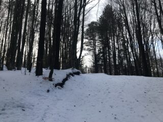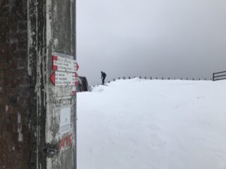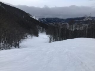 Complice la pioggia di ieri sera, la bella neve caduta questi giorni ha fatto una fastidiosa crosta non portante in alto. Molto meglio lungo la pista chiusa perché il gatto aveva già creato un minimo di fondo.