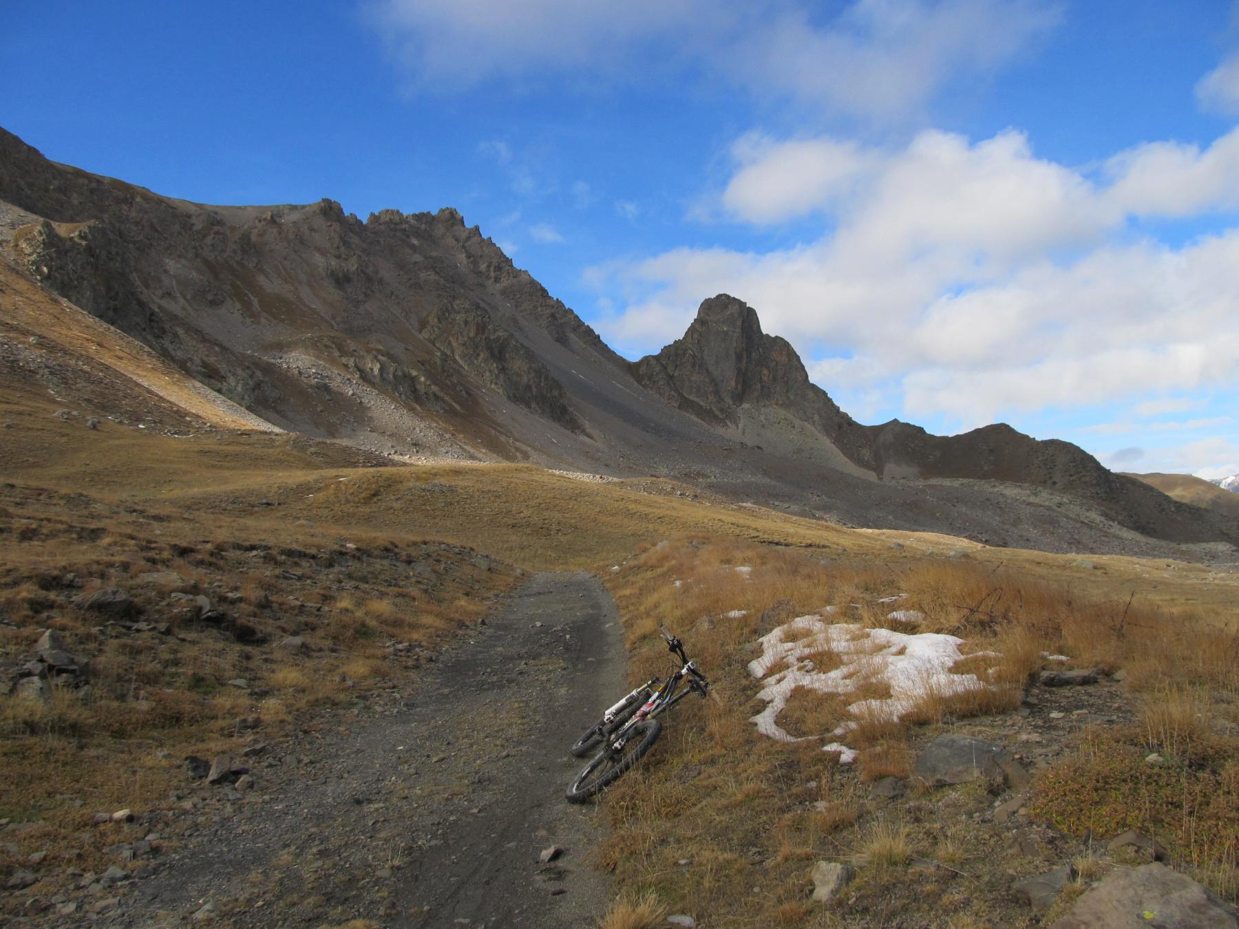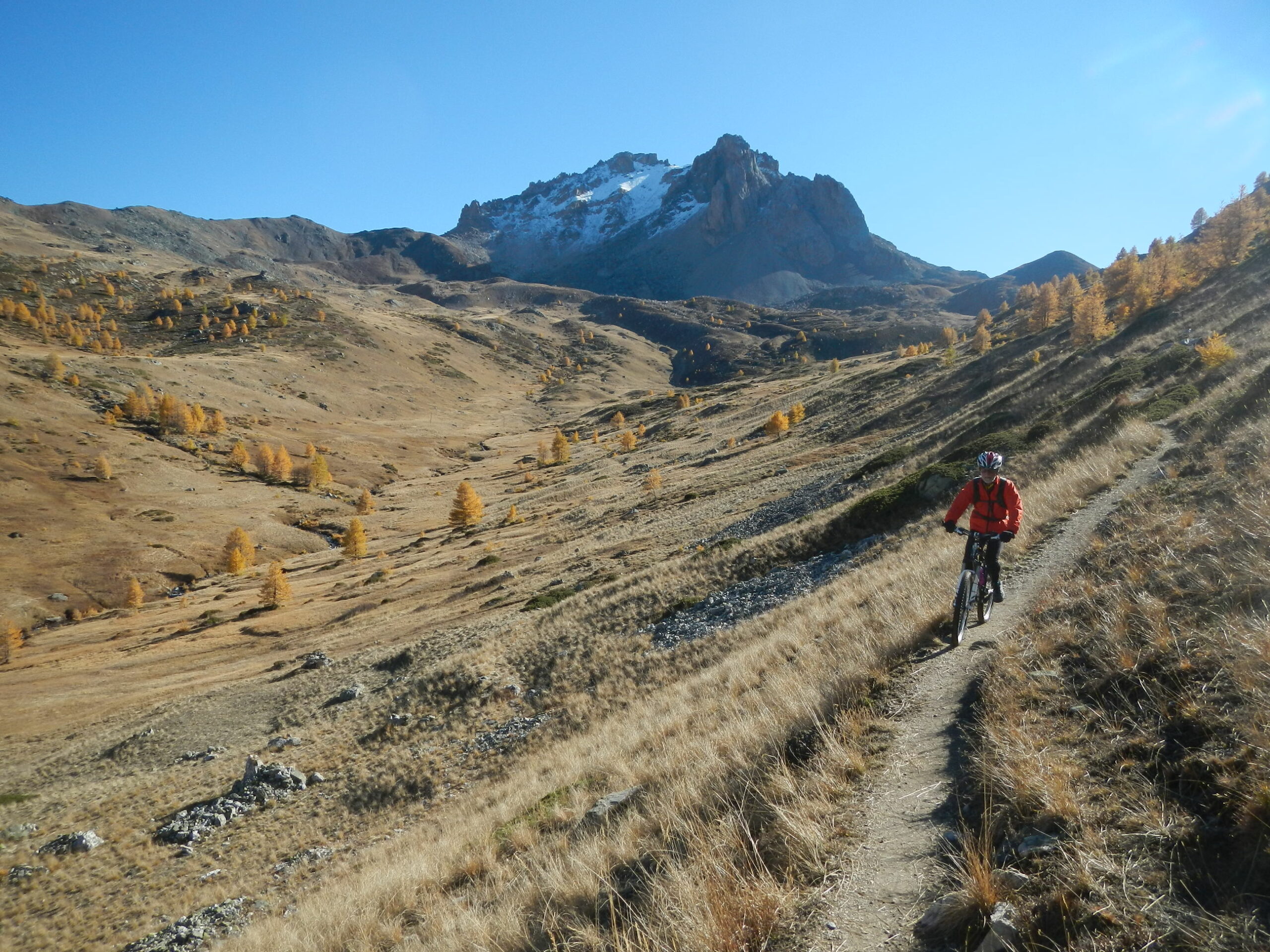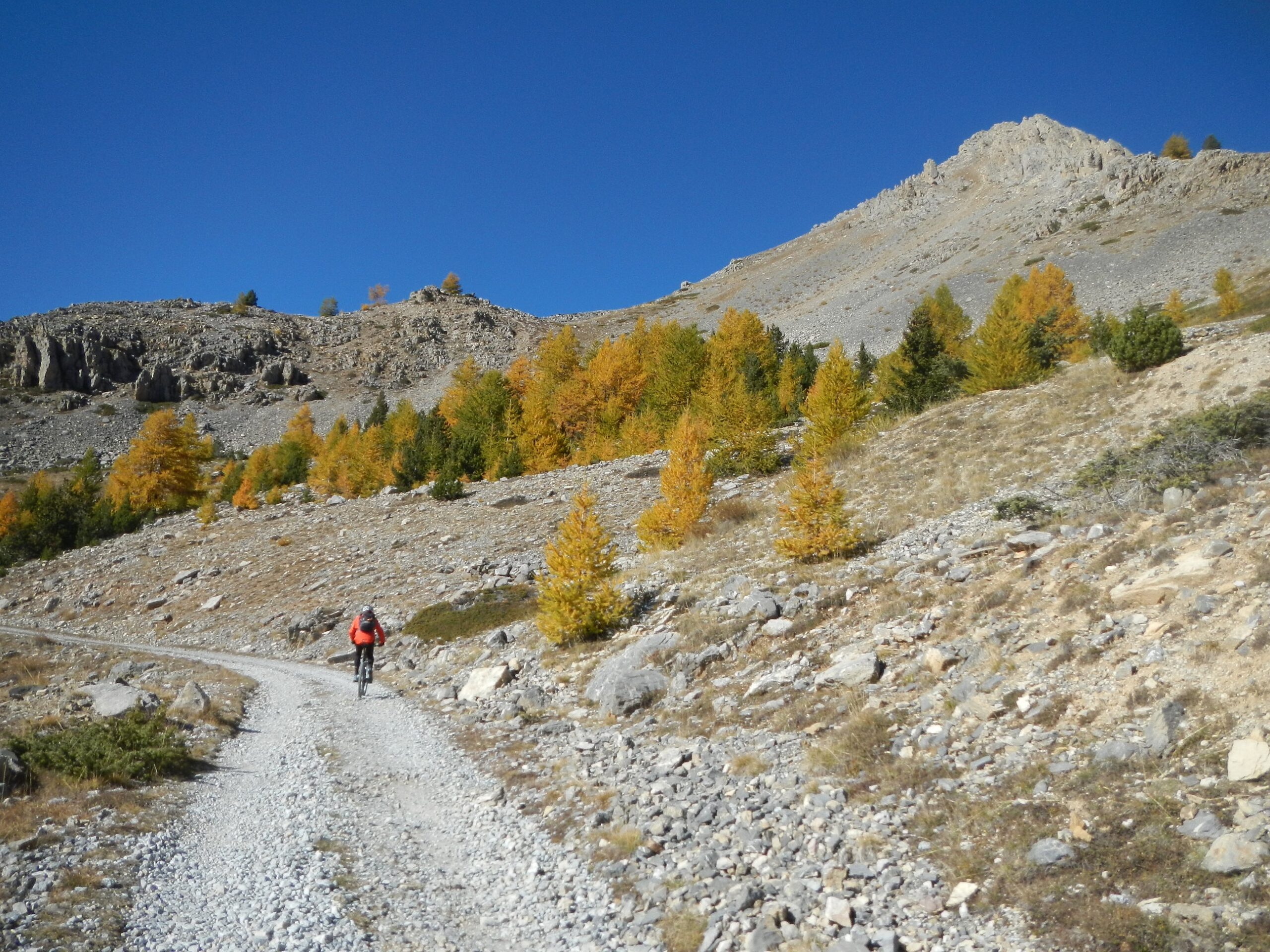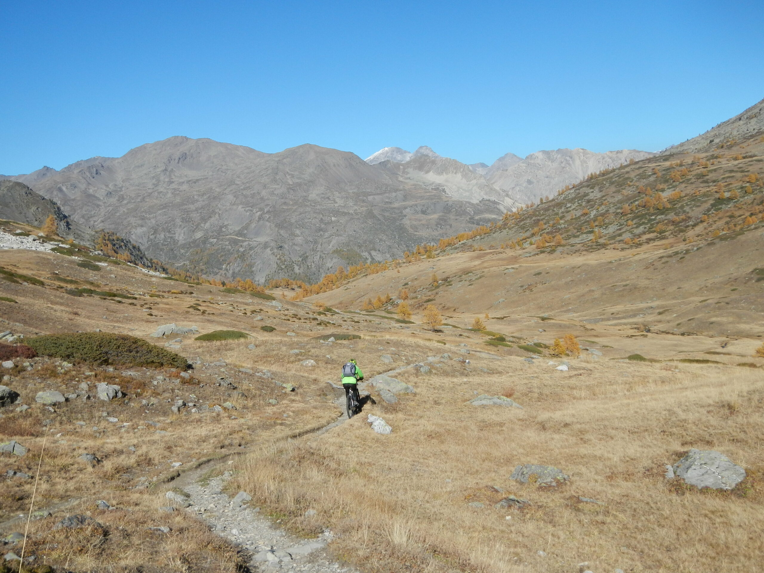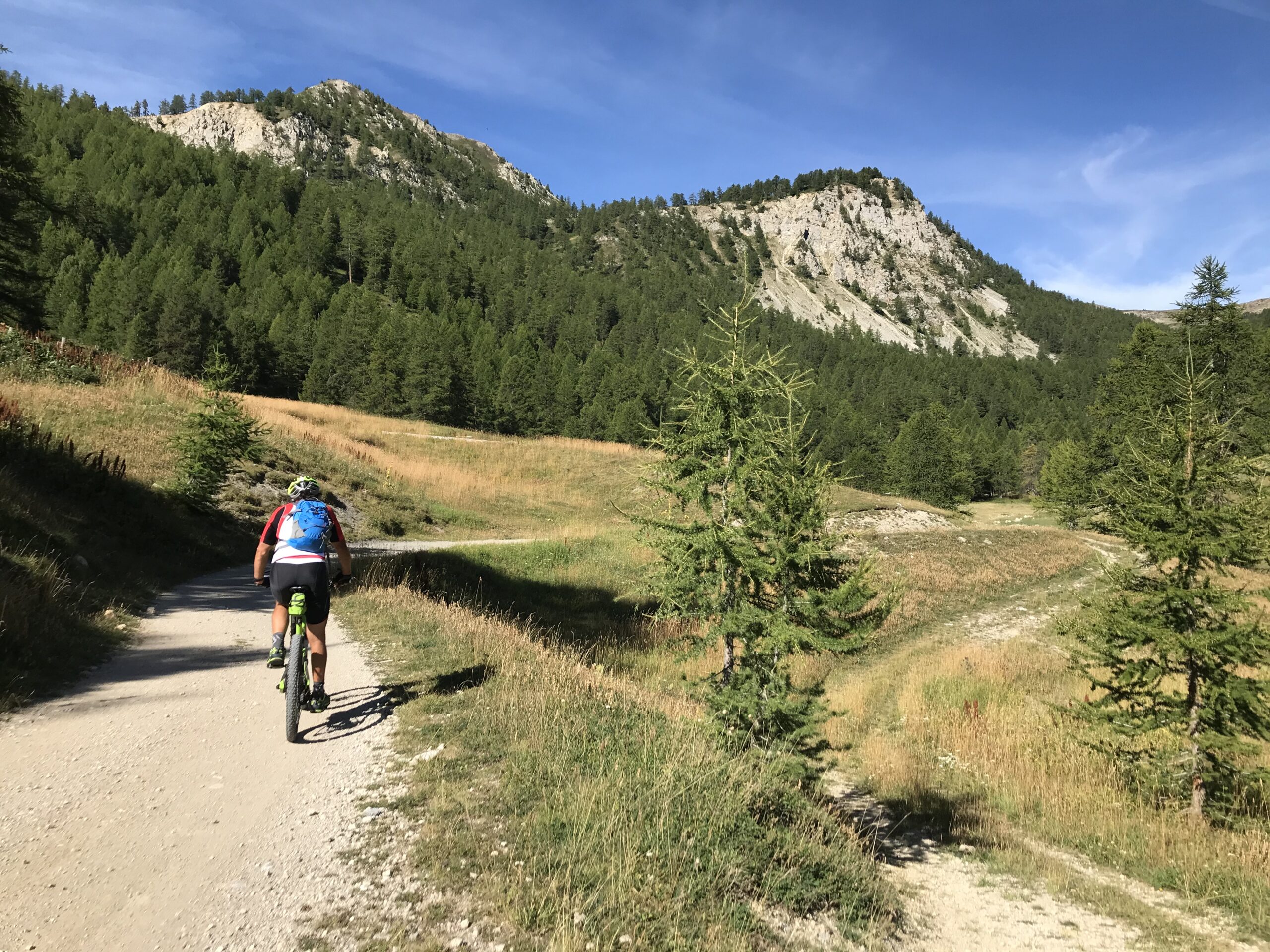 decisamente più sassoso. Dopo circa 300 metri di dislivello si raggiunge il Col de Buffère. Di qui si prende il sentiero che sul versante Nord del colle porta a Nevache. In principio per prati e tracce di sentiero poi per sentiero che si fa via via piu ampio. In certi punti si fa ripido e molto sassoso, non sempre perfettamente pedalabile.