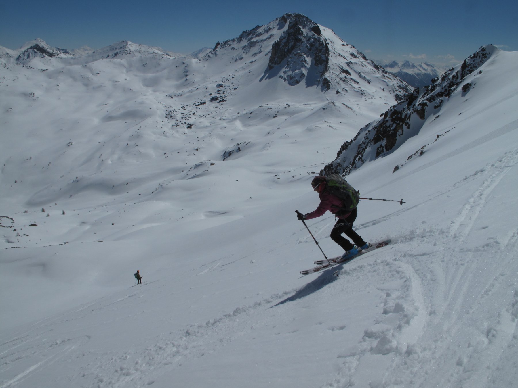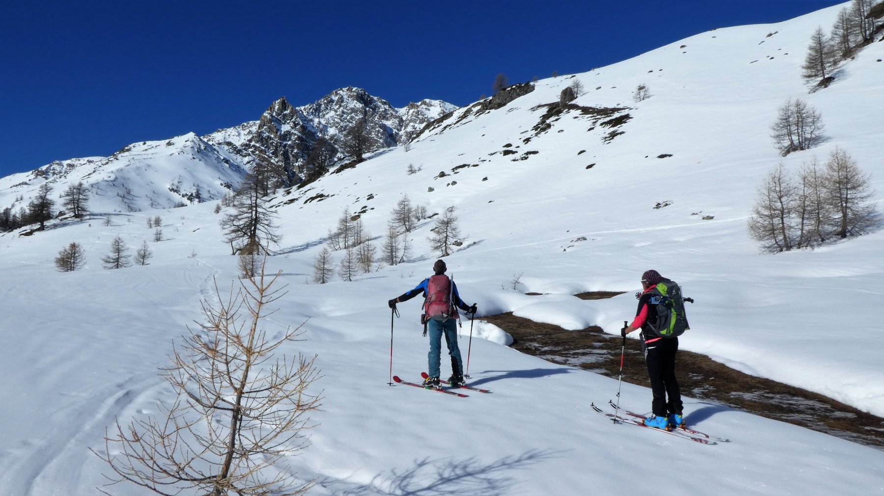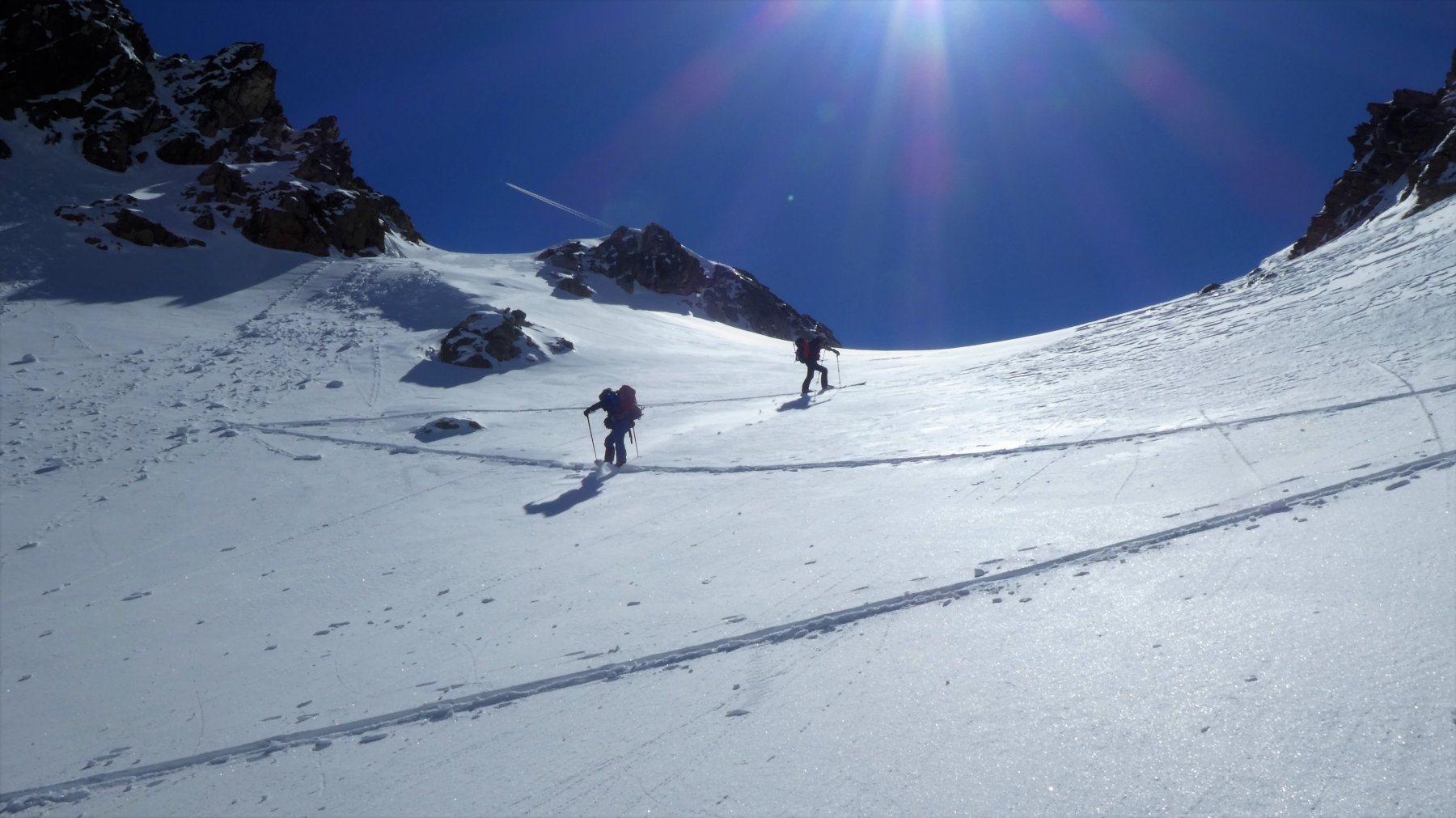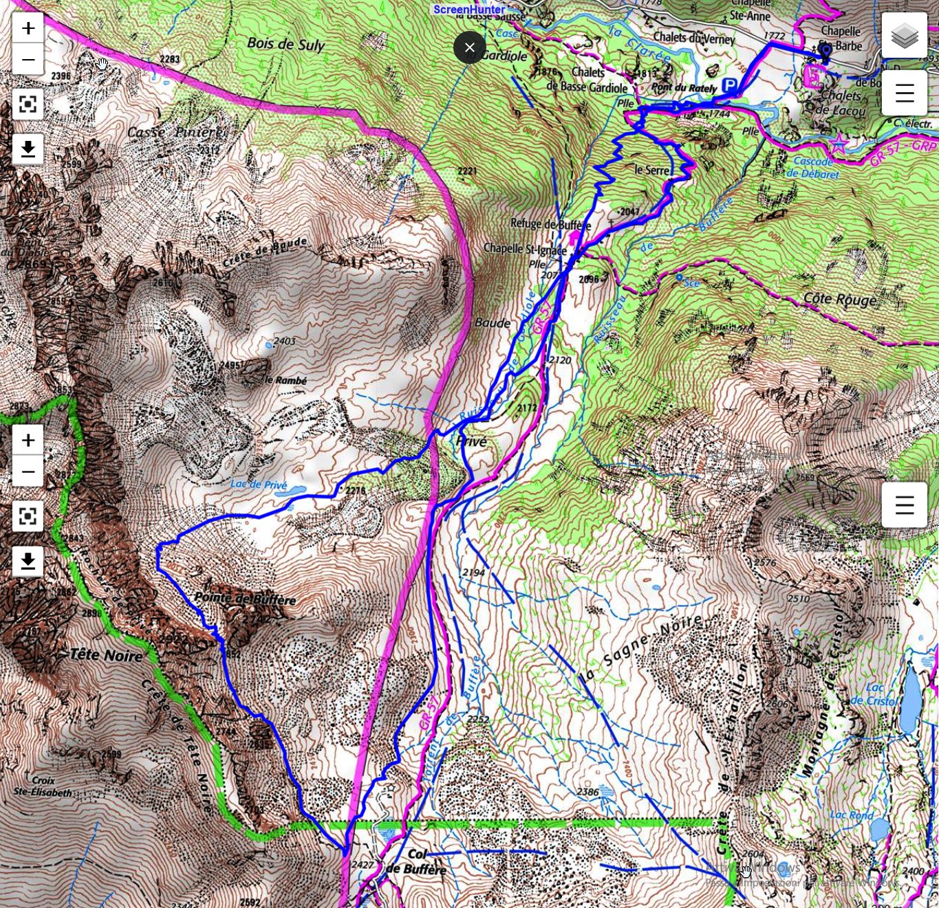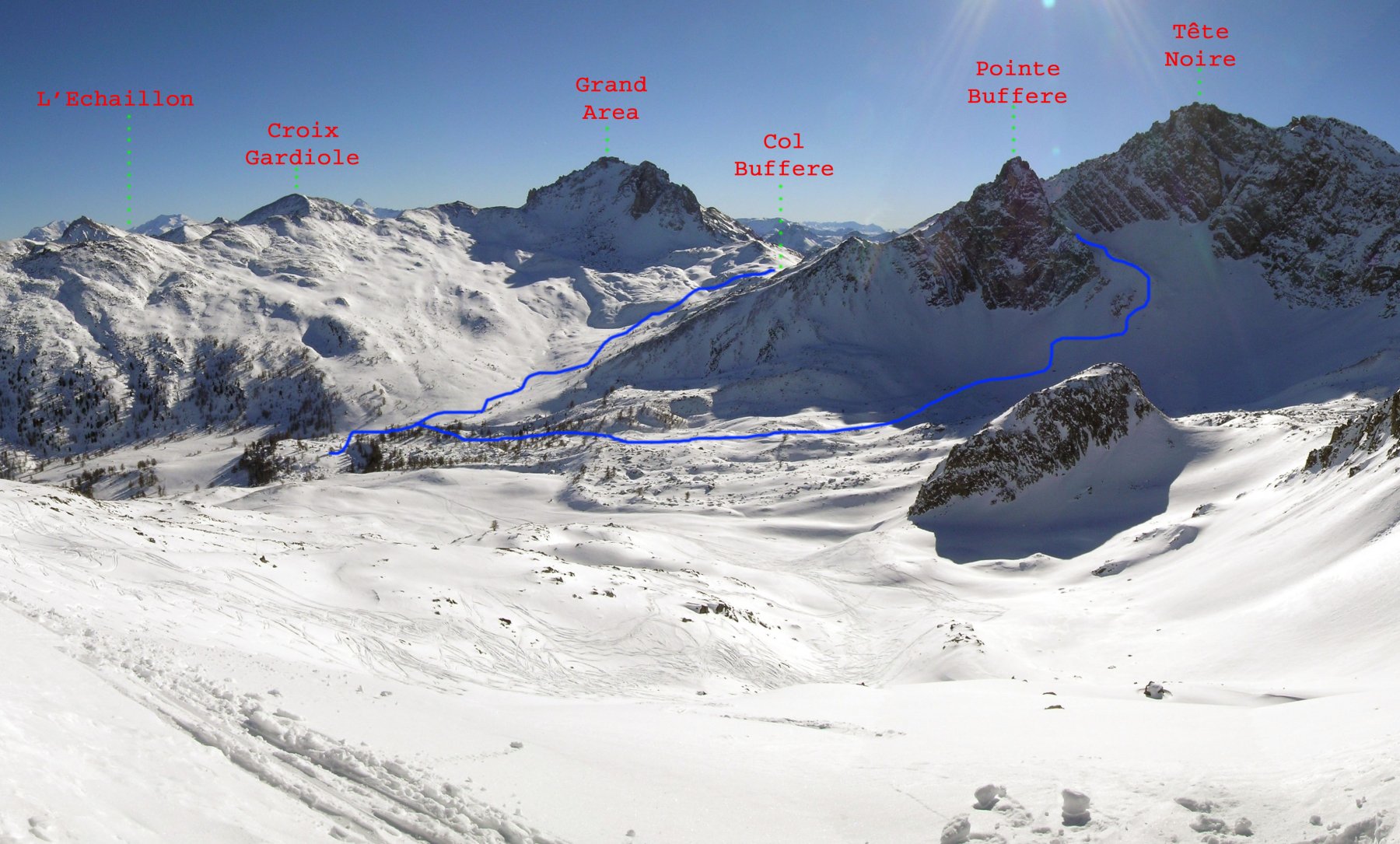 Superato il rifugio proseguire lungo pendii aperti e dolci che portano al Col de Buffere, ma spostarsi sul lato sinistro idrografico del vallone e appena possibile piegare a destra (Nord-Ovest) superando diversi valloncelli, toccando il lac du Privè 2270m e portarsi vicino alla cresta Rocher de Privè della Tête noire. Di qui con un lungo diagonale puntare al colle 2652m a Ovest della Pointe du Buffère, che raddrizza sui 30° negli ultimi 100m. Dal colle scendere in direzione del col di Buffere e chiudere l’anello lungo il centro del vallone fino a raggiungere il Rifugio Buffère e di qui il fondovalle, meglio nel bosco che sulla ripida stradina.
