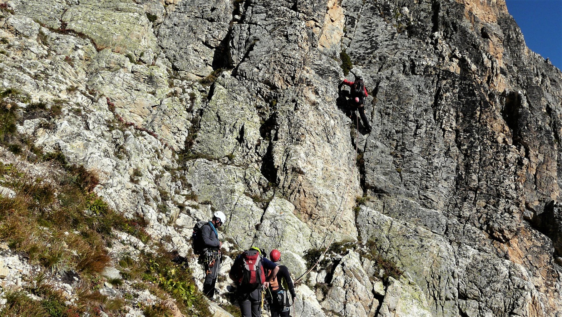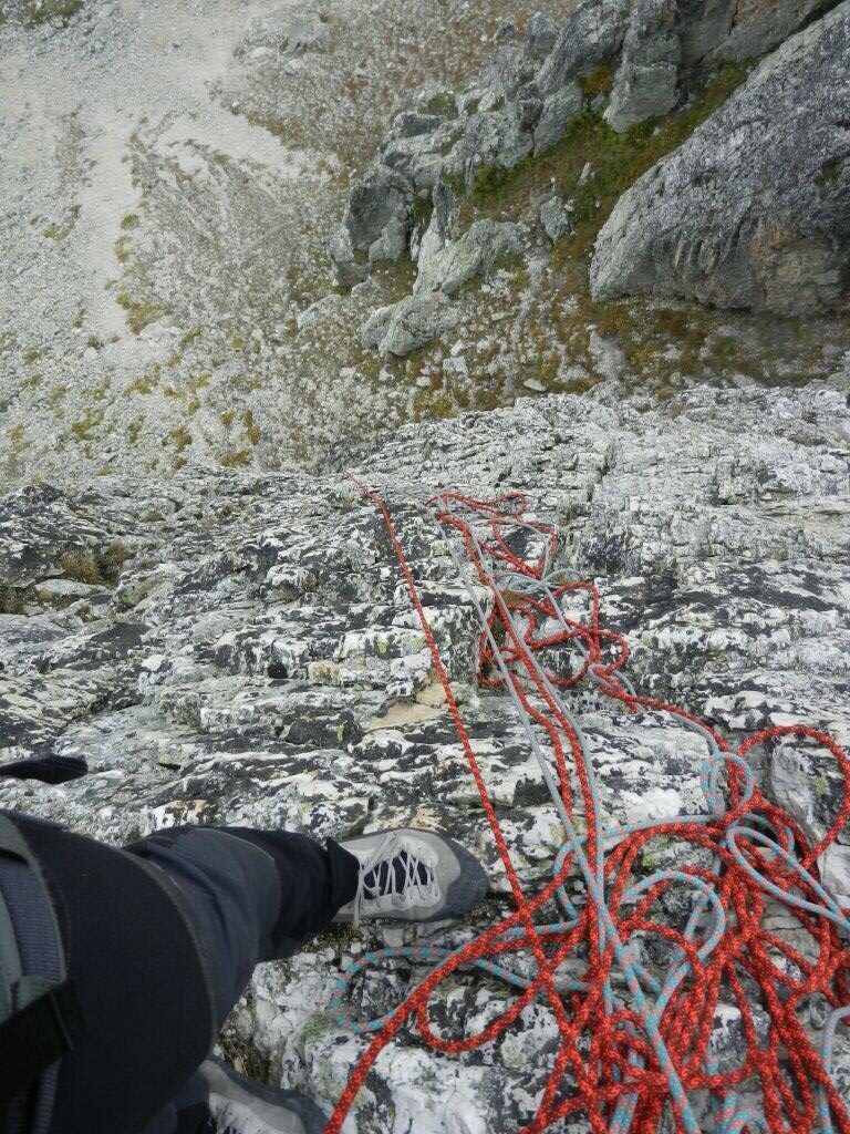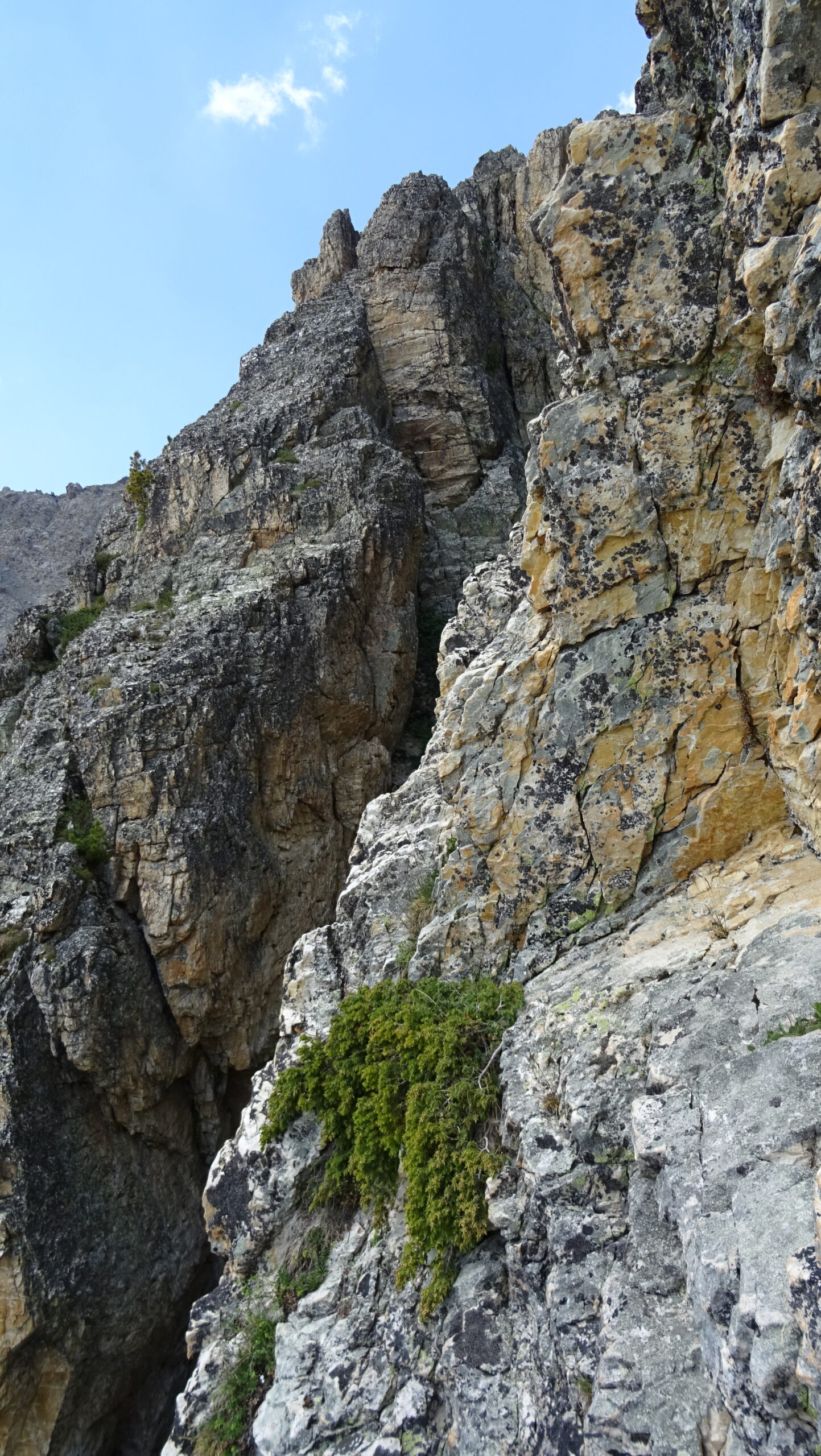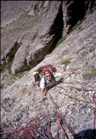 L5: affrontare un breve muretto più ripido (ch.), quindi proseguire lungo il filo a dx di una larga fessura, in una zona di roccia più dubbia (segni di crolli recenti a picco sulla parete est).
