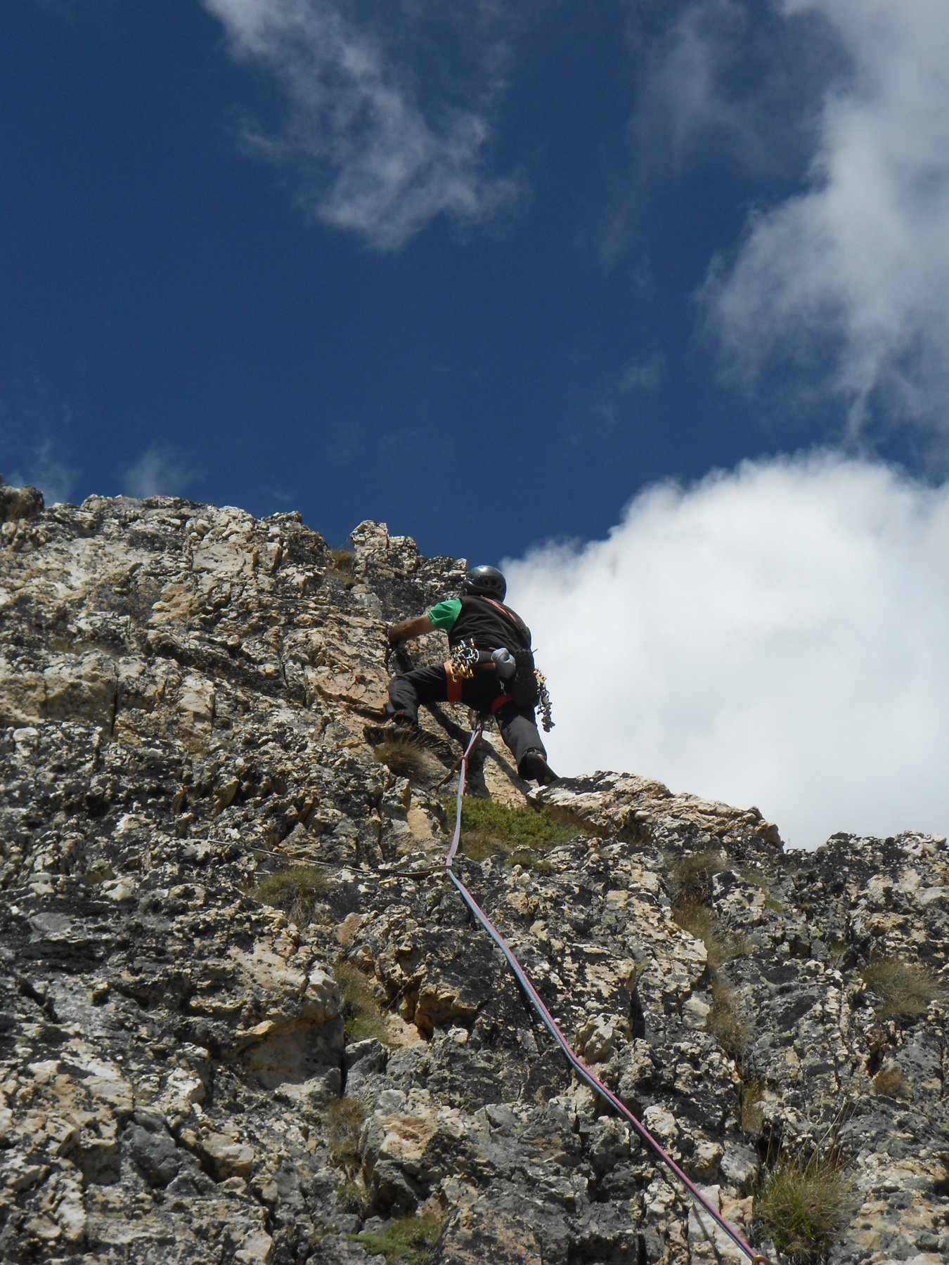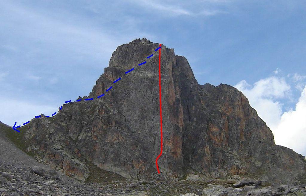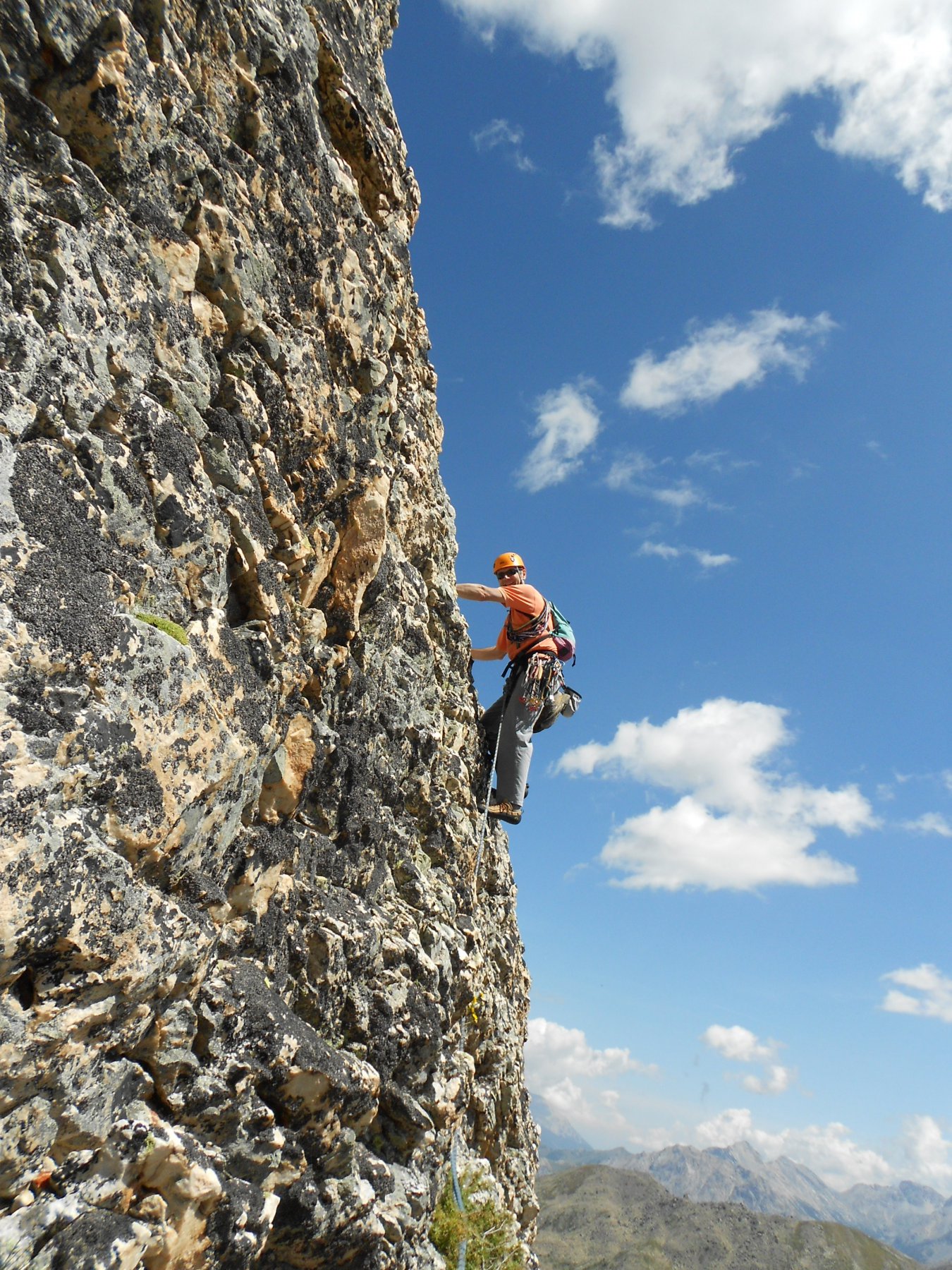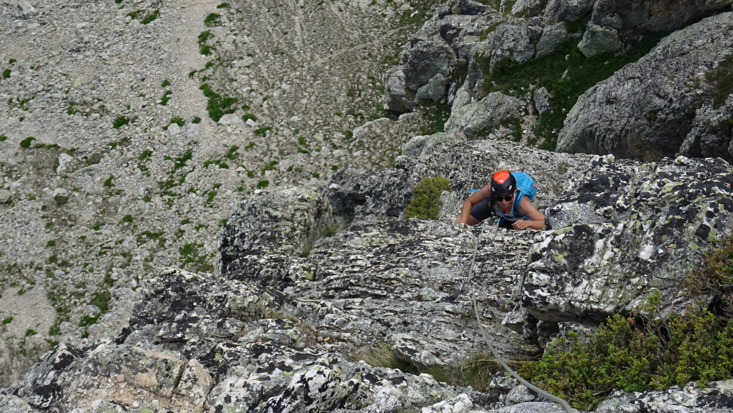 Raggiungere quindi la cima di una torre staccata e proseguire in conserva sulla cresta verso sinistra, salire lo spigolino di dx del salto finale (2 fix oro sulla dx e fix grigio sulla sinistra della discesa). Attraversare sull’estetica ma facile cresta finale fino a raggiungere la detritica sommità.