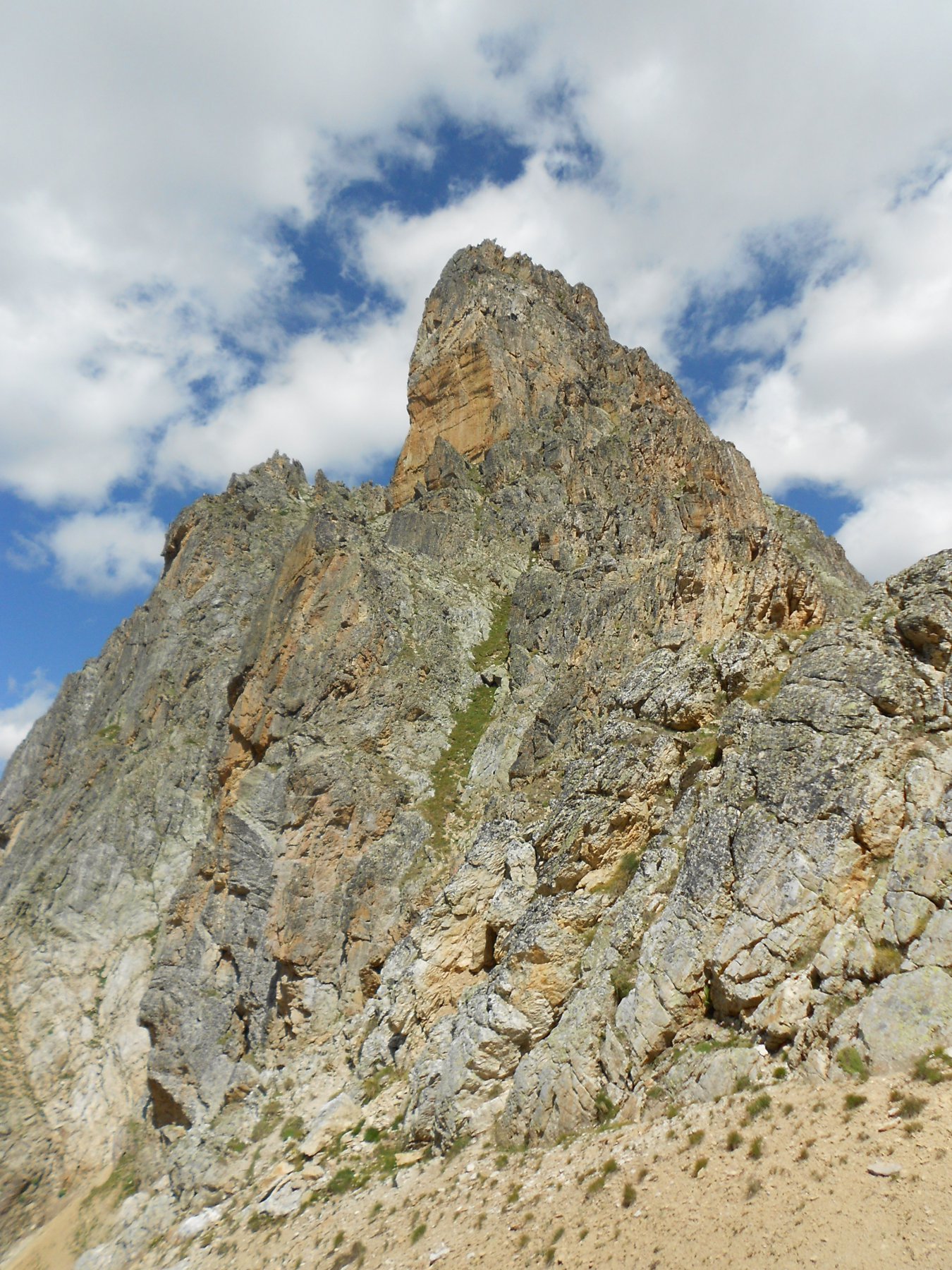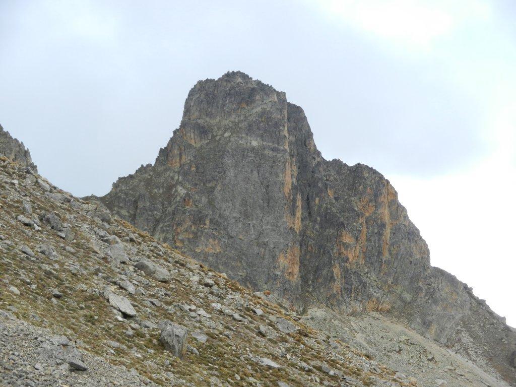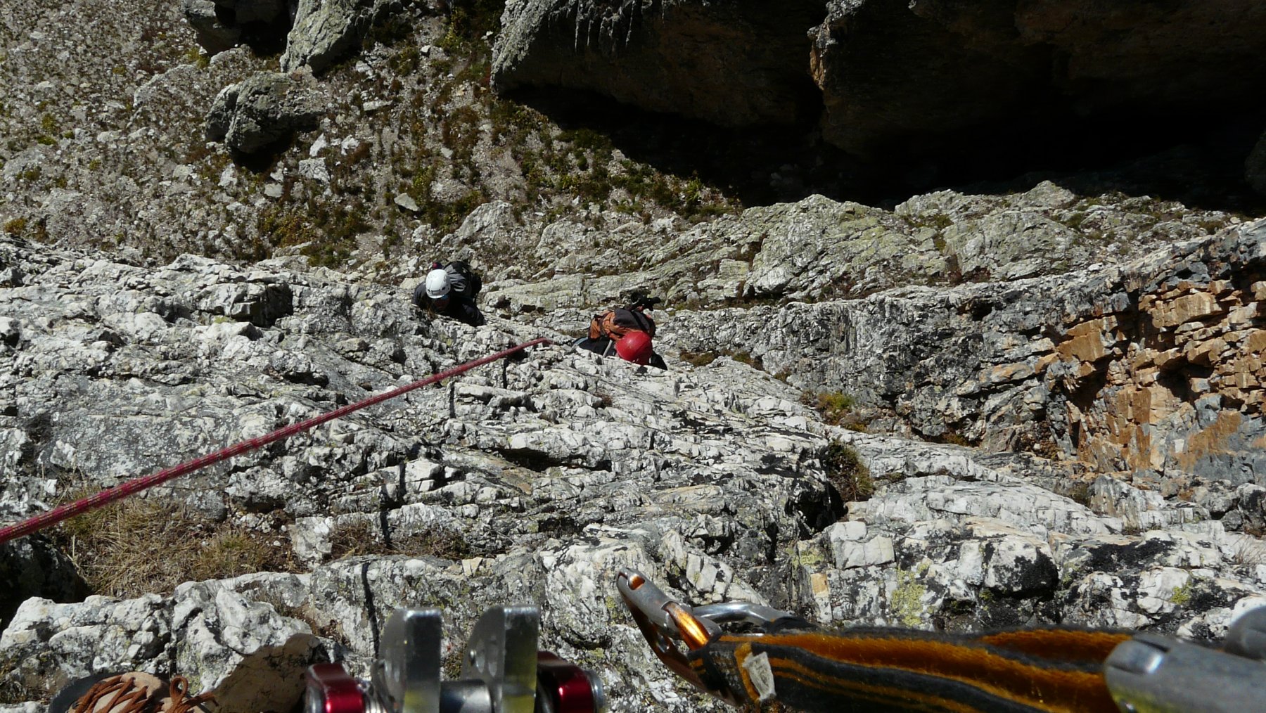 Raggiungere quindi la cima di una torre staccata e proseguire in conserva sulla cresta verso sinistra, salire lo spigolino di dx del salto finale (2 fix oro sulla dx e fix grigio sulla sinistra della discesa). Attraversare sull’estetica ma facile cresta finale fino a raggiungere la detritica sommità.