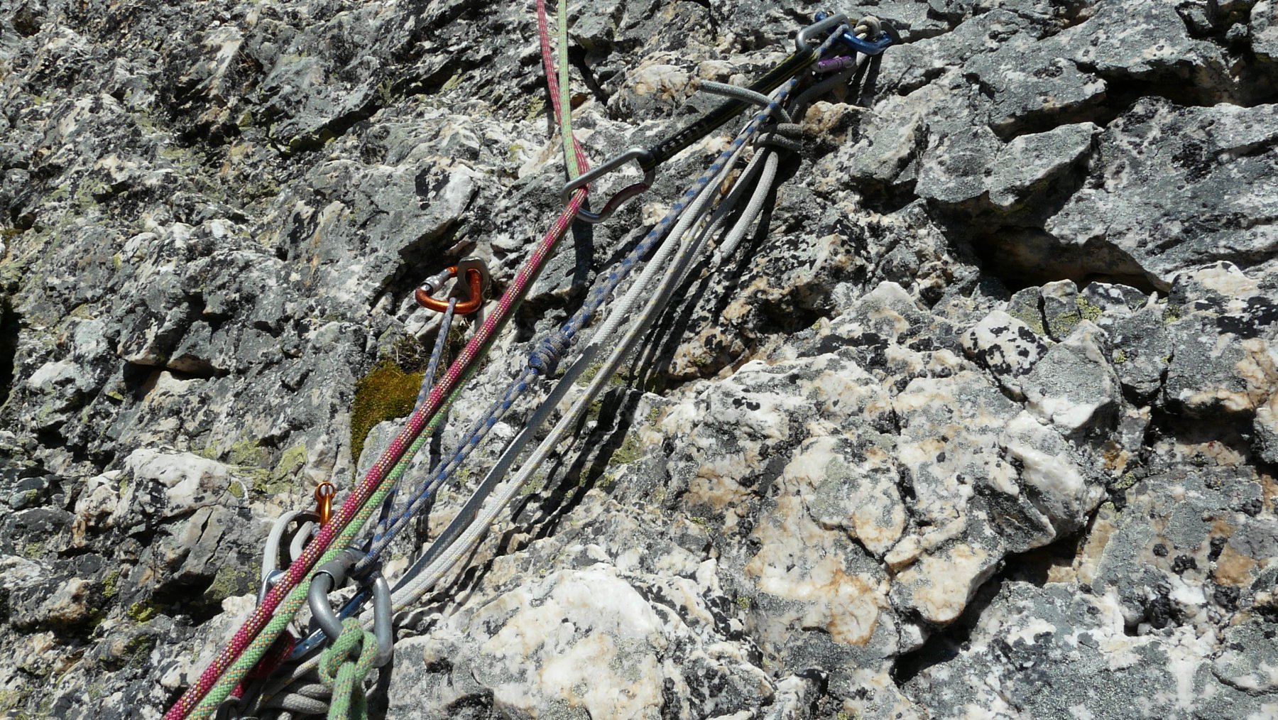 L2 (eventualmente concatenabile col precedente): traversare a sx (III, ch. oltre lo spigolo), quindi risalire una serie di paretine ripide ma ben appigliate (IV+), prima debolmente verso sx e poi verso dx (sosta appesa su ch.+fix con cordoni). Variante: dalla sosta si seguono i fix sulla dx, attenzione dopo il secondo spuntone, non seguire il percorso più logico verso un ripido diedro arancione (sprotetto, V+) ma spostarsi a sinistra in corrispondenza di un chiodo.