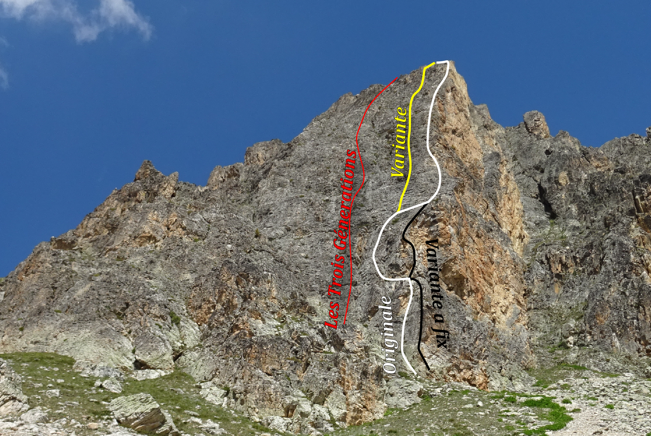Discesa: si scende disarrampicando stando sotto la cresta dell’ultima lunghezza (alcuni fix di protezione, II), poi facilmente per cengia obliqua si arriva al colle con la Tete Noire e da lì per sentiero ci si ricongiunge con la traccia fatta in salita.