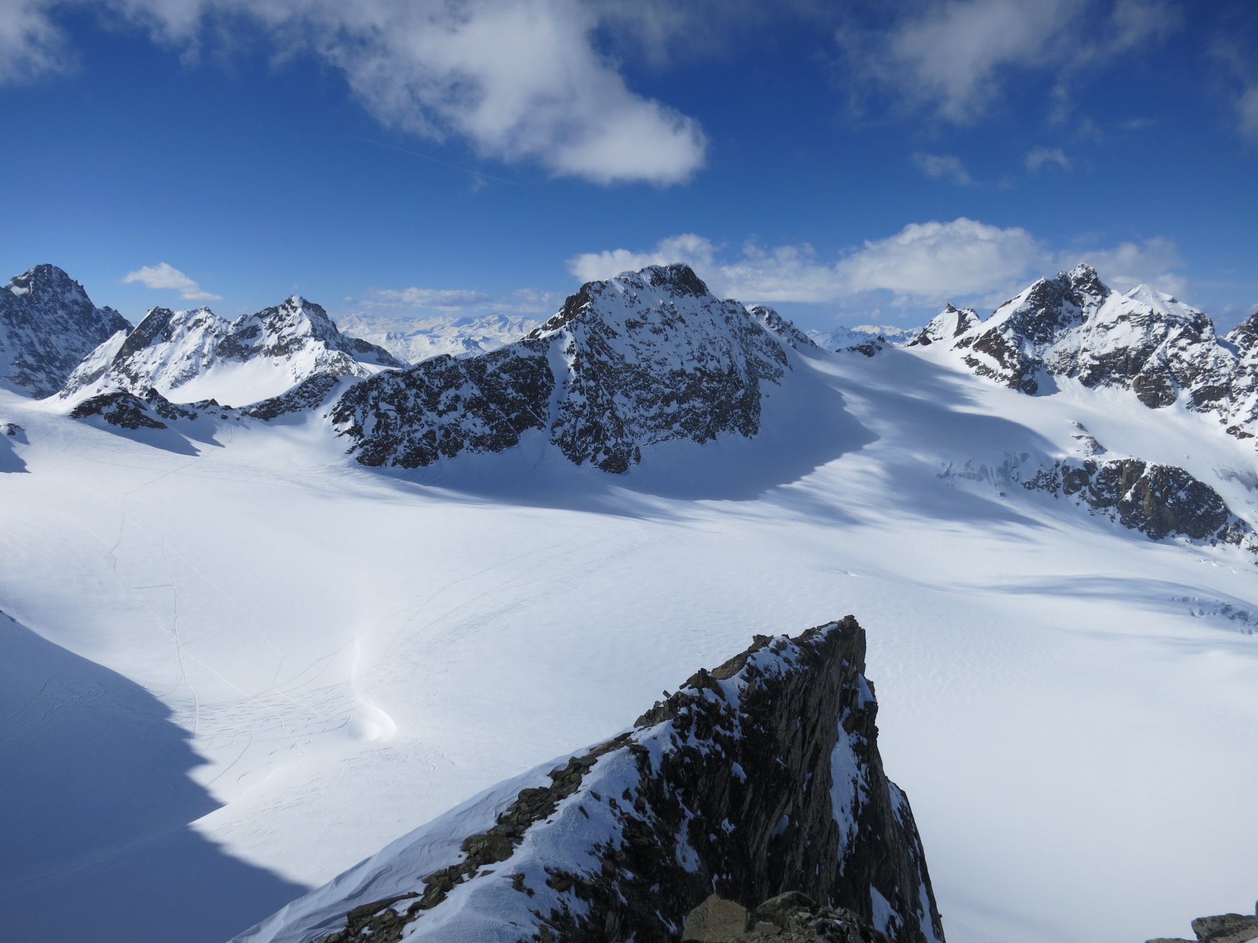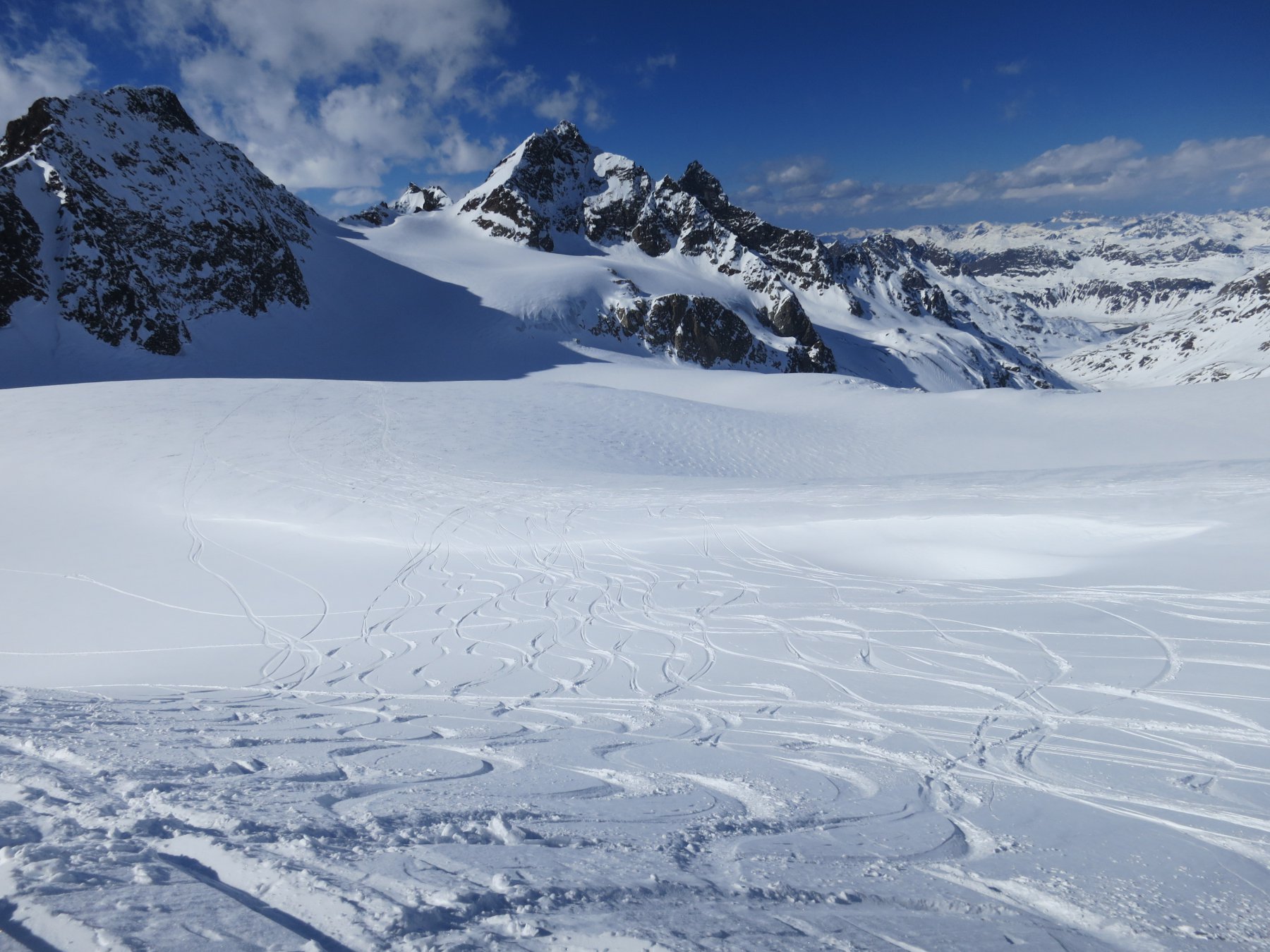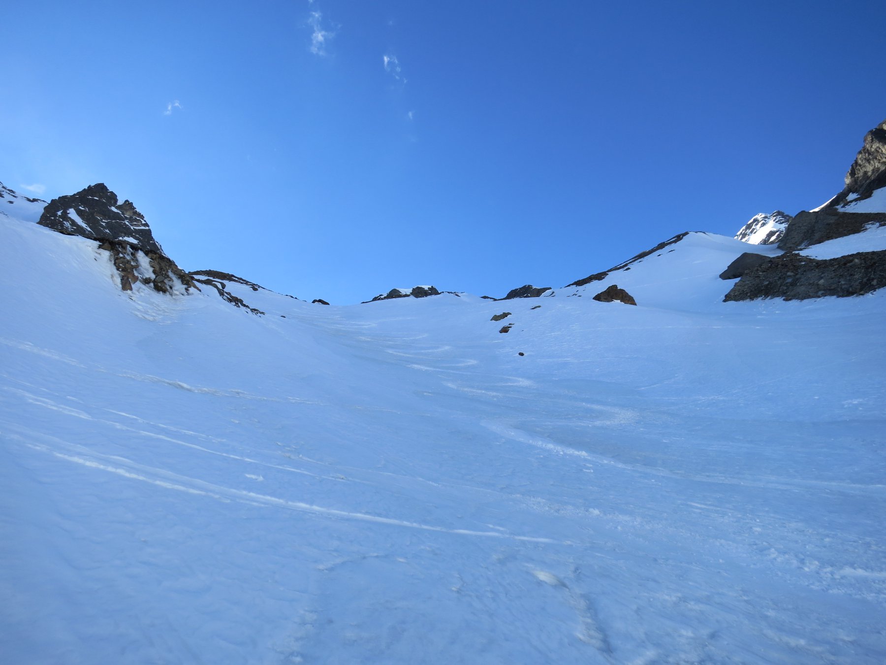 Risalita il giorno dopo su ripidi pendii aggirando la vetta in senso antiorario. Passaggio tecnico di discesa sul confine con l’Austria.