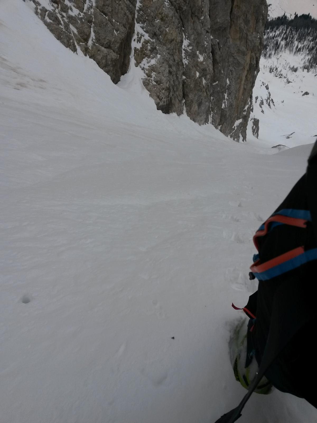 Arrivo alla base del canale pensando di averla imbroccata, vista la neve morbida che ci trovo.