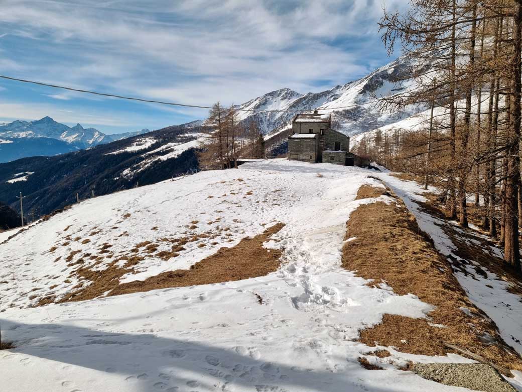 Giunti al termine dell’alta bastionata si arriva alla Cappella di By dove si devia a destra per raggiungere la storica Casa Farinet; da questa ci si dirige verso le vicine paline segnaletiche e si svolta a sinistra continuando su un traverso che aggira un basso costone da cui si vede l’alpeggio che in pochi minuti si raggiunge.