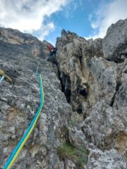 - L7 IV- (50-60m) Seguire la cengia in traverso sinistro per circa 7-8 metri, poi iniziare a salire in verticale in direzione di un caminetto/fessura che dopo alcuni metri sbuca in cresta. Sosta su spuntone da allestire.
