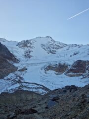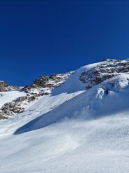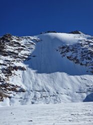 Superato il grosso crepaccio (meglio fare sicura con chiodi) si risale la parete nella parte più ripida circa 50° fino ad uscire poco sotto la vetta sulla sua spalla di nord-est. Qui per facile percorso e qualche roccetta si giunge in cima.