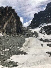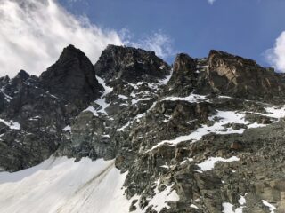 Canalino dietro al Gagliardone con lingue di neve evitabili. Sopra si alternano nevai e pietraie. La neve agevola sia la salita che la discesa (anche se mollava un po’), non sono necessari ramponi. Parte alpinistica pulita. Percorsa la cresta da sinistra verso destra toccando le prime 4 cadreghe, scendendo dall’itinerario descritto per la salita (ometti).
