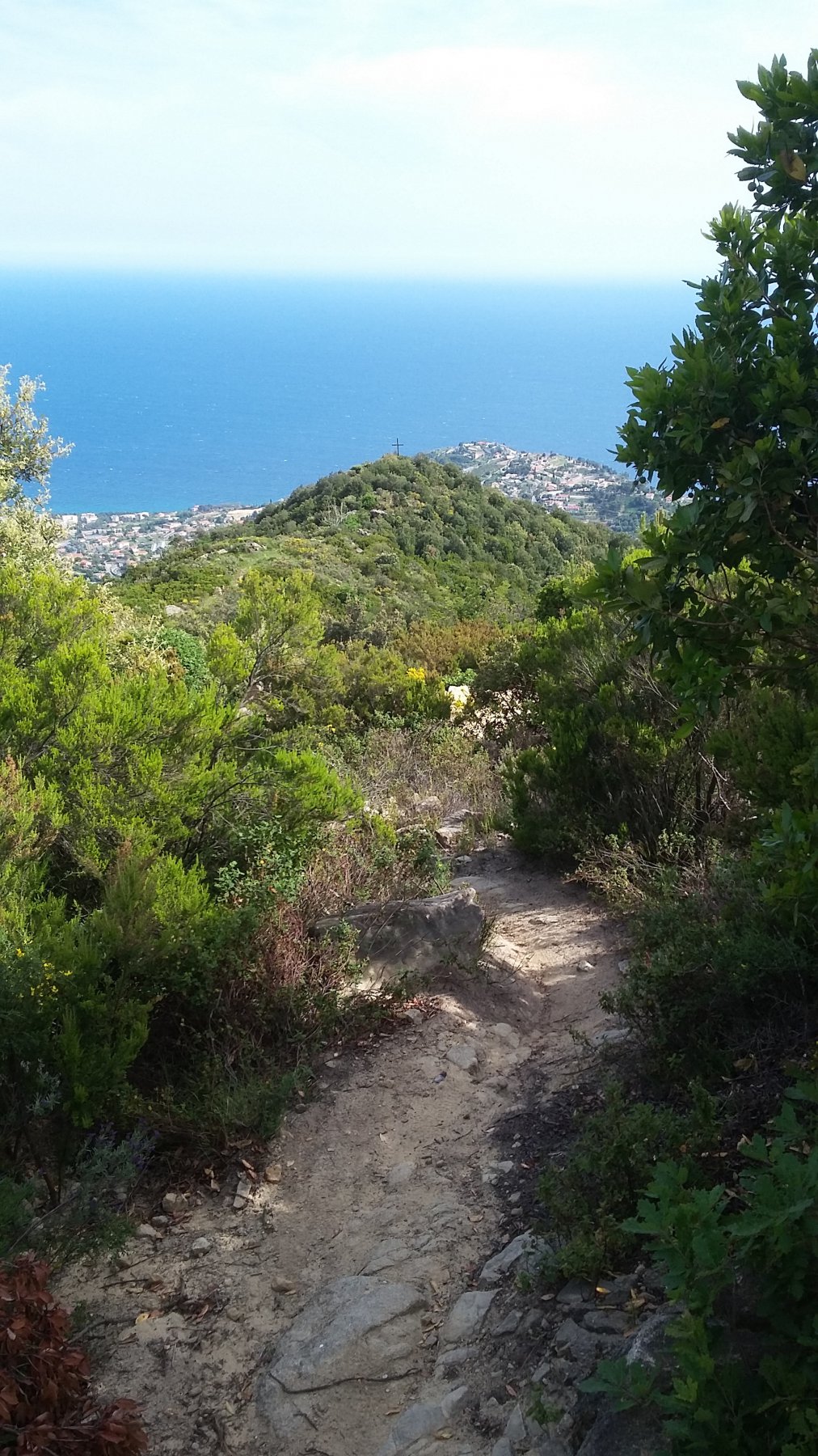 Arrivati ad una Madonnina bianca si sale a destra fino davanti un cancello dove a sinistra parte una stradina erbosa. La si segue fino a quando diventa mulattiera e si continua in mezzo alla macchia mediterranea fino ad arrivare nei pressi di una croce di ferro, Croce Padre Poggi mt.571.