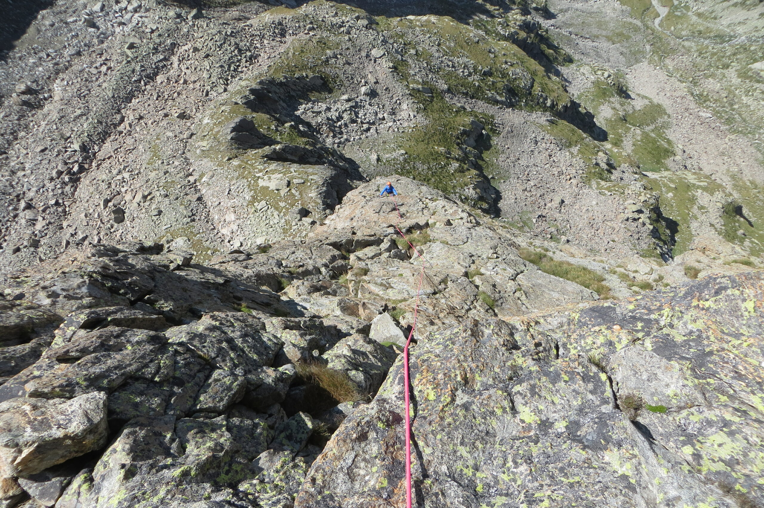 Dal rifugio sentiero non evidentissimo: bisogna abbassarsi qualche metro (sentiero) e attraversare un rio su di un ponticello, oltre il quale bisogna subito girare a sx e non proseguire in discesa. Sentiero segnalato con ometti, abbastanza ripido e diretto. Attacco evidentissimo, presente un ch. nuovo sulla dx dello spigolo (di una via limitrofa). L1 prende sole dalle 9.30, L2 invece va al sole più tardi (pieno W). La via si segue abbastanza bene, gli unici dubbi possono venire su L3 (dove bisogna obliquare a sx, fix visibile dalla sosta) e L4, dove la sosta indicata in relazione non è visibilissima e spostata a sx: si può comunque proseguire fino alla sosta con catena (45m). In questo modo (come abbiamo fatto noi) si supera la parete in 4 tiri e il resto può essere percorso comodamente in conserva. Quasi un peccato perché la roccia in parete è mozzafiato e il percorso vario ed interessante. L2 da antologia per questo genere di difficoltà. Traversata delle 4 cime invece non corta come parrebbe, roccia un po’ più da controllare.