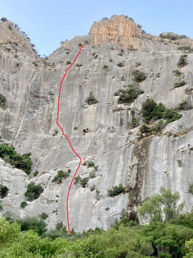 L1 segue la placca evidente con golfari datati, abbondanti. Roccia patinata a causa delle numerose ripetizioni, 5c. L2 traverso verso sinistra con golfari più diradati, 5a. Da qui, anziché proseguire diritto lungo i chimici nuovi di “Deutsche Wall”, si va a sinistra lungo i 3 fix visibili, e si traversa poi decisamente a sinistra (sprotetto) aggirando il vago spigolo. Roccia lavoratissima ma chiodi lontani (possibilità di integrare). Seguire i fix su roccia splendida e tagliente, 50 metri, 6a+. L4 5c su placca. Dalla sosta finale possibilità di proseguire a destra su Deutsche wall, 6b e 6b+, fix.